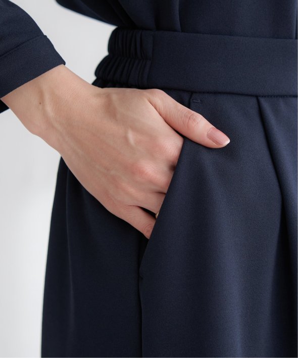 ボトムスはシルエットが出にくいワイド型を採用。ウエストはゴム仕様で快適さも追求しました。