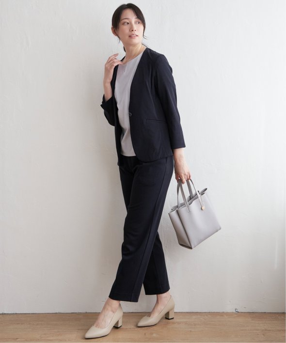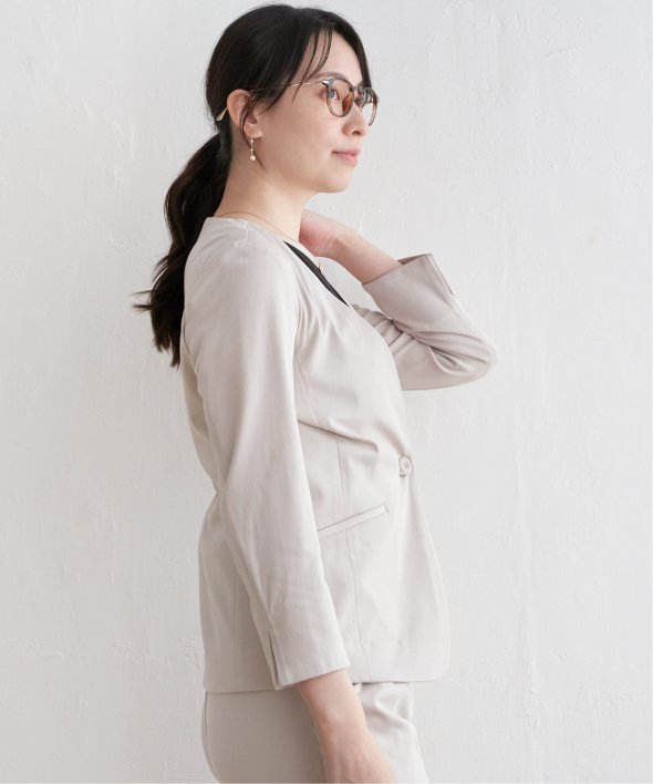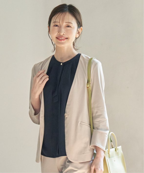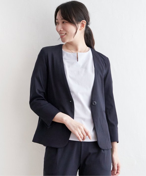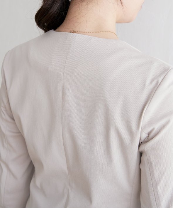 ノーカラー&Vネックですっきり着用できるジャケット。