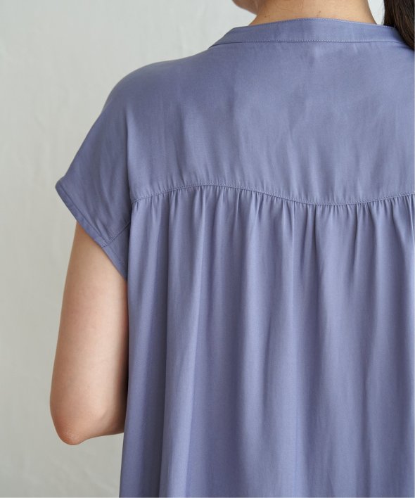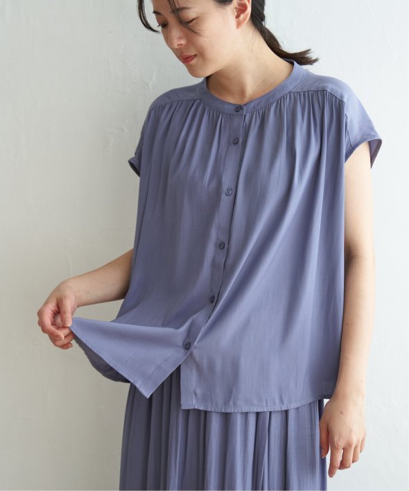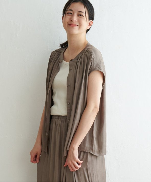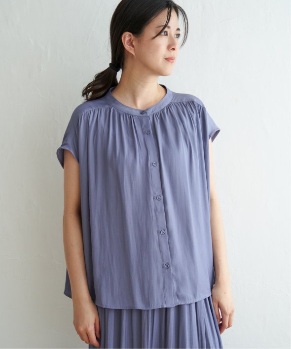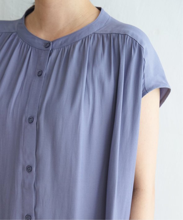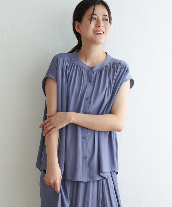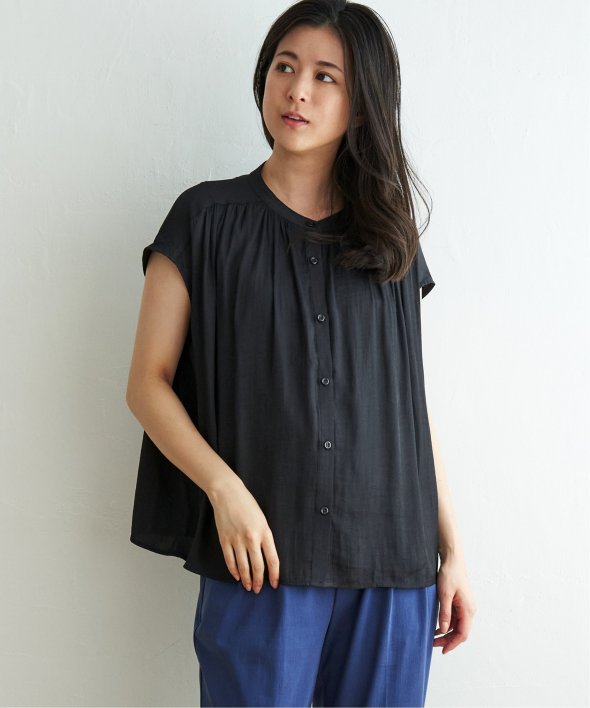 肩まわりをカバーしたフレンチスリーブとたっぷり入ったギャザーが可愛い前開きシャツブラウス。