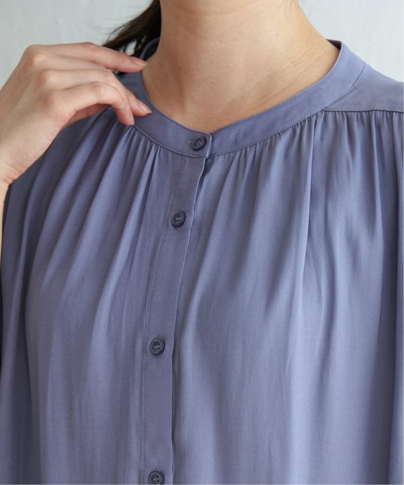 肩まわりにギャザーをたっぷり入れることで、顔まわりが華やかで立体感のあるシルエットのシャツブラウス。