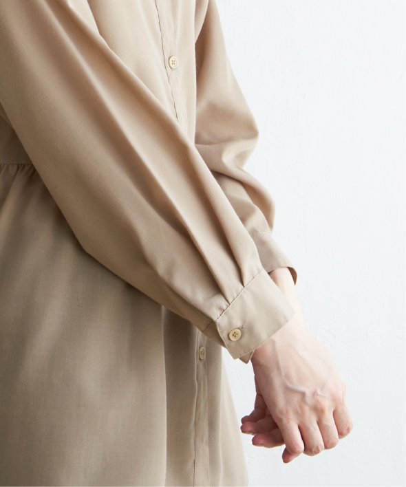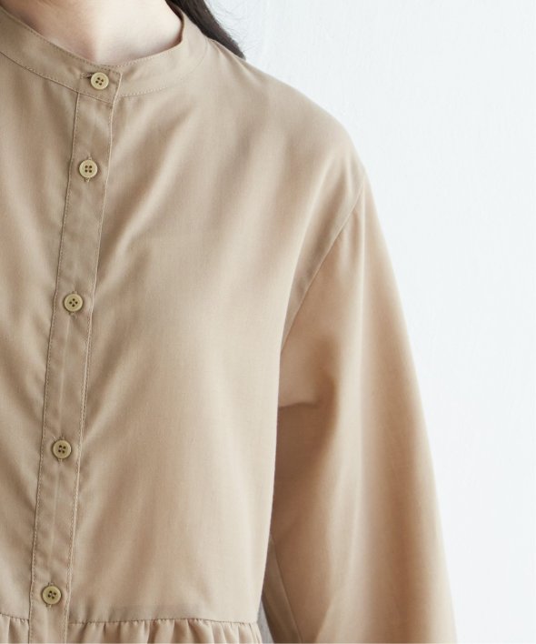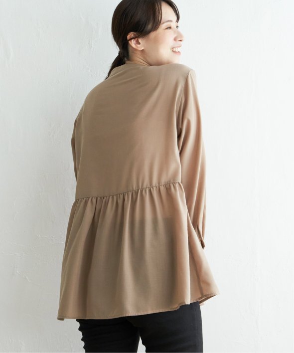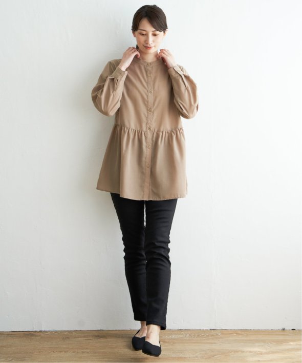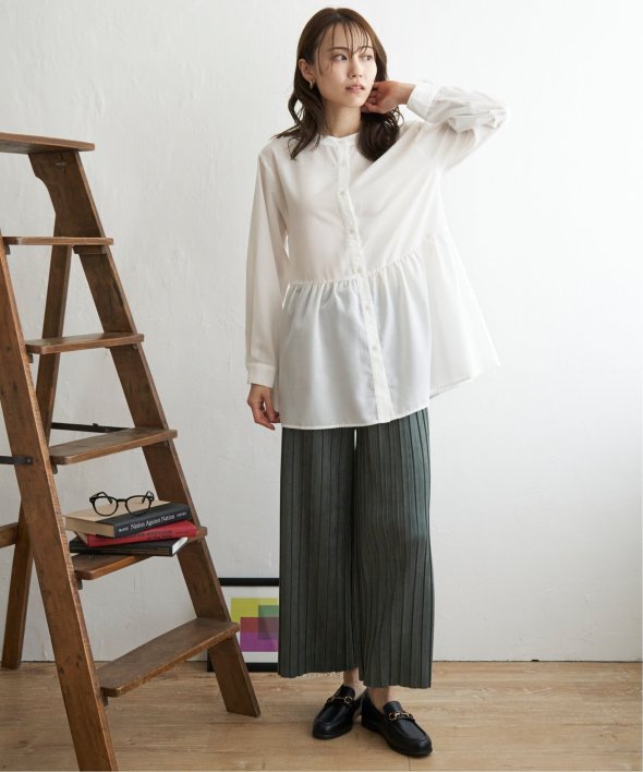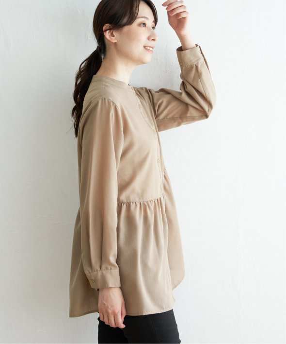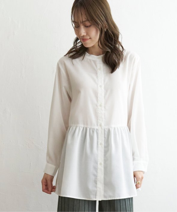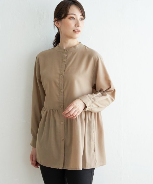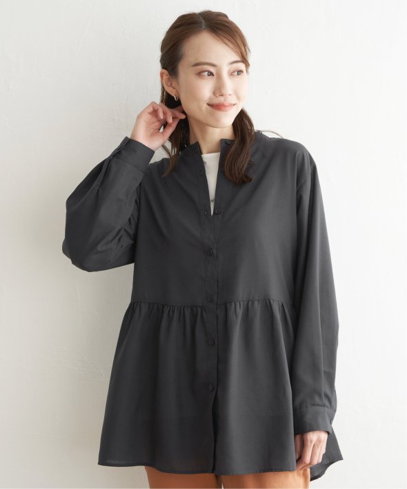 ウェストギャザー切り替えで、一枚でもレーヤードにも使えるシャツブラウスです。