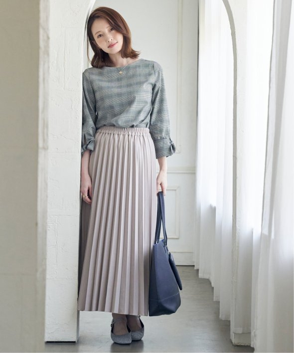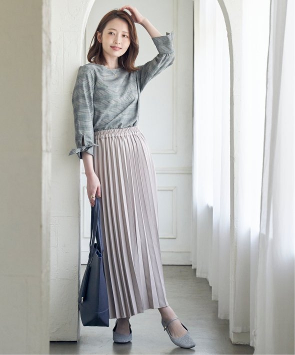 プリーツスカートやフレアスカートにはトップスインで着るとバランス良くまとまります。