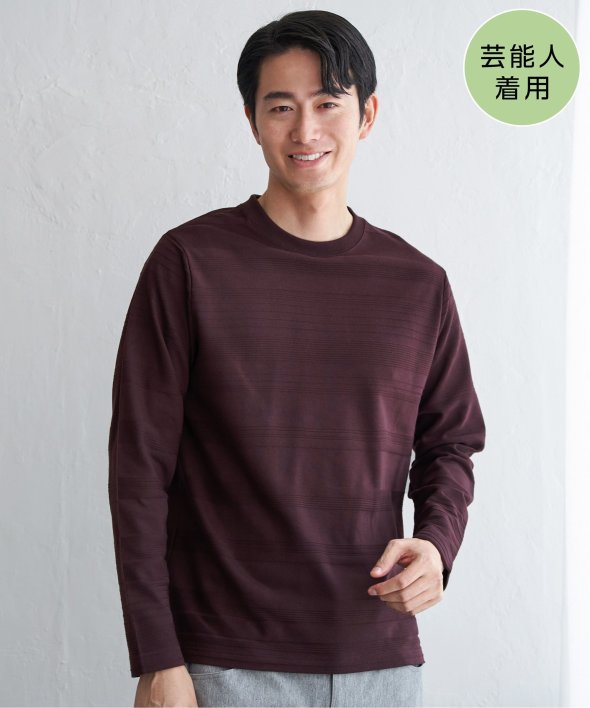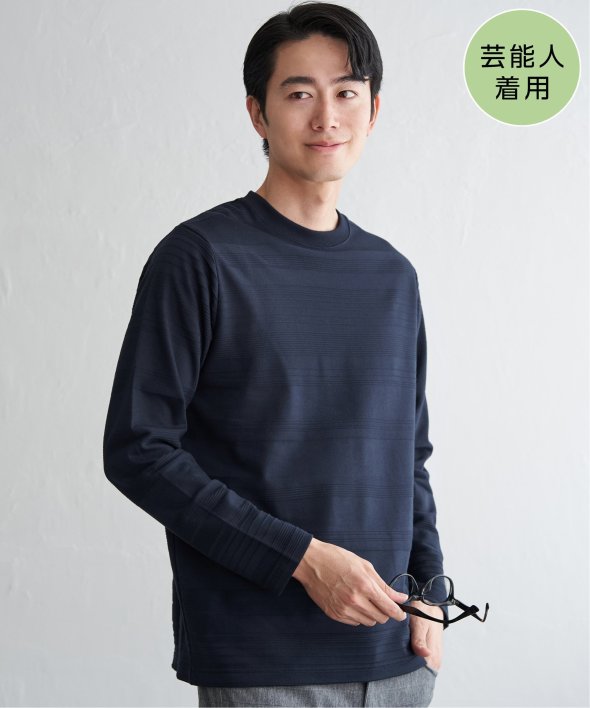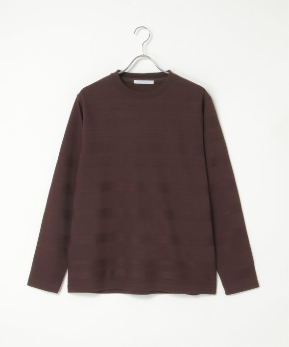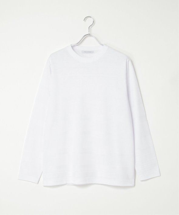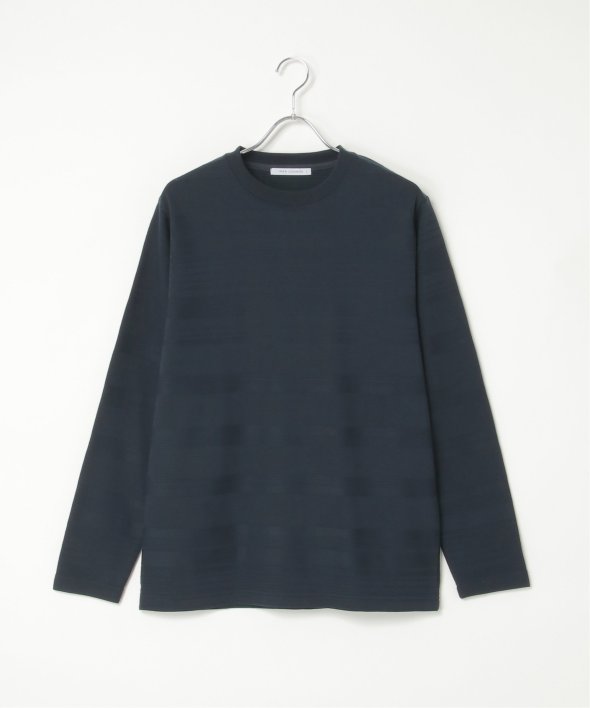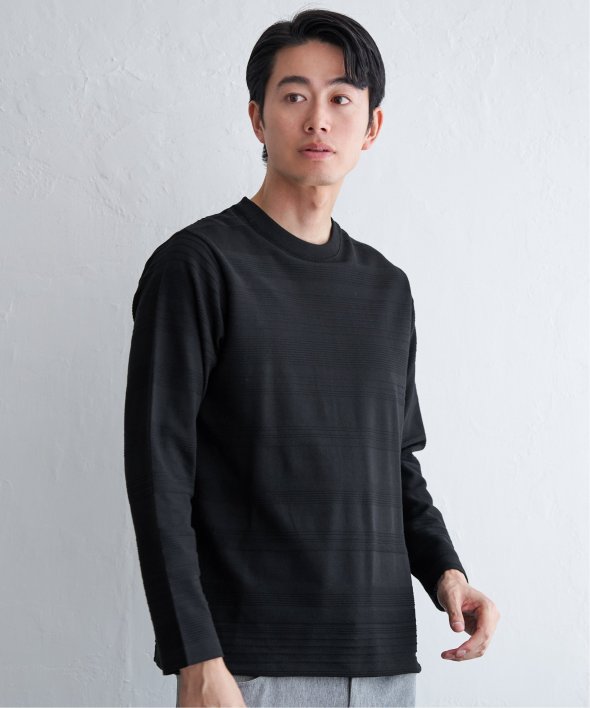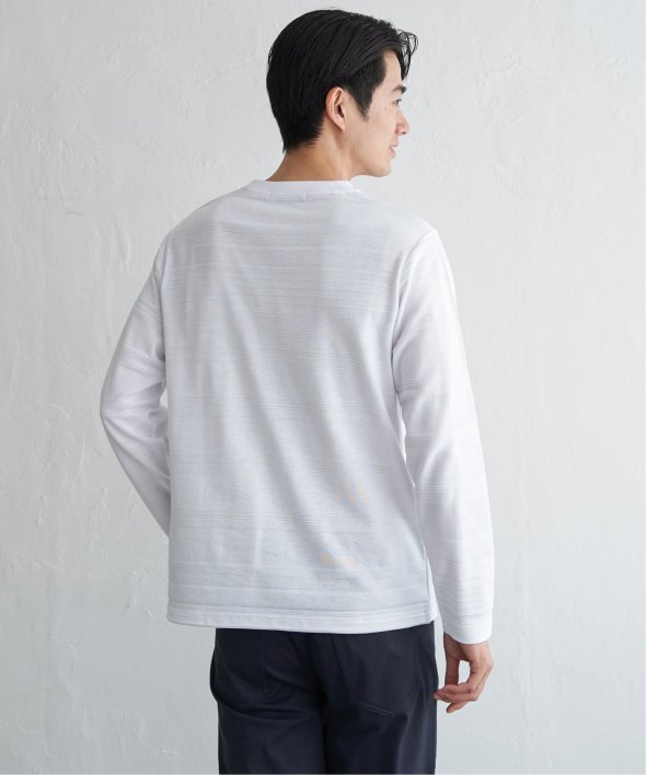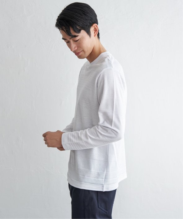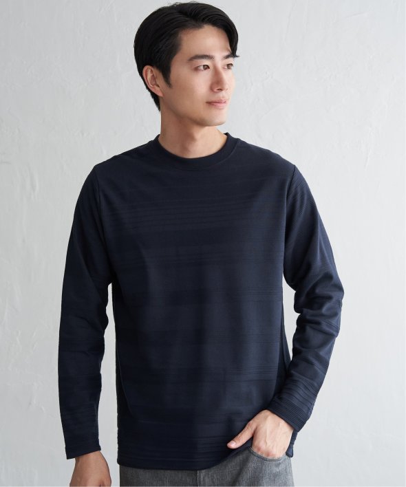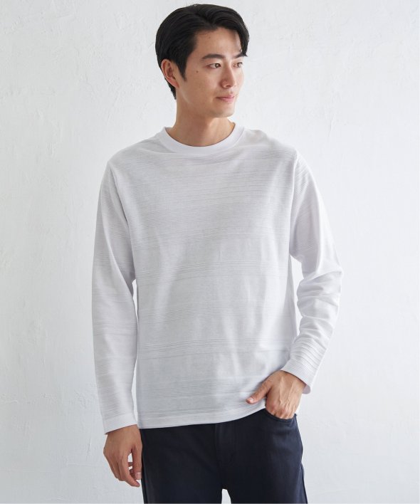 シンプルな長袖のクルーネックTシャツですが、生地の表面に凹凸のある地柄のランダムボーダーが特徴。