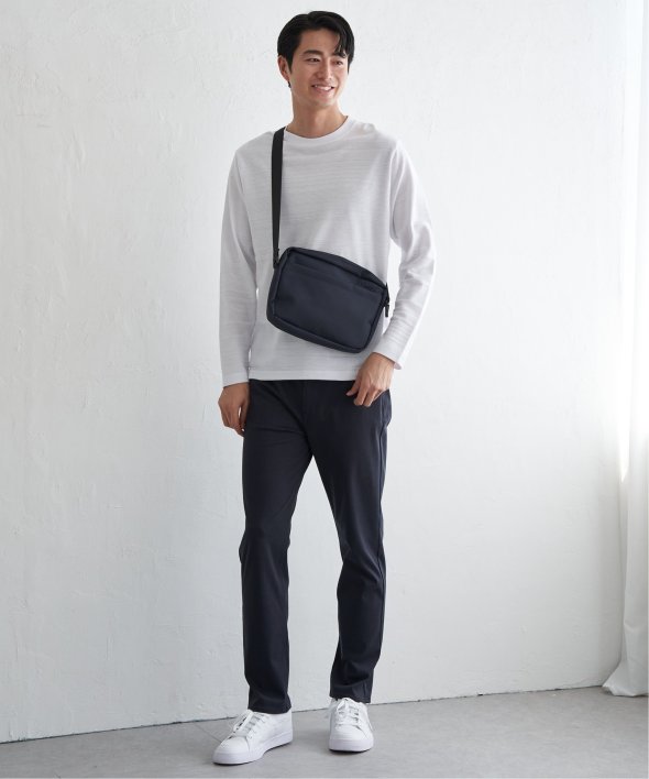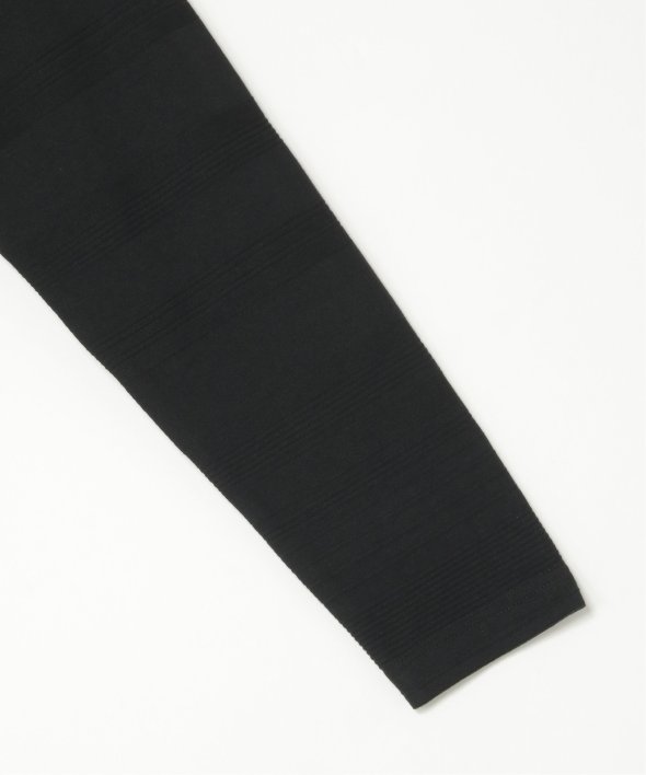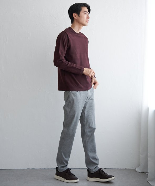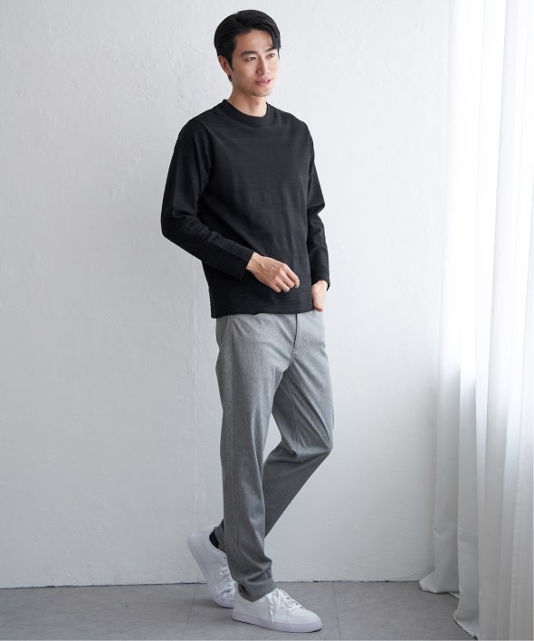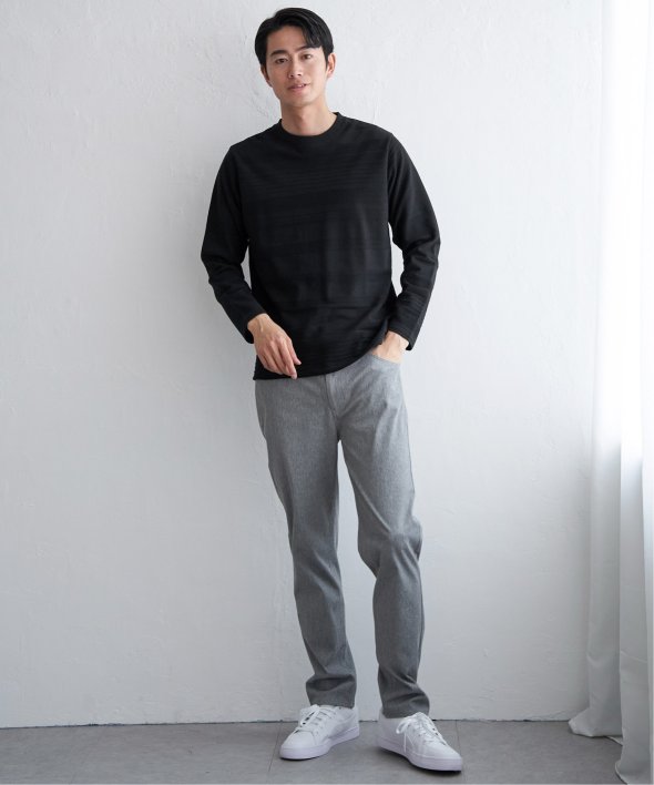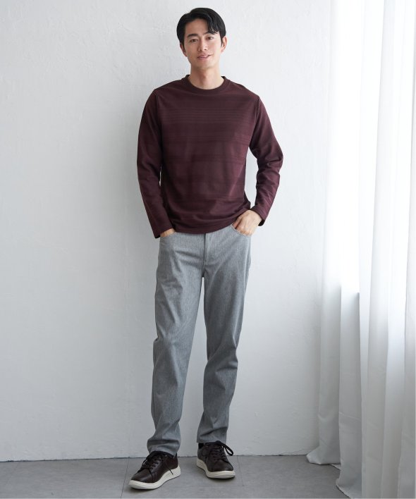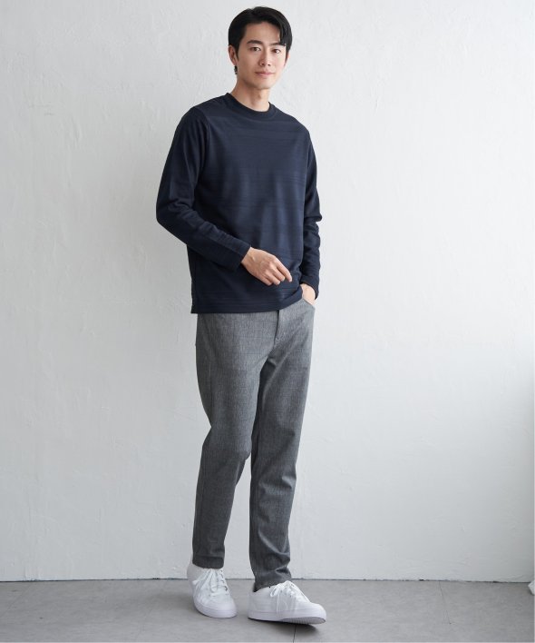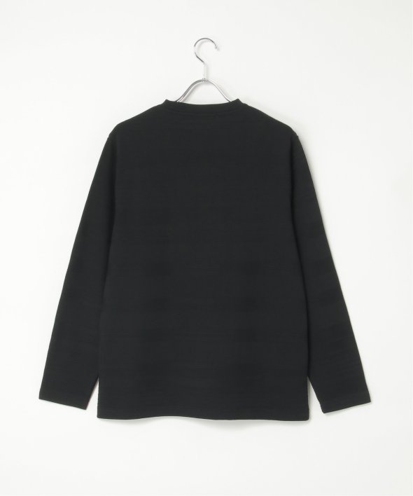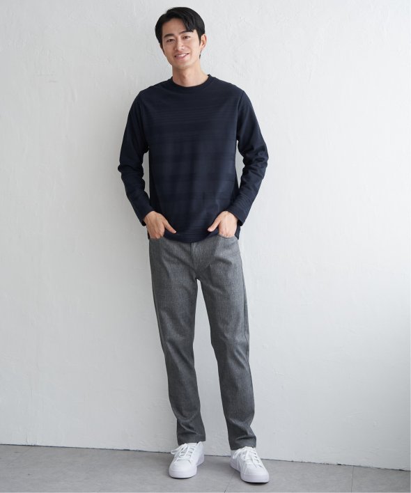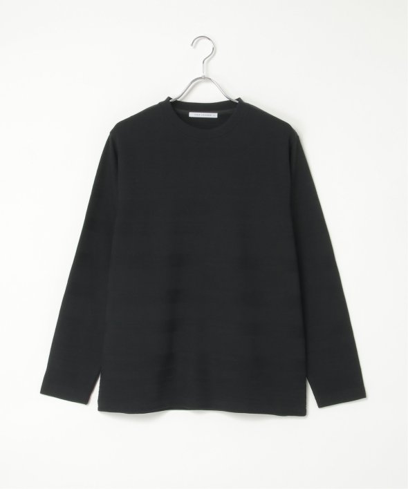 シンプルな長袖のクルーネックTシャツですが、生地の表面に凹凸のある地柄のランダムボーダーが特徴。