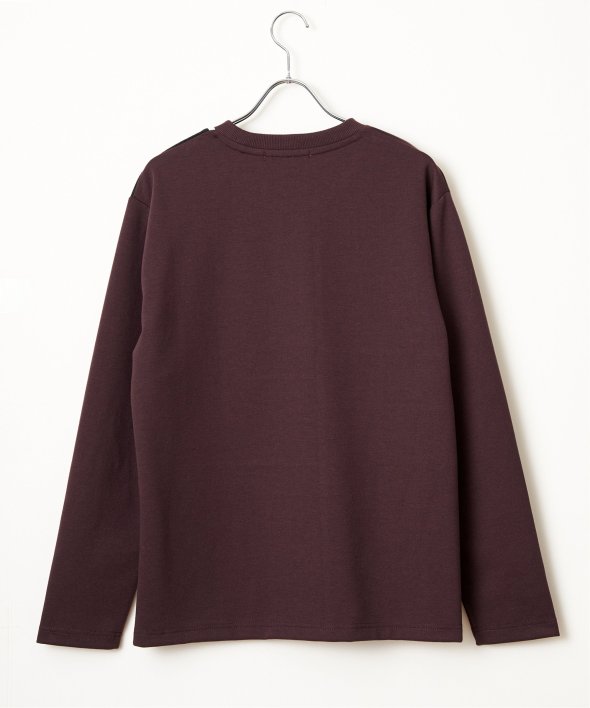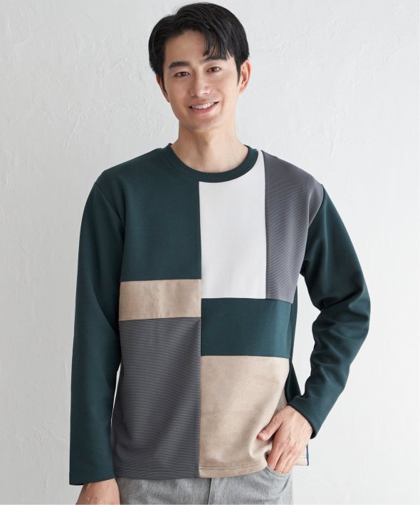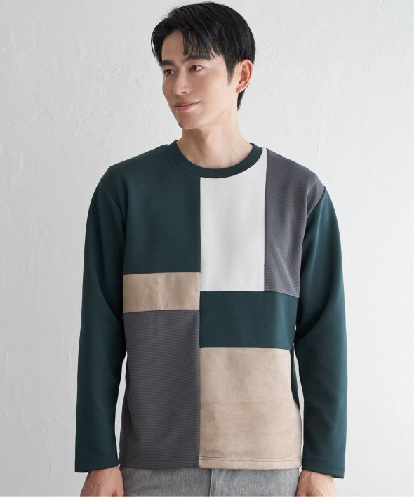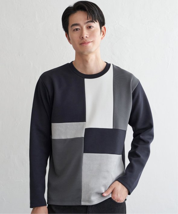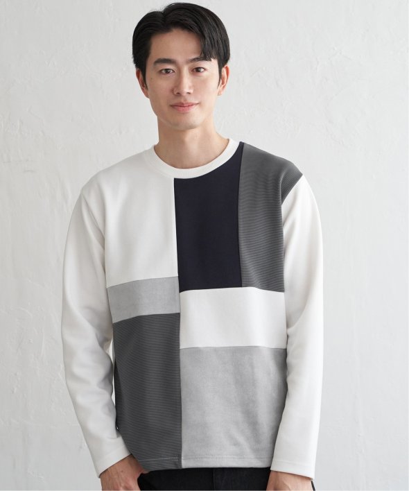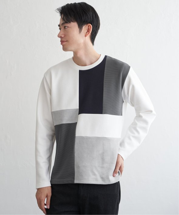 ダンボール生地をベースに、リップル・スエードという異素材で切り替えた「ブロックス」の長袖Tシャツ。