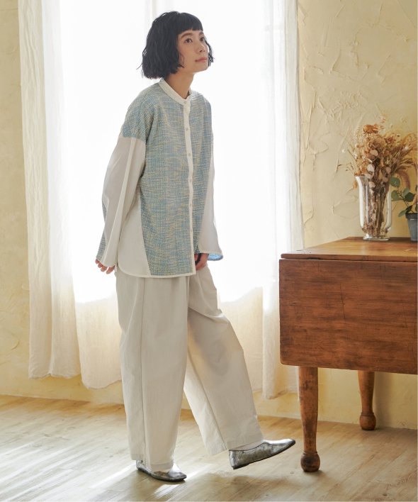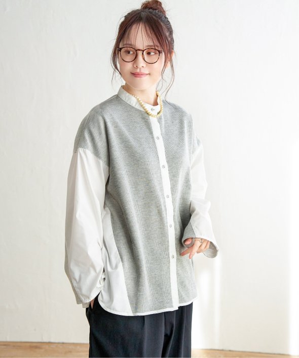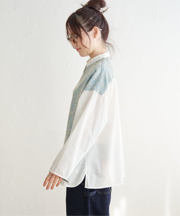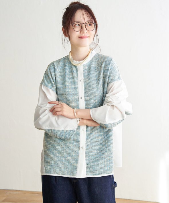 ツイード×白シャツ、またはワッフル×白シャツのユニークなコンビネーションが特徴のデザインシャツ。普段のコーディネートを格上げする、一枚で映えるアイテムです。【素材】ツイードと白シャツ・ワッフルと白シャツの異素材切り替え。【デザイン】バンドカラー。太めの袖幅でまくりやすいです。【ポイント】ツイードの見える切り替えの角度と、袖口をよりすっきり着やすく進化させました。羽織りとしてもブラウスとしても映える一枚です。当サイトの秋冬物商品の期間限定割引価格につきまして、秋冬物は基本的に4月10日以降は一定期間正価での販売価格に戻させて頂きます。あらかじめご了承くださいませ。