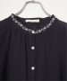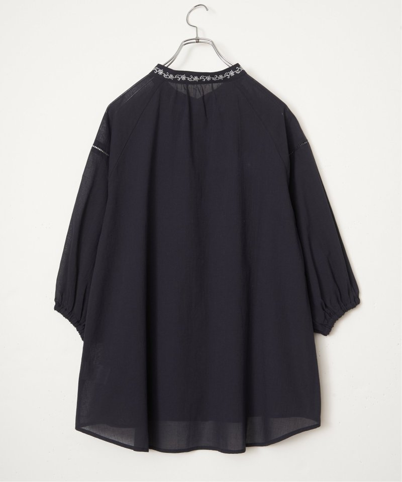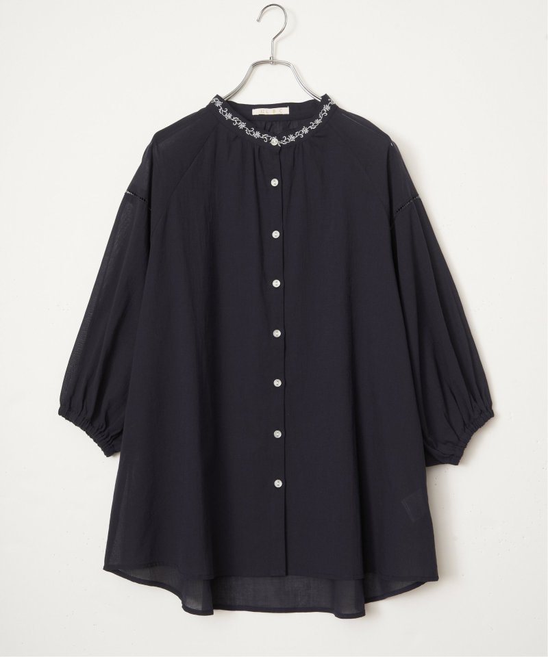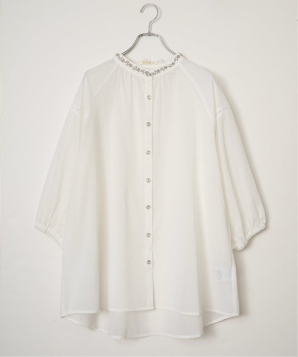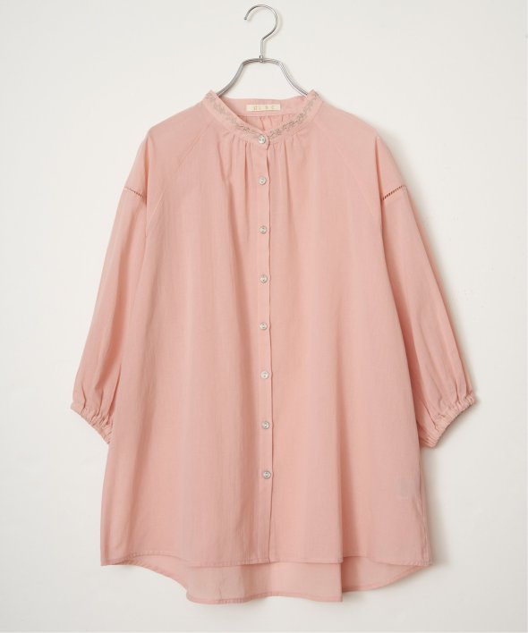 襟もとにオリジナル刺繍をあしらった、表情豊かなギャザーチュニック。やわらかなギャザーがふんわりと広がり、やさしい雰囲気のシルエットを演出します。【素材】ふんわり軽い綿混素材。【デザイン】前ボタン、チュニック丈。【ポイント】襟もとにオリジナル刺繍を施した、エクリュシリーズ春。肩にははしごレースを入れた、抜け感のあるチュニックです。ふんわりエスニック感ある一枚。デニムパンツとの相性も◎