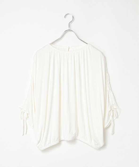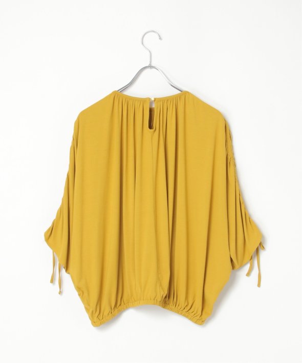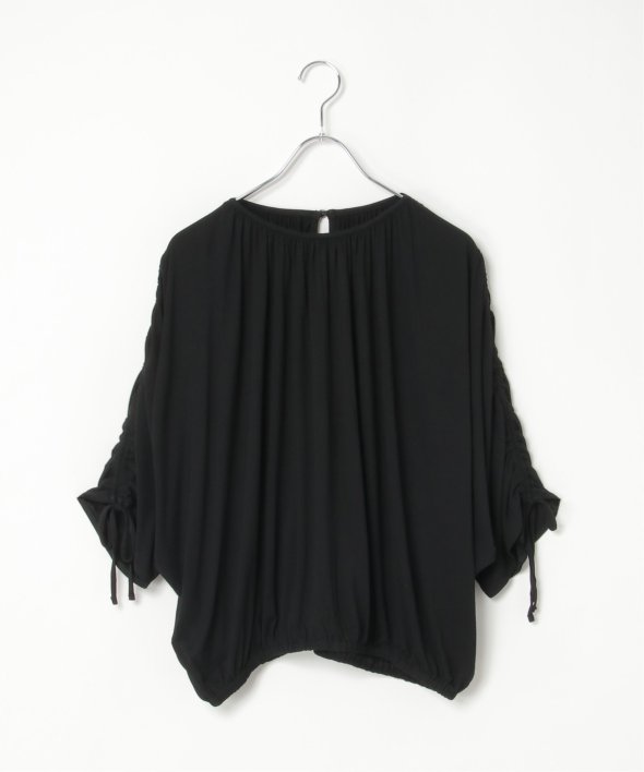 ドルマンスリーブでゆったり着ることができ、袖のシャーリングやリボンがアクセントになっています。