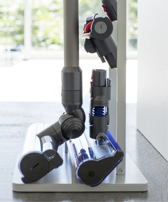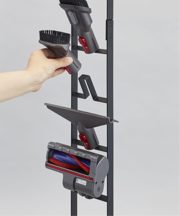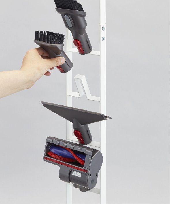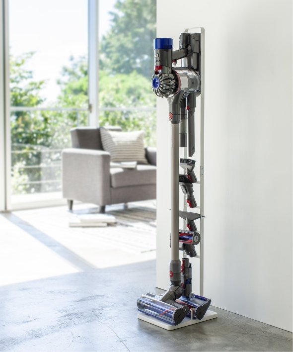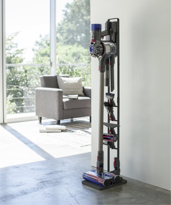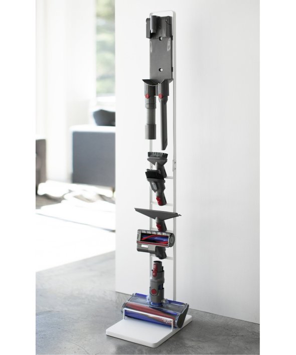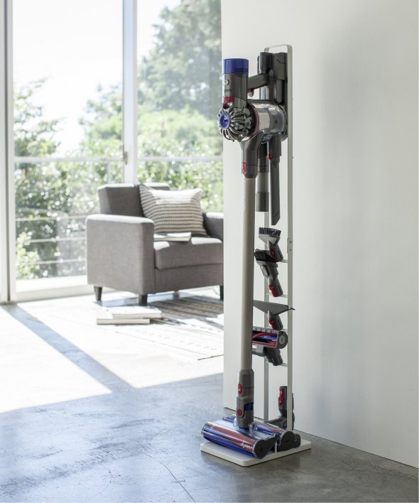 [アイテム説明]ダイソンのコードレスクリーナーをスリムに収納できるスタンド!ダイソンの収納用ブラケットをスタンド本体に取り付け収納できます。スタンドの背面から充電コードを通すことができるので、収納用ブラケットに差し込むだけで収納&充電が同時に可能。毎日使うものだから、気軽に取り出せるのは嬉しいポイント。掃除機アタッチメントは上向きについた4ヶ所のフック部分に差し込むだけで◎スチール部にはエコ素材を使用しています。山崎実業3540 3541