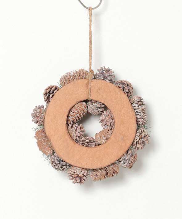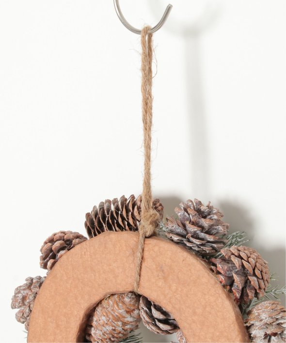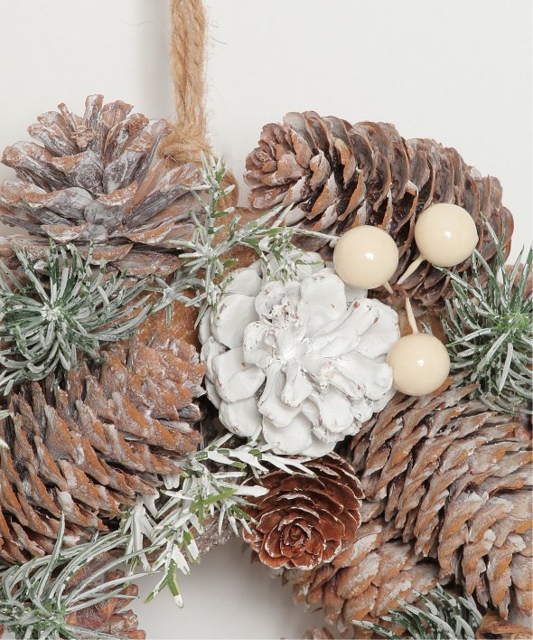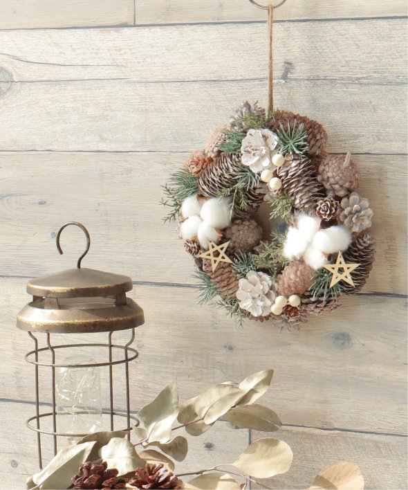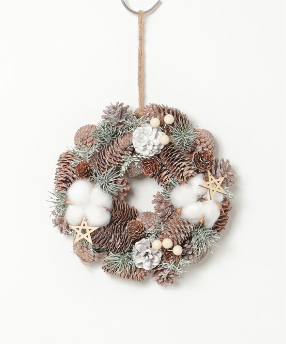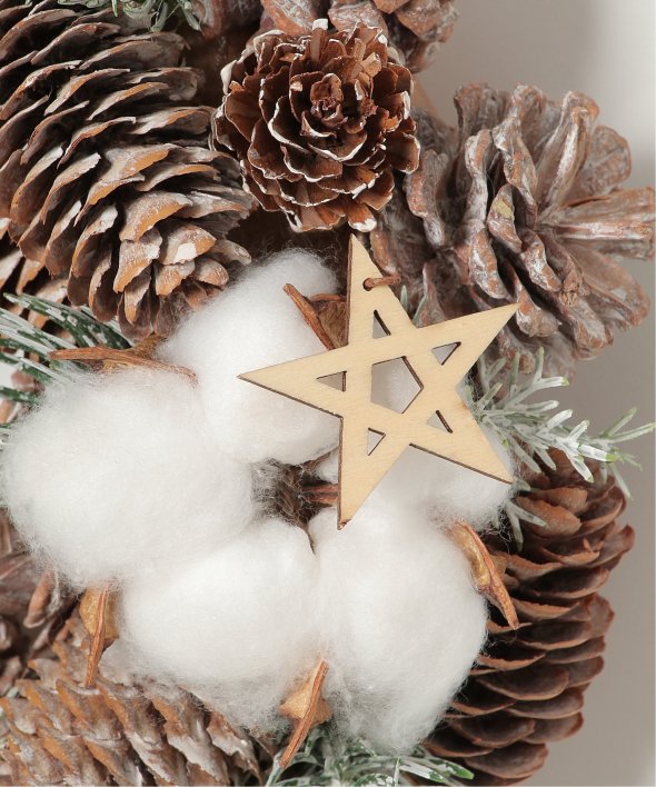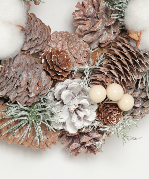 ふわふわの綿花や松ぼっくりを使用したリース。