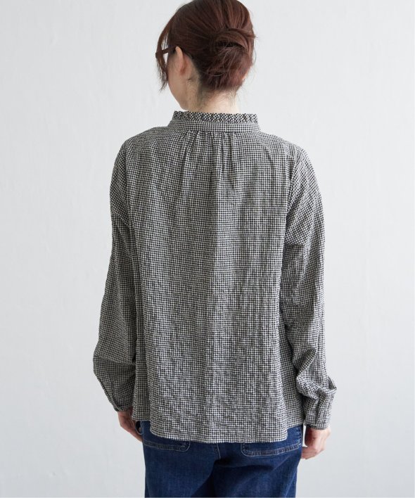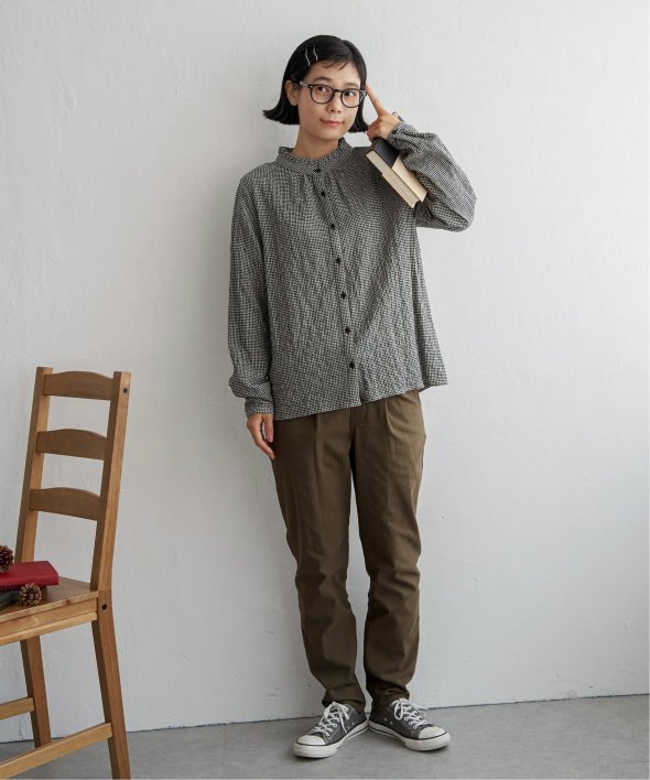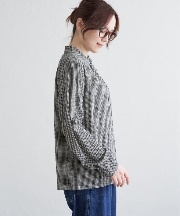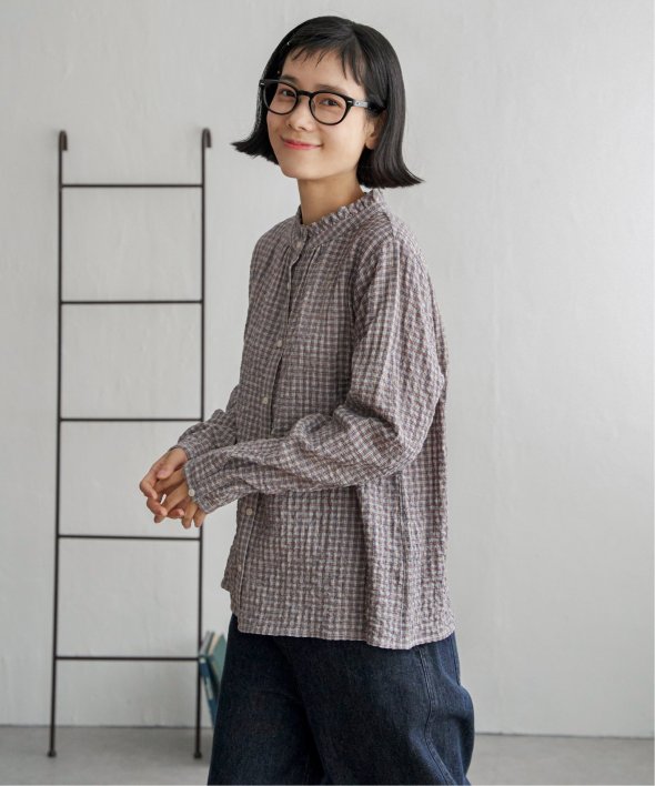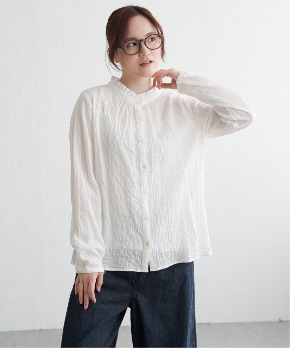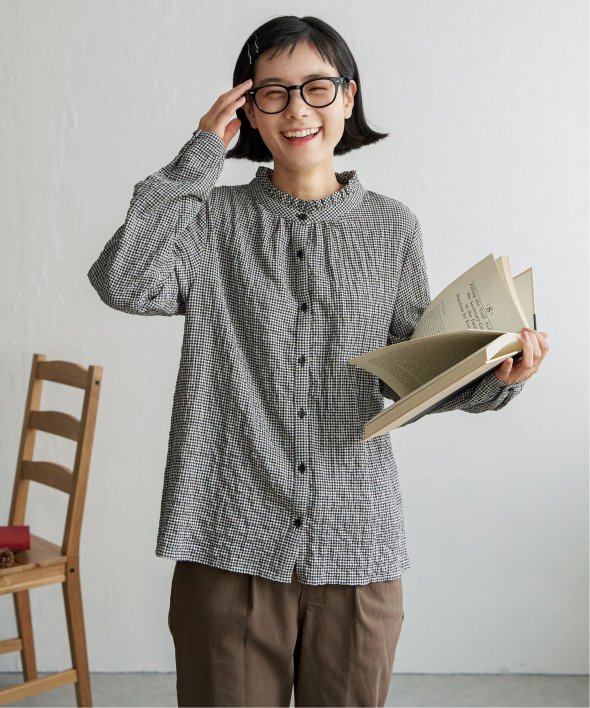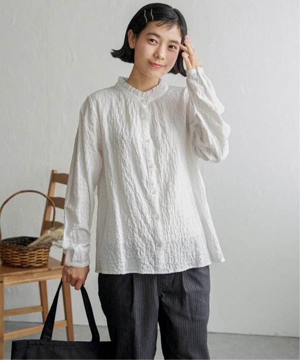 ロングシーズン活躍するコットン生地のブラウス。一枚でも、カーディガンやニットのインナーにも、マルチに活躍してくれます。【素材】オーガニックコットン使用。凹凸感のある生地です。【デザイン】襟フリルで、前開きデザイン。【ポイント】インでも羽織りでも活躍する前開きブラウス。柄ものも無地見えするような細かな柄域にして着やすくしています。秋を感じるようなクラシカルなカラー展開。お手入れもしやすいポコポコ素材です。