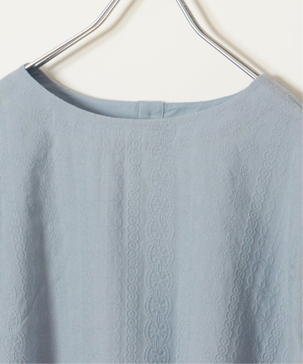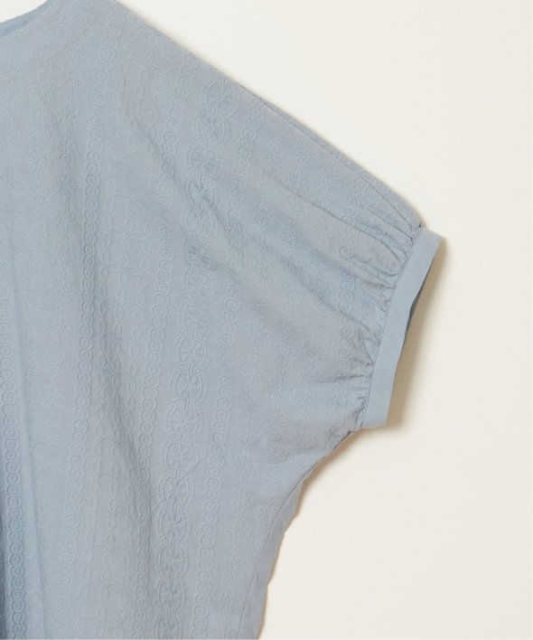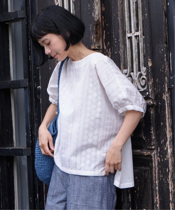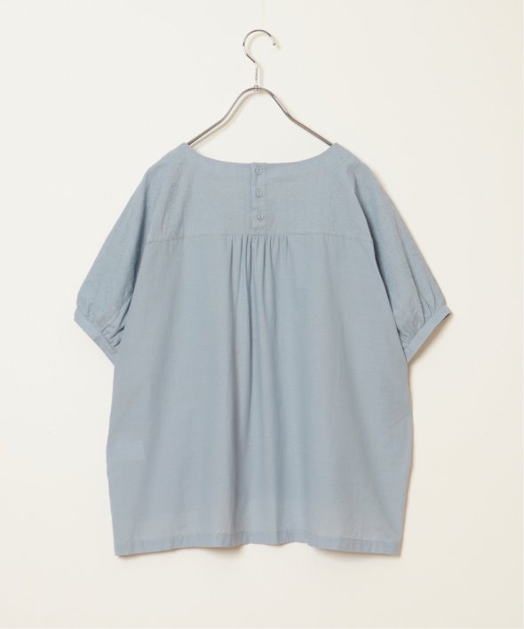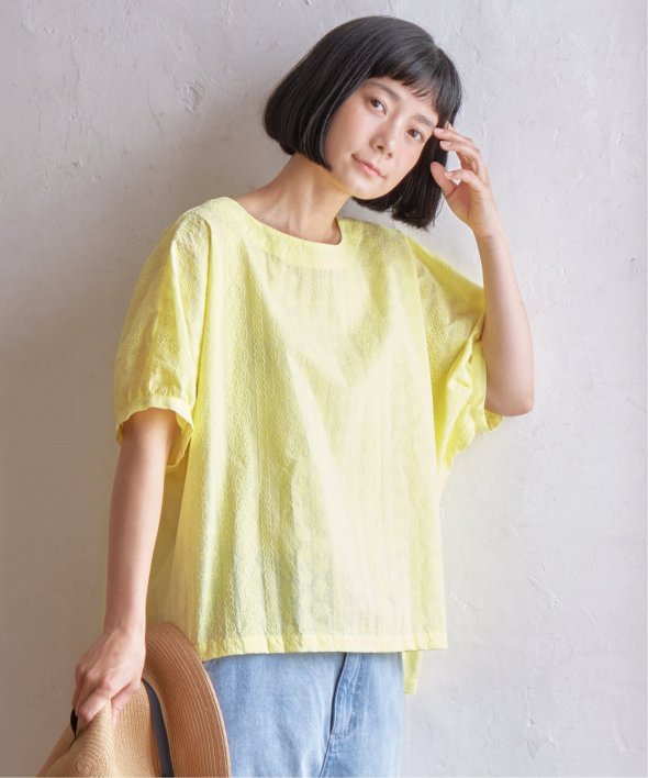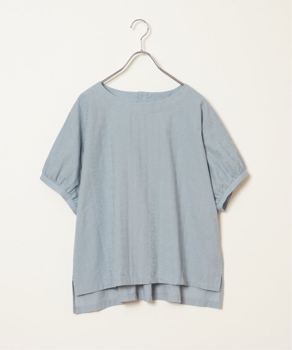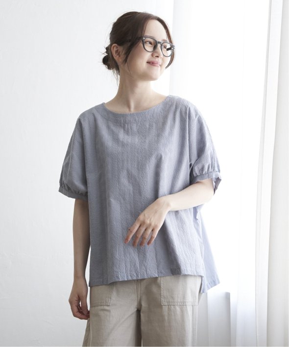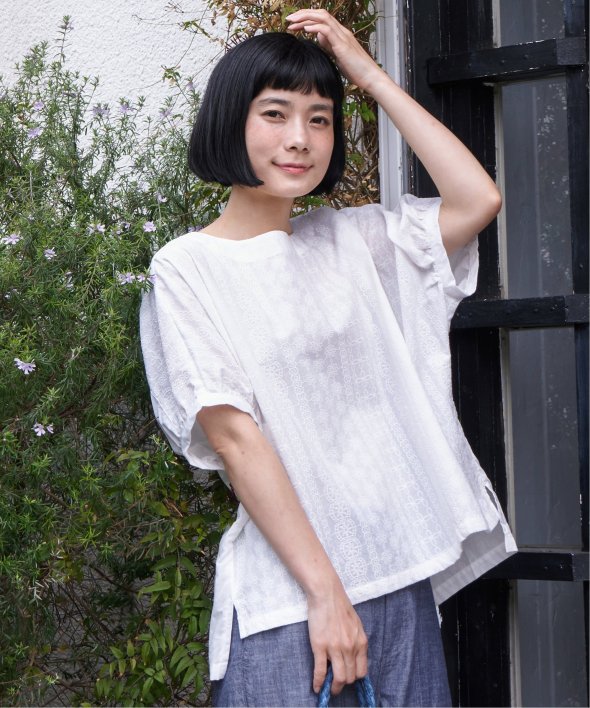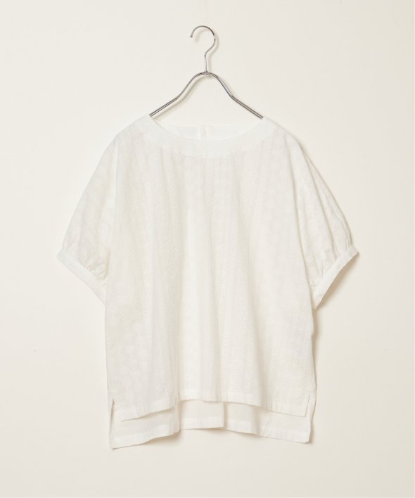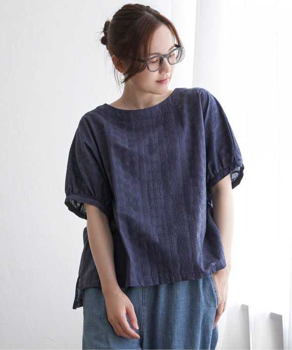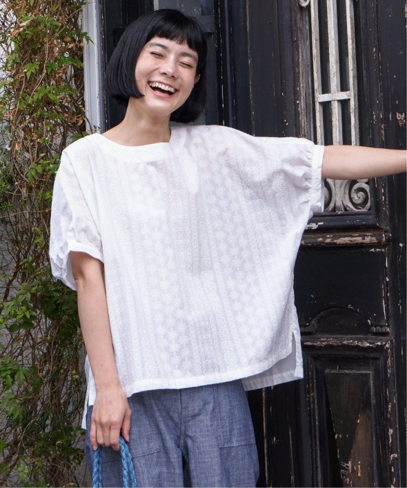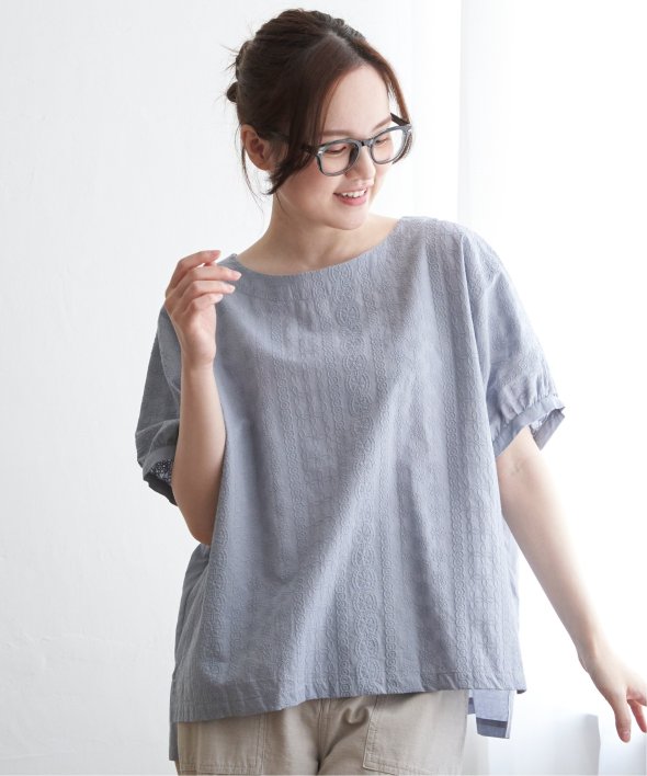 一見無地に見える、同色刺繍のブラウス。さらっとTシャツ感覚で気軽に着ていただけます。【素材】綿100%。【デザイン】ドルマン袖のゆったりブラウス。【ポイント】これまでの半袖からより優しい印象で、ゆったり着られるドルマンスリーブのシルエットにリニューアル。二の腕を優しく隠してくれるギャザー使いの袖です。