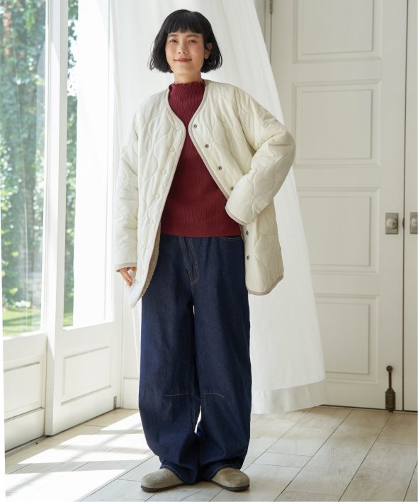 ゆったりとしたシルエットで、厚手のニットやレイヤードスタイルも快適に着用可能。