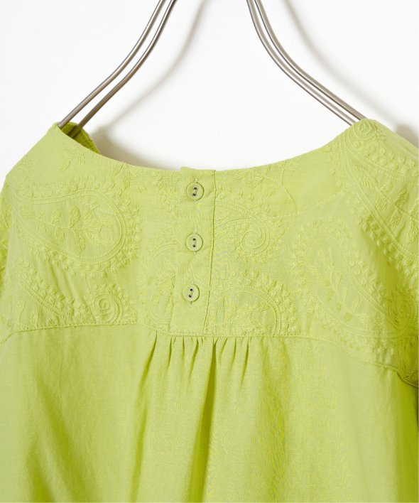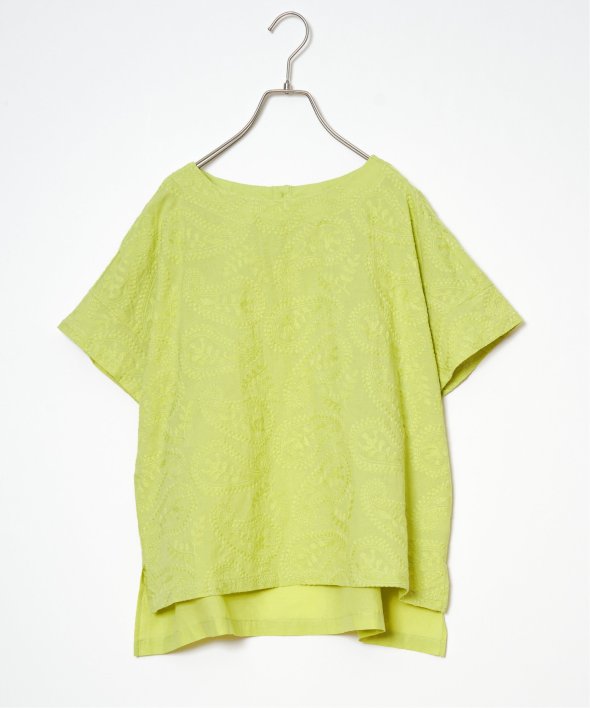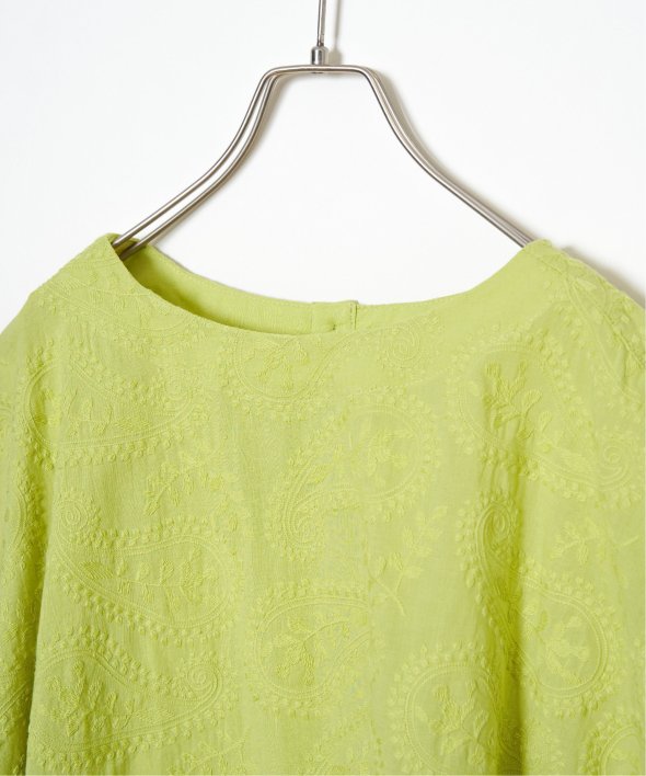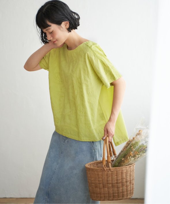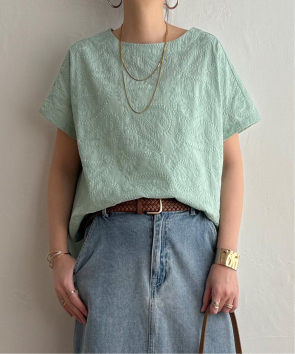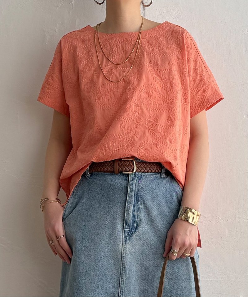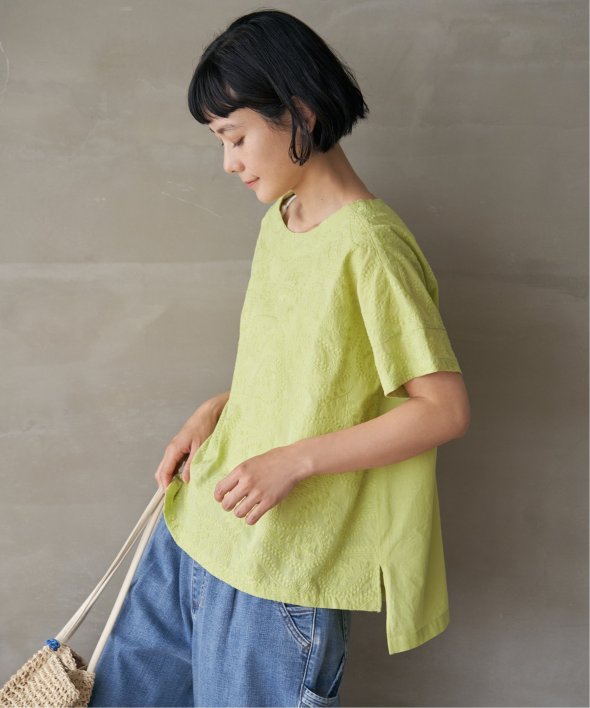 繊細なペイズリー刺繍を施した、上品なデザインのブラウス。身頃と同色の刺繍のため、遠目には無地のように見えながらも、近くで見るとさりげない立体感が楽しめる一枚です。前後差のある着丈がこなれたシルエットを生み、どんなボトムともバランスよくマッチ。【素材】綿100%【デザイン】前身頃に総刺繍を施した半袖ブラウス。【ポイント】繊細な総刺繍の LBC 初夏定番ブラウス。あまくなりすぎない人気のペイズリー柄刺繍がリバイバル!無地見えの刺繍が映える、明るいカラー展開にしています。
