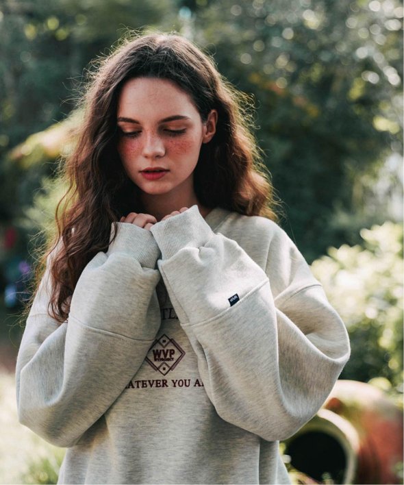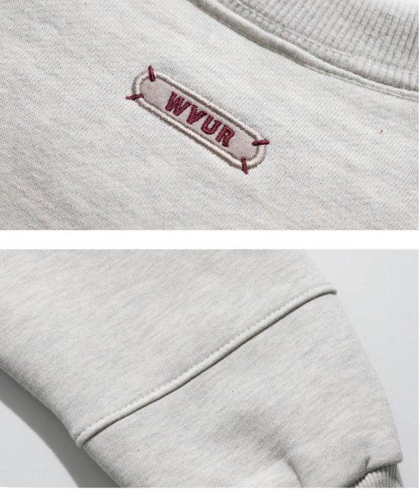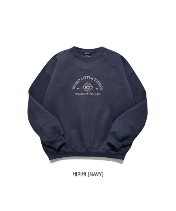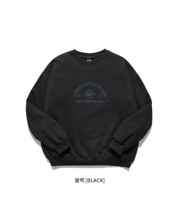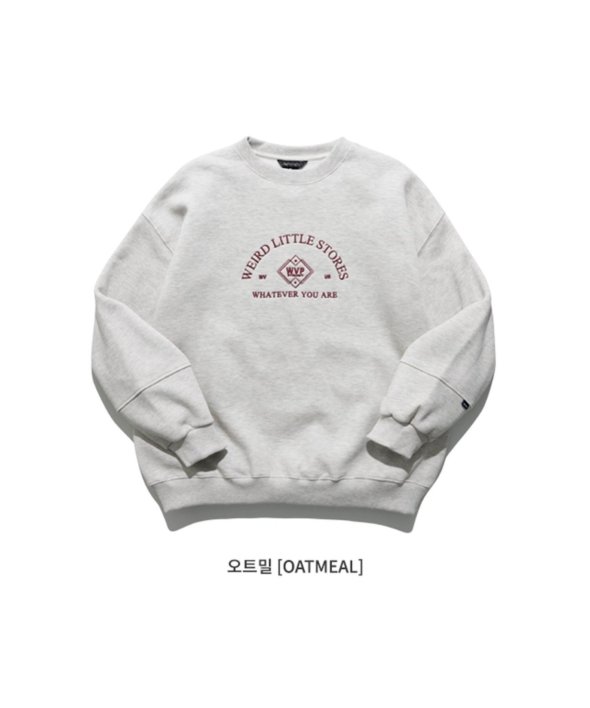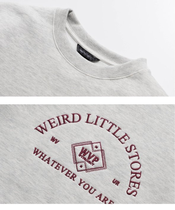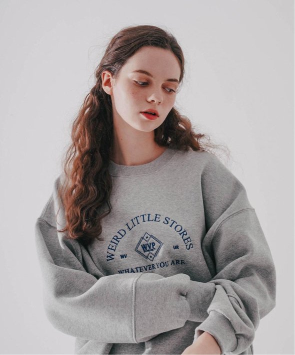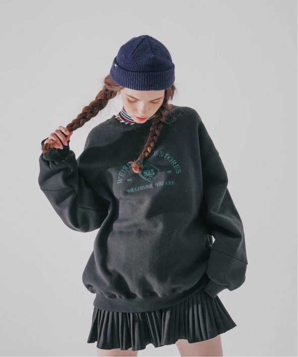まるで古着のようなデザインのロゴが刺繍されたスウェットシャツ。
