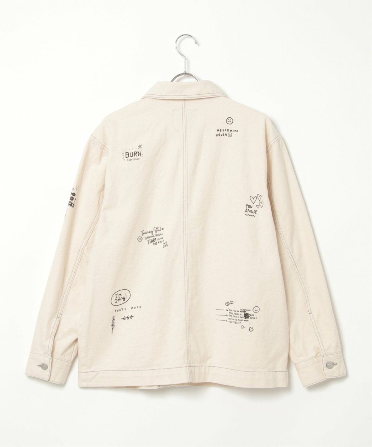 ラクガキのようなPOPなプリントがポイント ラクガキプリント デニムカバーオールジャケット