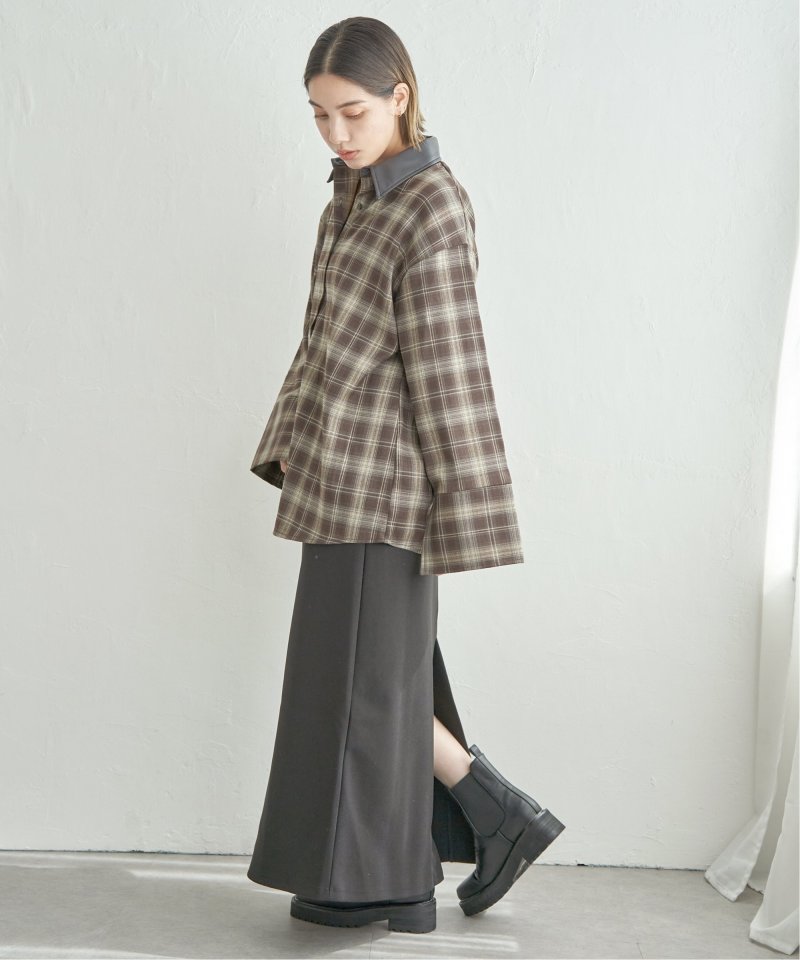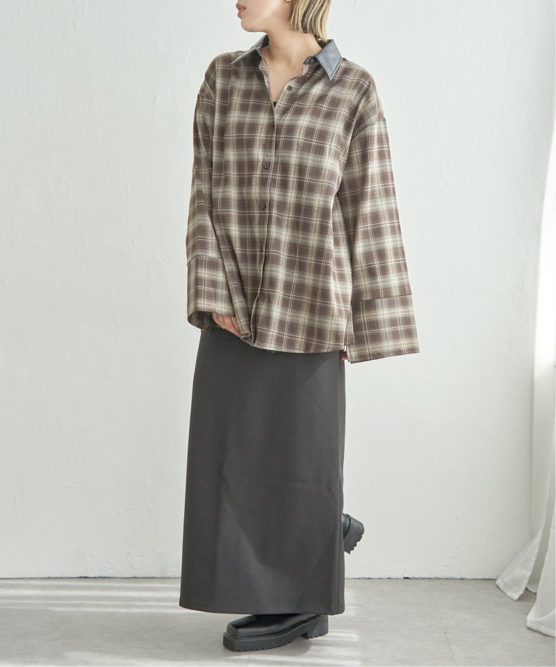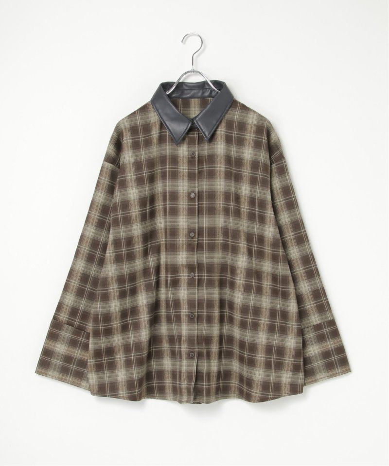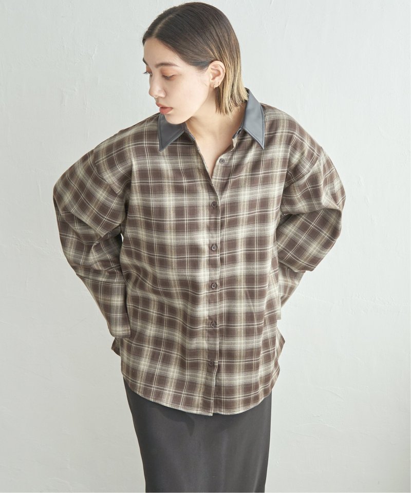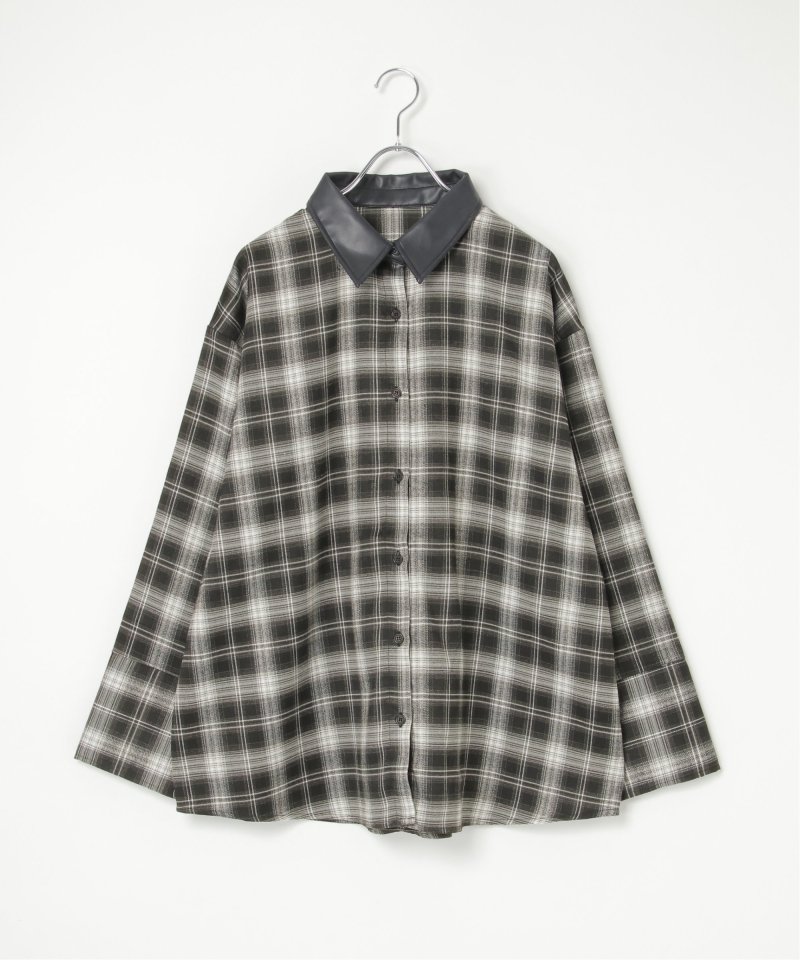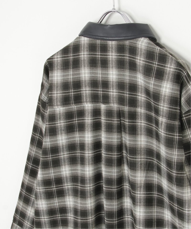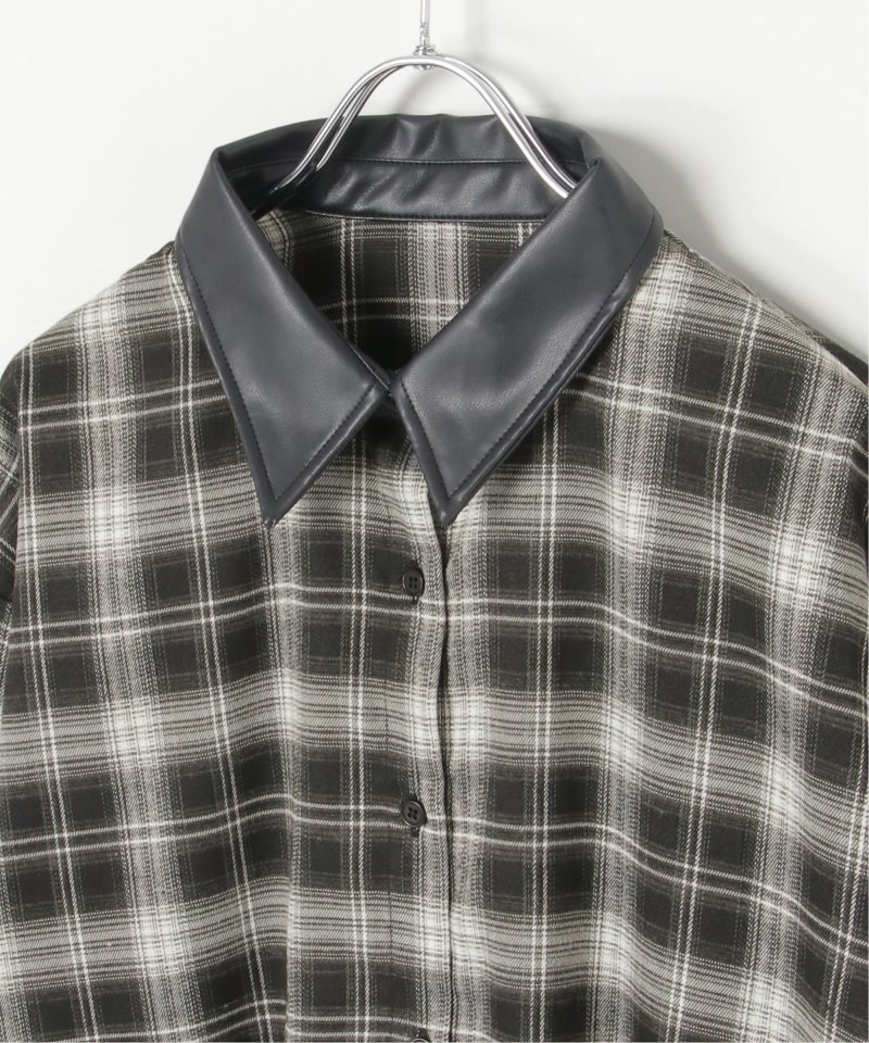 トラッドなチェック柄に合皮の襟を組み合わせた異素材デザインが新鮮なシャツ。
