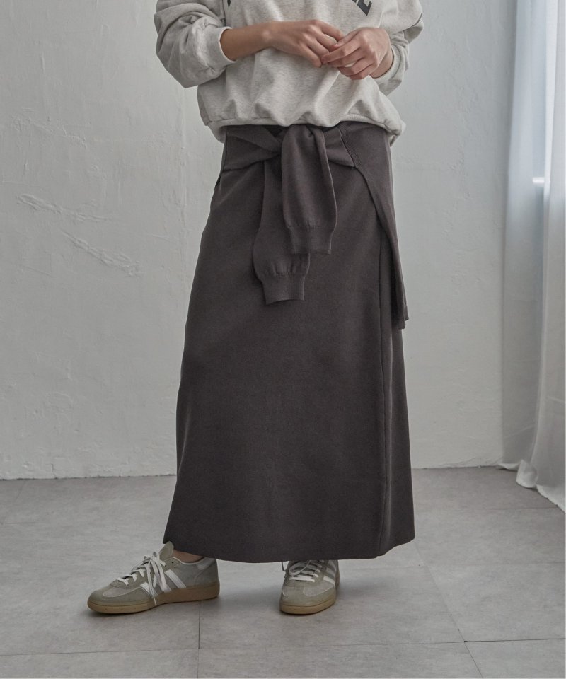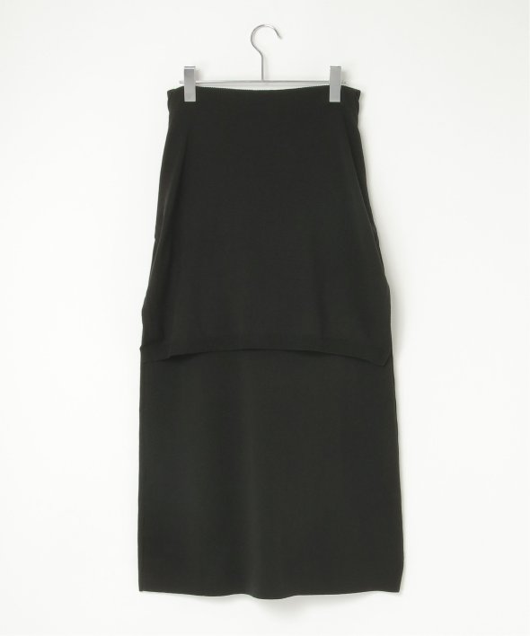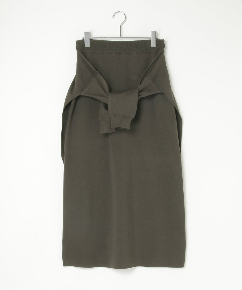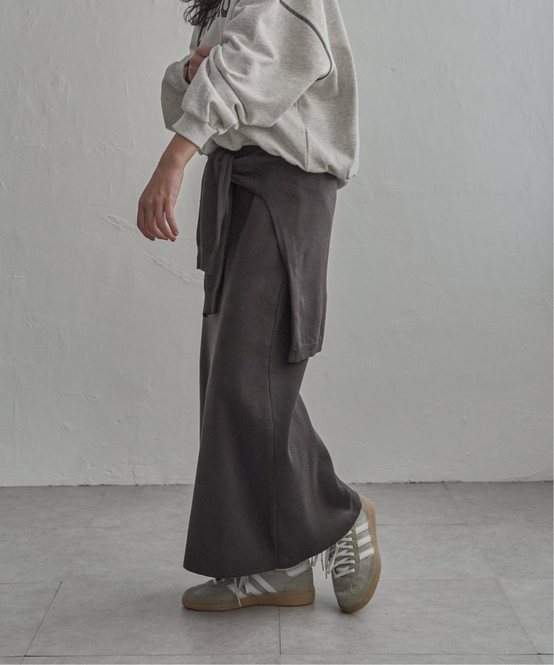 まるでトップスを腰巻きしているようなユニークなデザインのフェイクレイヤードニットスカート。