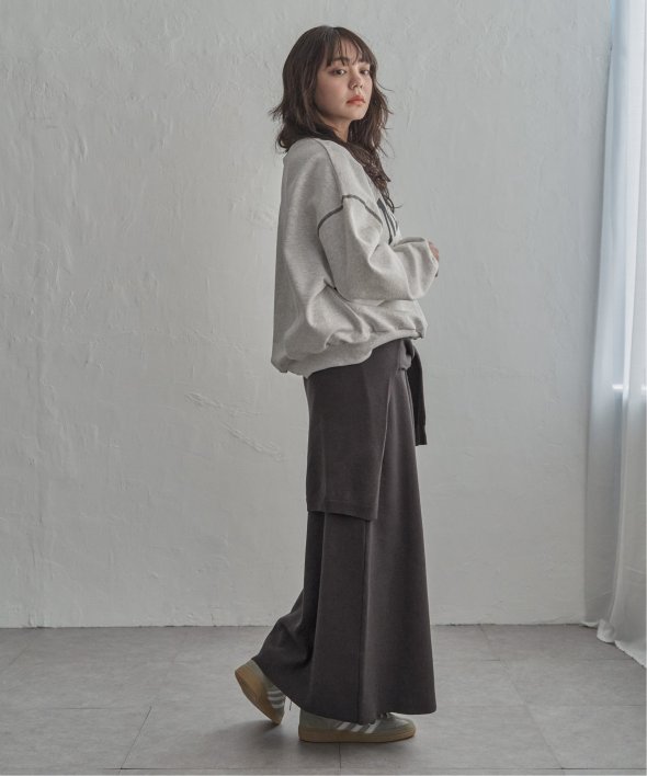 ウエスト部分にトップスを巻いたようなフェイクレイヤードを施し、こなれ感を演出。