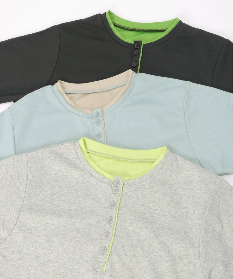配色使いで新鮮な印象のヘンリーネックTシャツ。