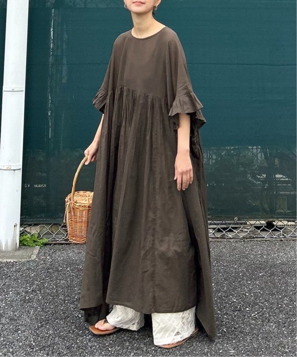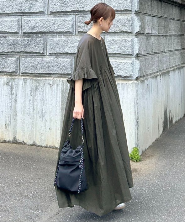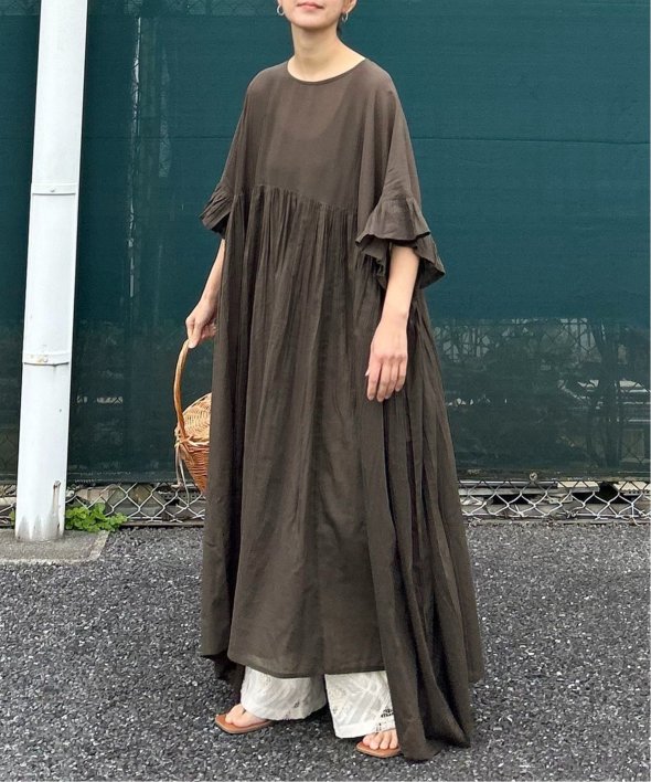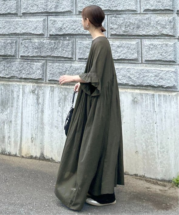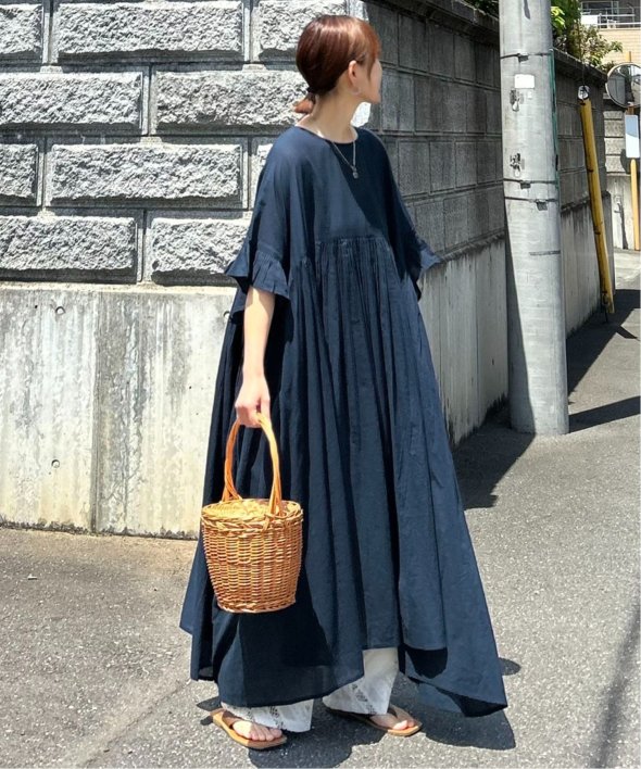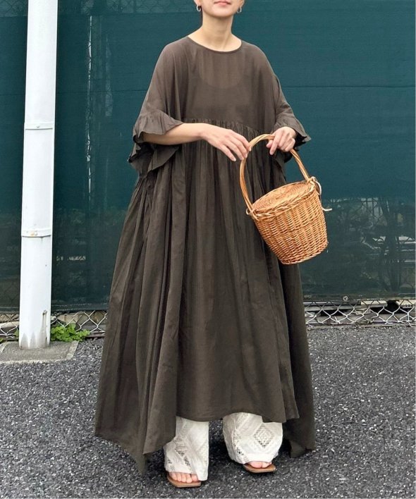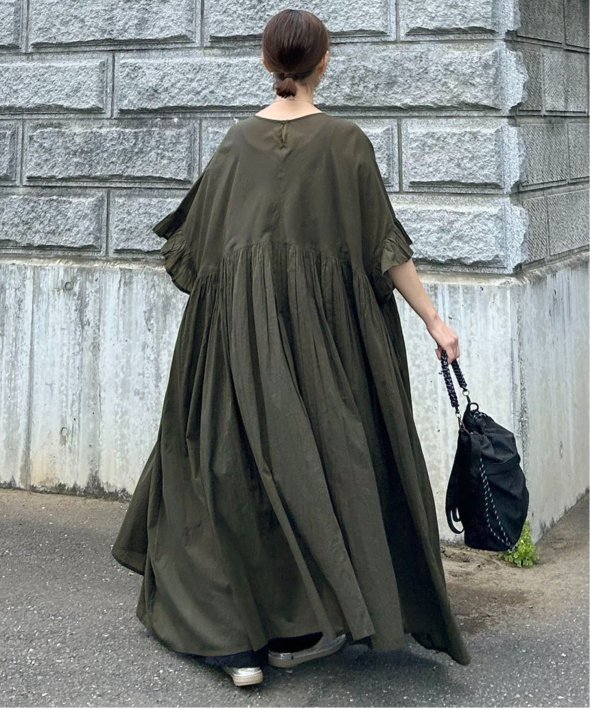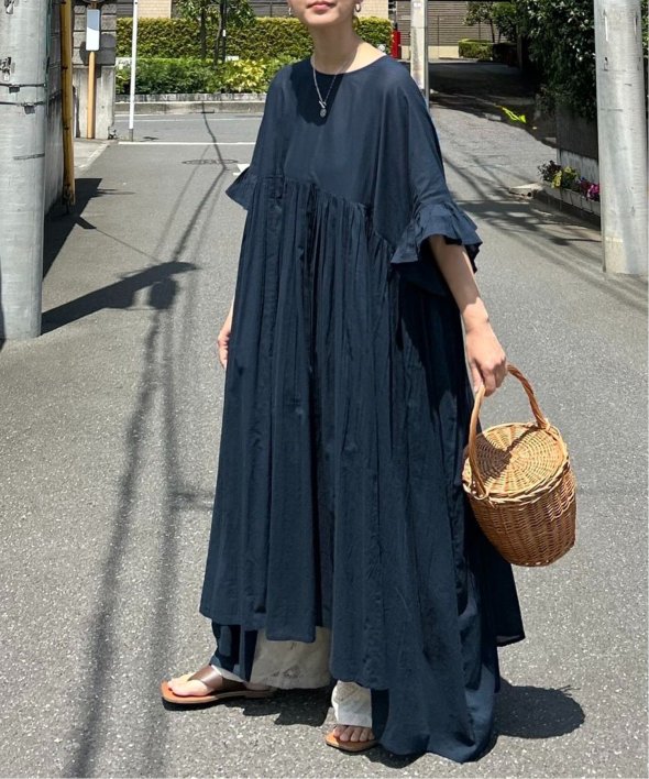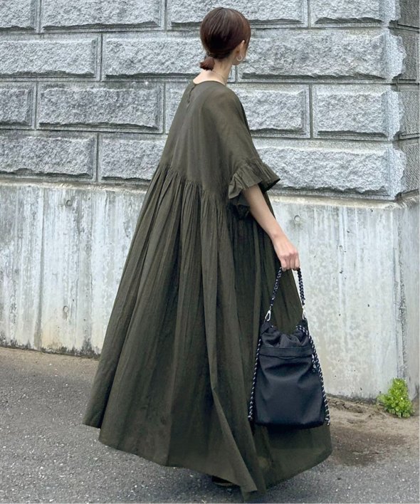 胸下の切り替えからふんわり広がるシルエットは、動くたびにやさしく揺れて、リラックス感の中にしっかりとした華やかさを演出。