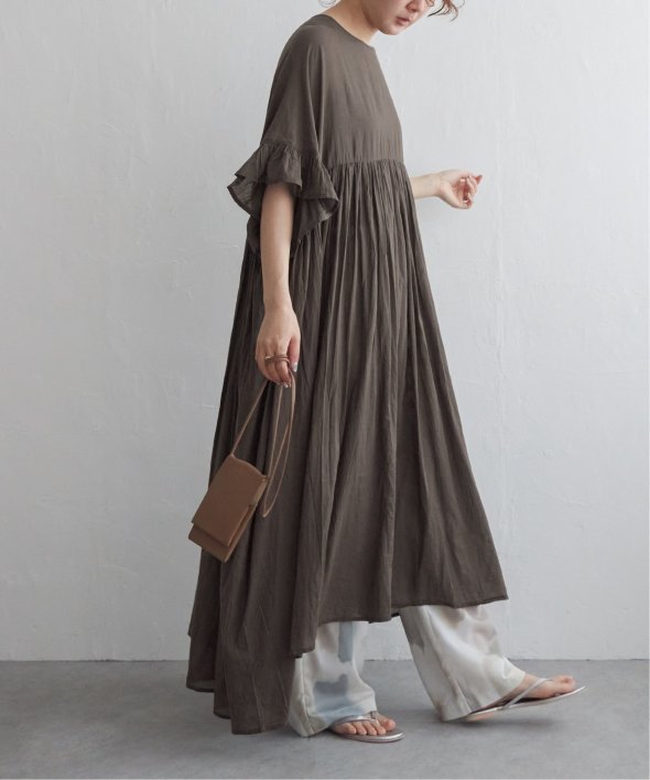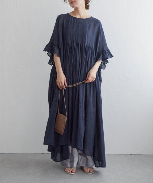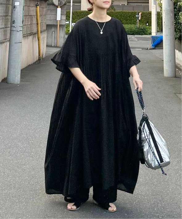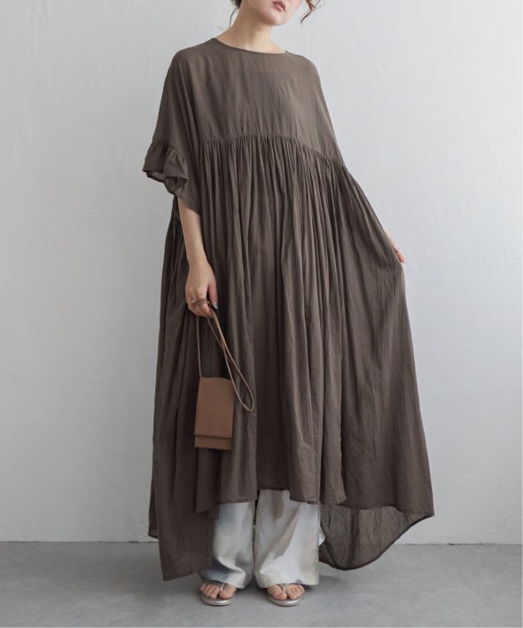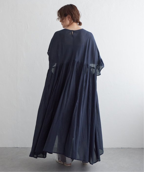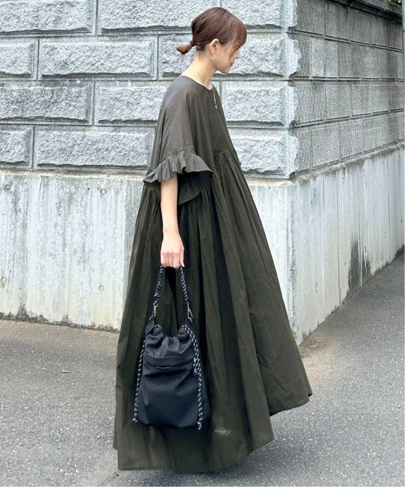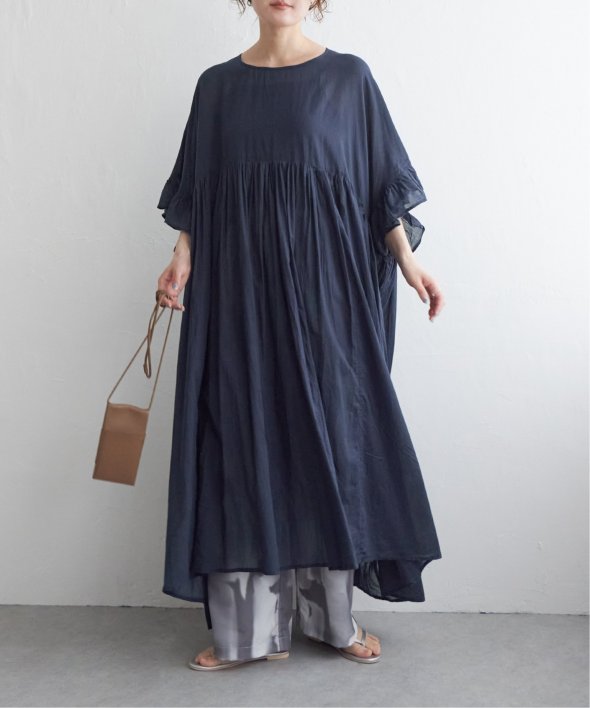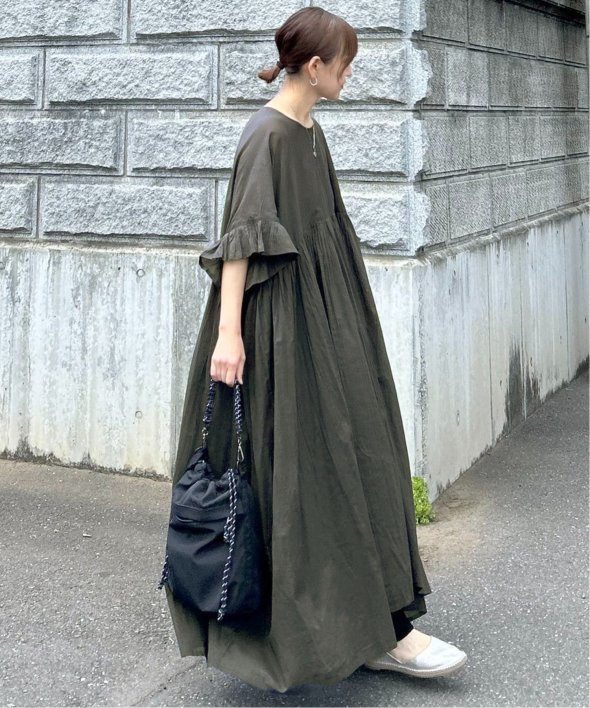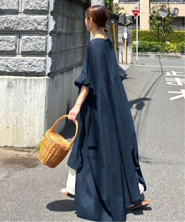 胸下の切り替えからふんわり広がるシルエットは、動くたびにやさしく揺れて、リラックス感の中にしっかりとした華やかさを演出。