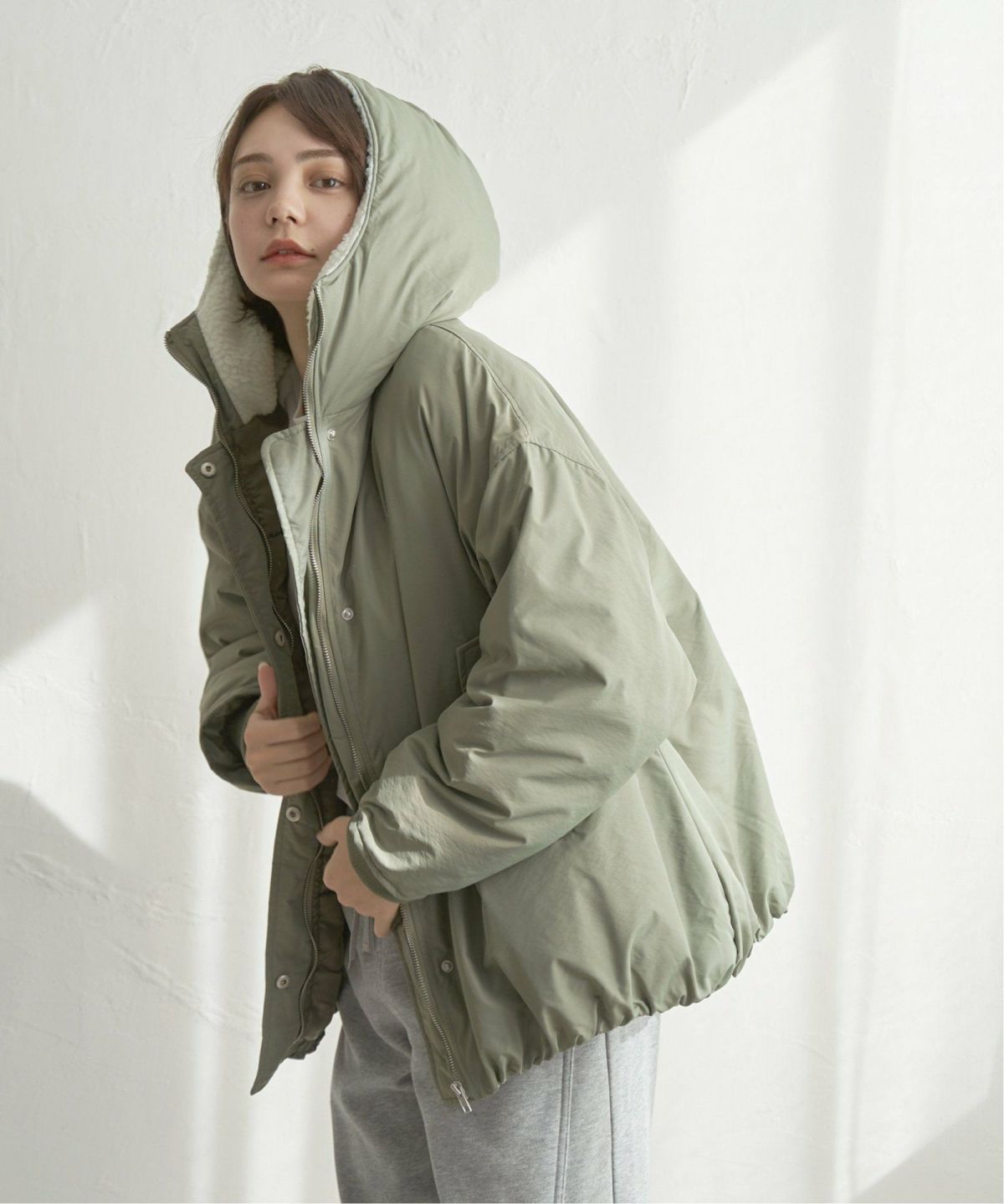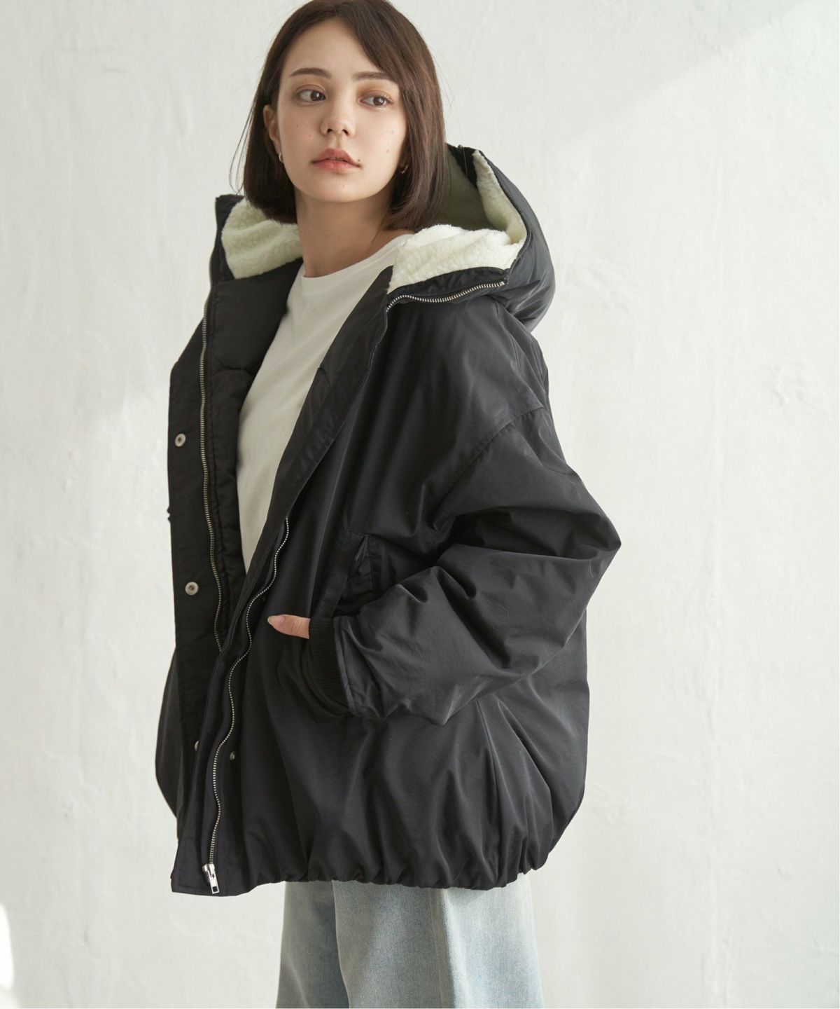 ふんわりシルエットで、冬カジュアルに旬のボリューム感を フードボアバルーンブルゾン