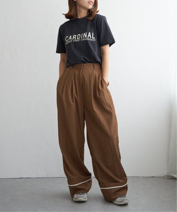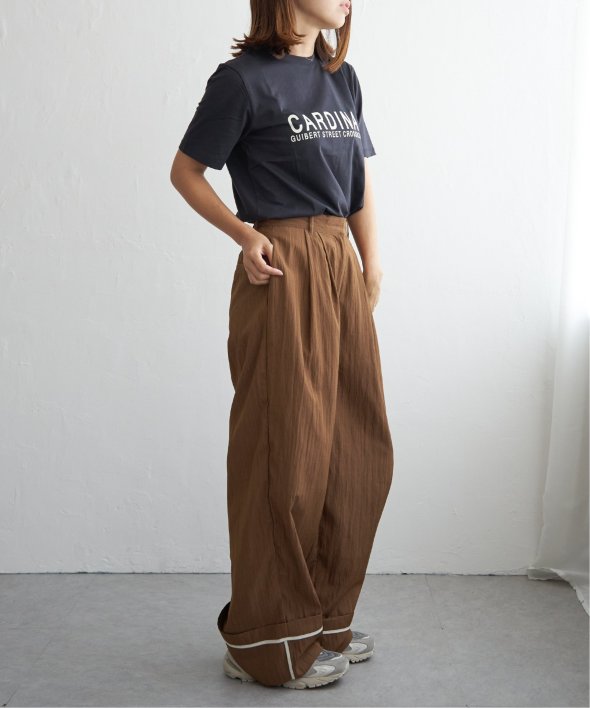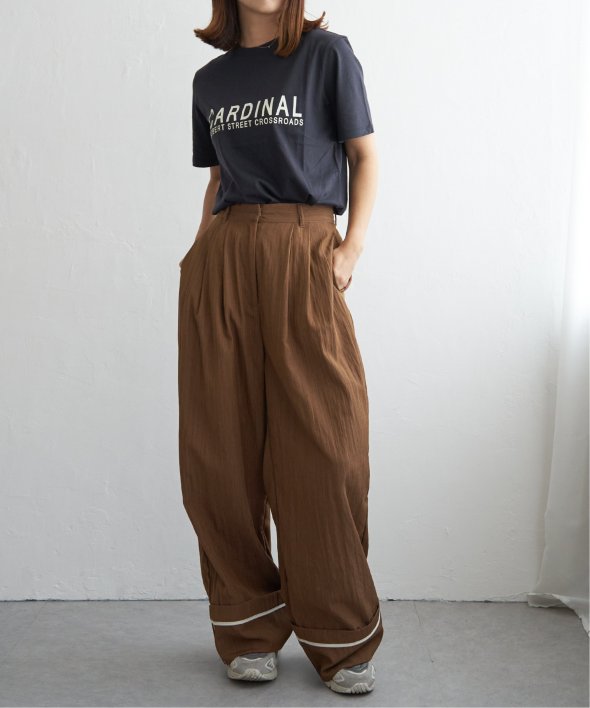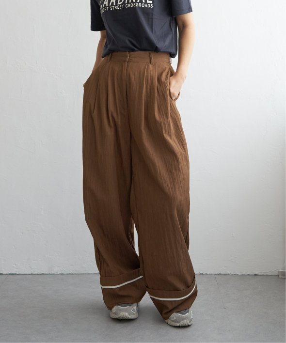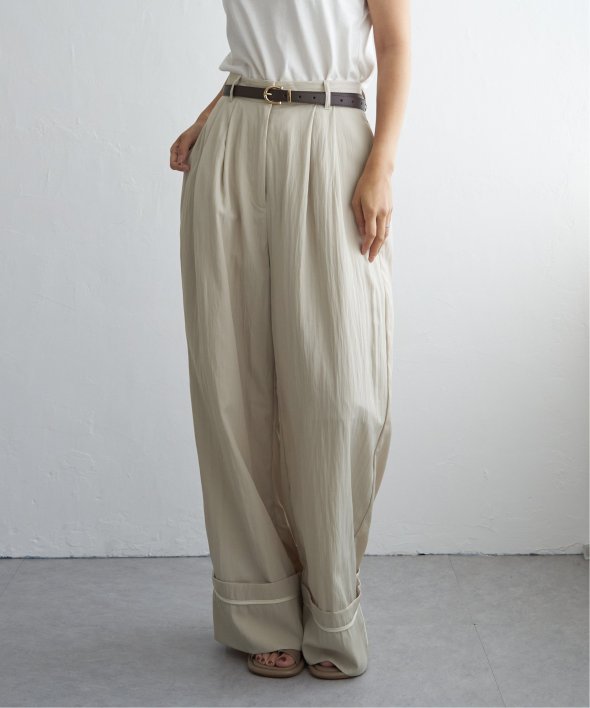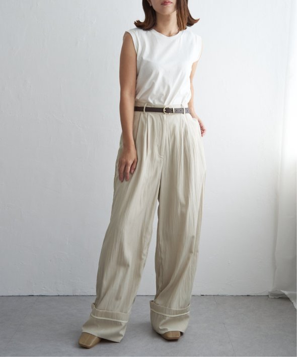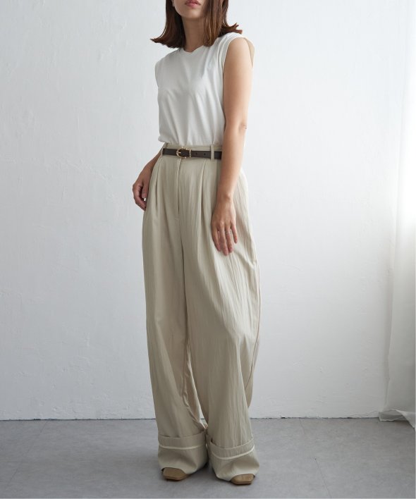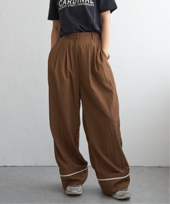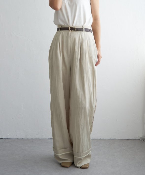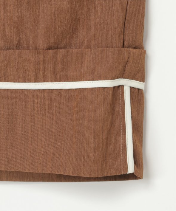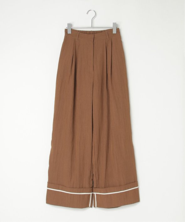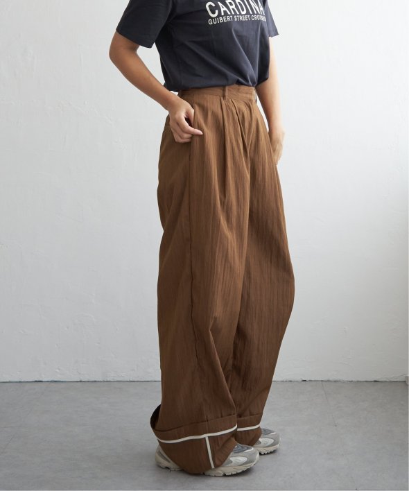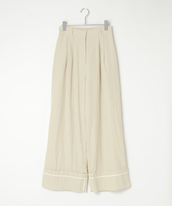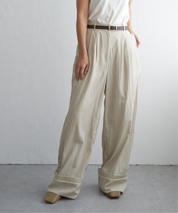 折り返した裾にさりげなく効かせた配色パイピングがポイントのターンバックタックパンツ。