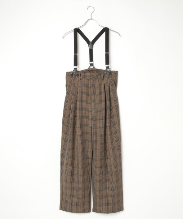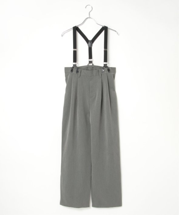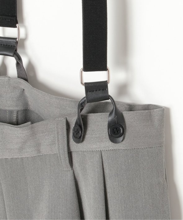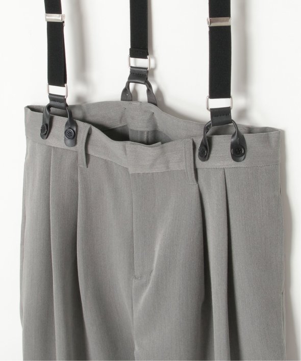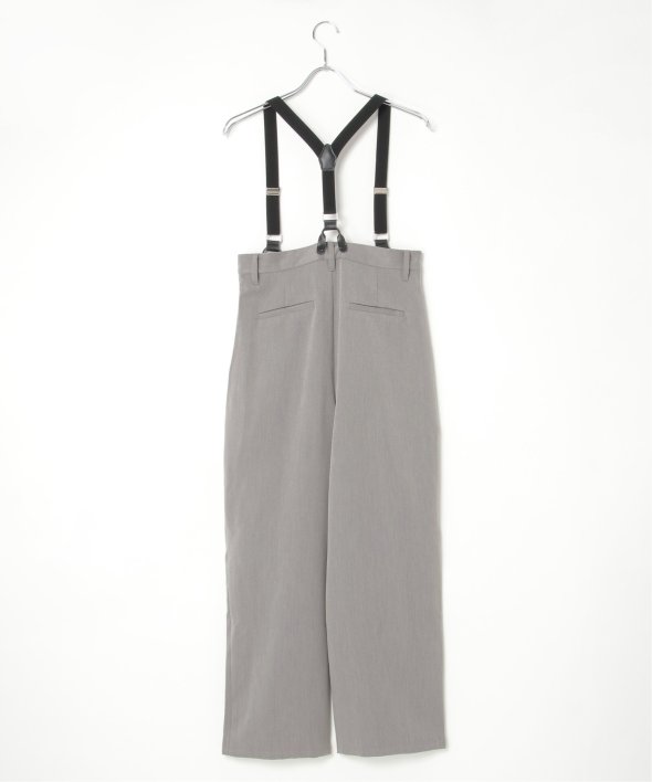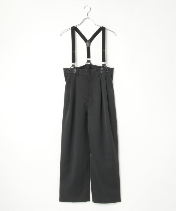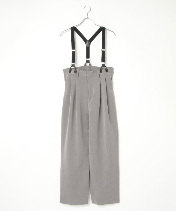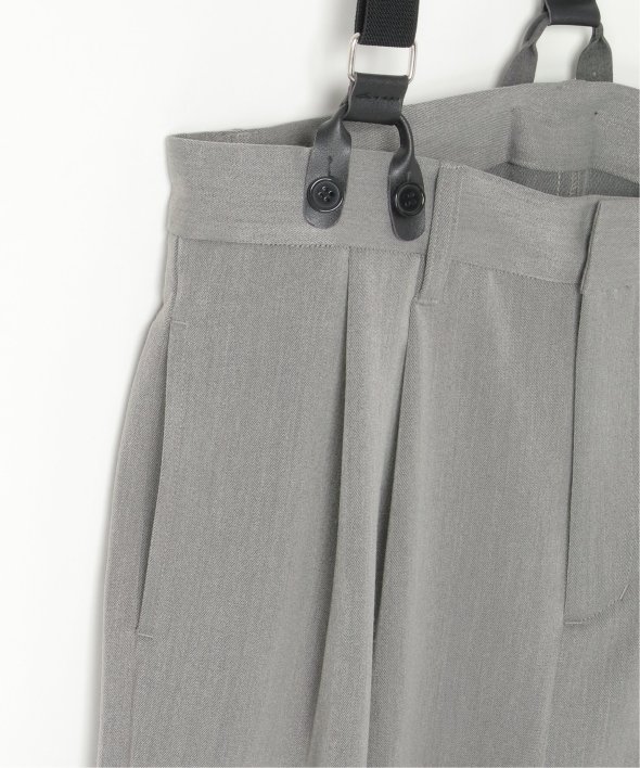 フェイクレザーとゴムのサスペンダーがついたツータックテーパードパンツ。