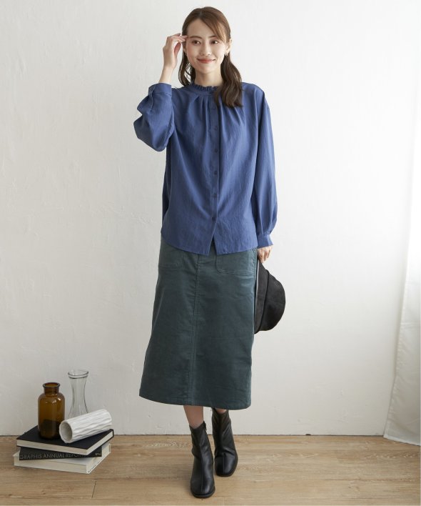 スリットが入った裾ラウンドのシルエットなため、ニットやベストを着用した時にキレイに裾が出るようになっています。