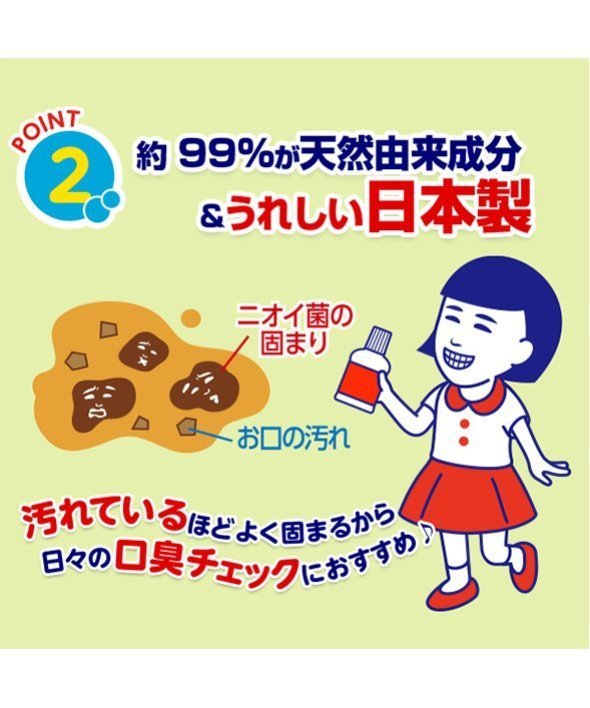 ■ハミガキしてもお口のニオイが気になるときに。■お口の汚れが見える洗口液。重曹(※)パワーでこびりついた汚れや口臭の原因のニオイ菌(タンパク質)を分解、お茶エキスで固めてお口すっきり、恋する息に■定期的なチェックがおすすめ■ハミガキが出来ないときのハミガキ代わりにも ! ■約99%が天然由来成分。合成の界面活性剤、香料、保存料は使用していません。■アルコール含有※炭酸水素Na(清掃剤)【商品規格】サイズ:(約)74×148×44mm【内容量】200mL