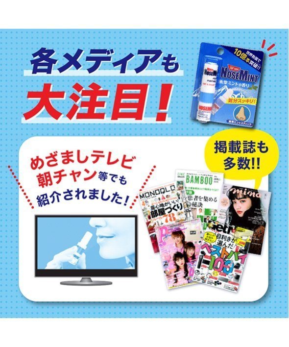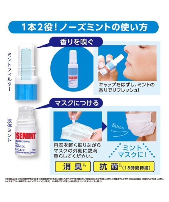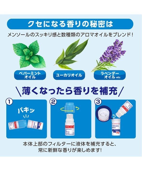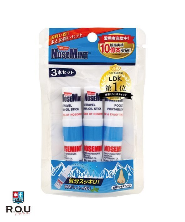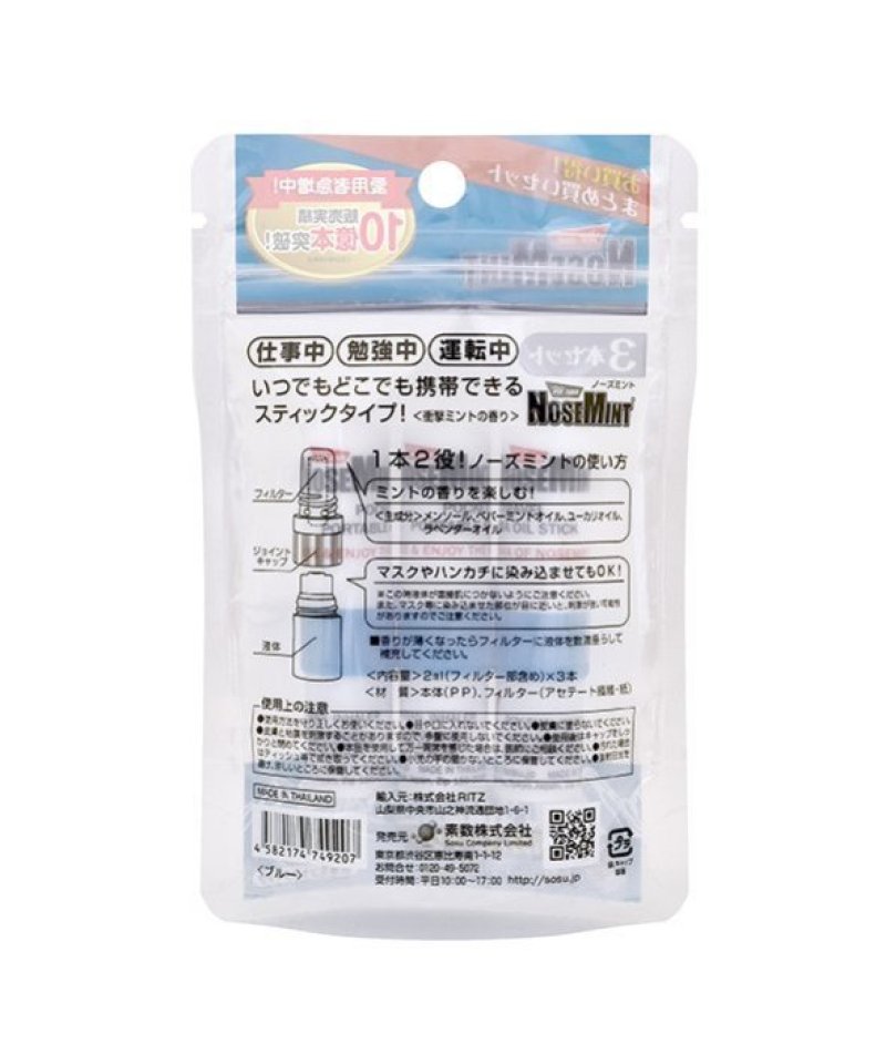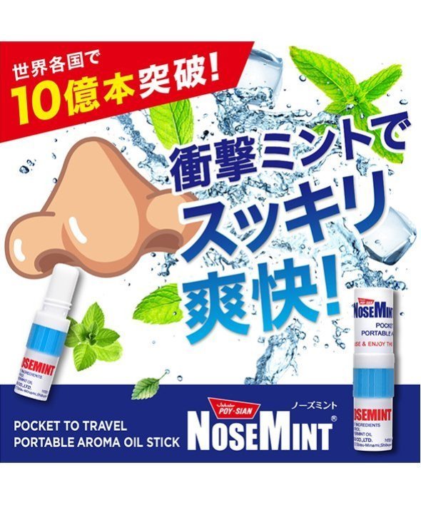 ■NOSEMINT ノーズミント お得な3本セット ! ! ■ミントの香りで気分リフレッシュ ! ポーチに1本入れておきたいミニサイズのリフレッシュミントスティック。■鼻がムズムズする時、運転時、勉強中の気分転換など様々なシーンで大活躍。オイルをハンカチやマスクに垂らしてもOKです。【商品規格】サイズ:(約)75×90×20mm【内容量】2mL(フィルター部分含め)※1本あたり