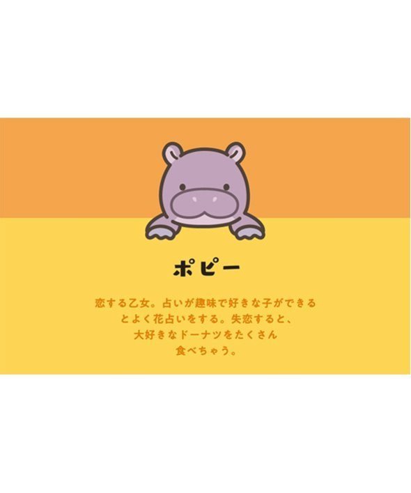 ■ポピー(カバ)恋する乙女。占いが趣味で好きな子ができるとよく花占いをする。失恋すると、大好きなドーナツをたくさん食べちゃう。