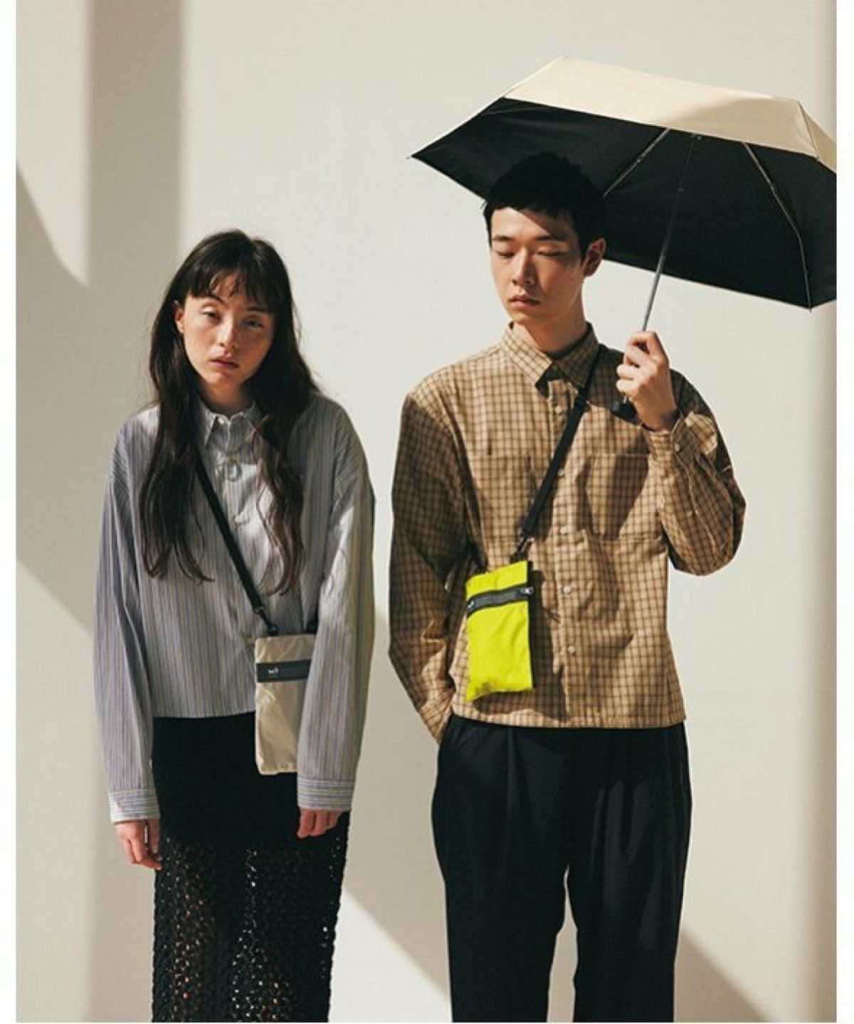 ペットボトル再生生地の裏面にコーティングを施した完全遮光の晴雨兼用傘。サコッシュ仕様の傘袋は5wayタイプで実用的。