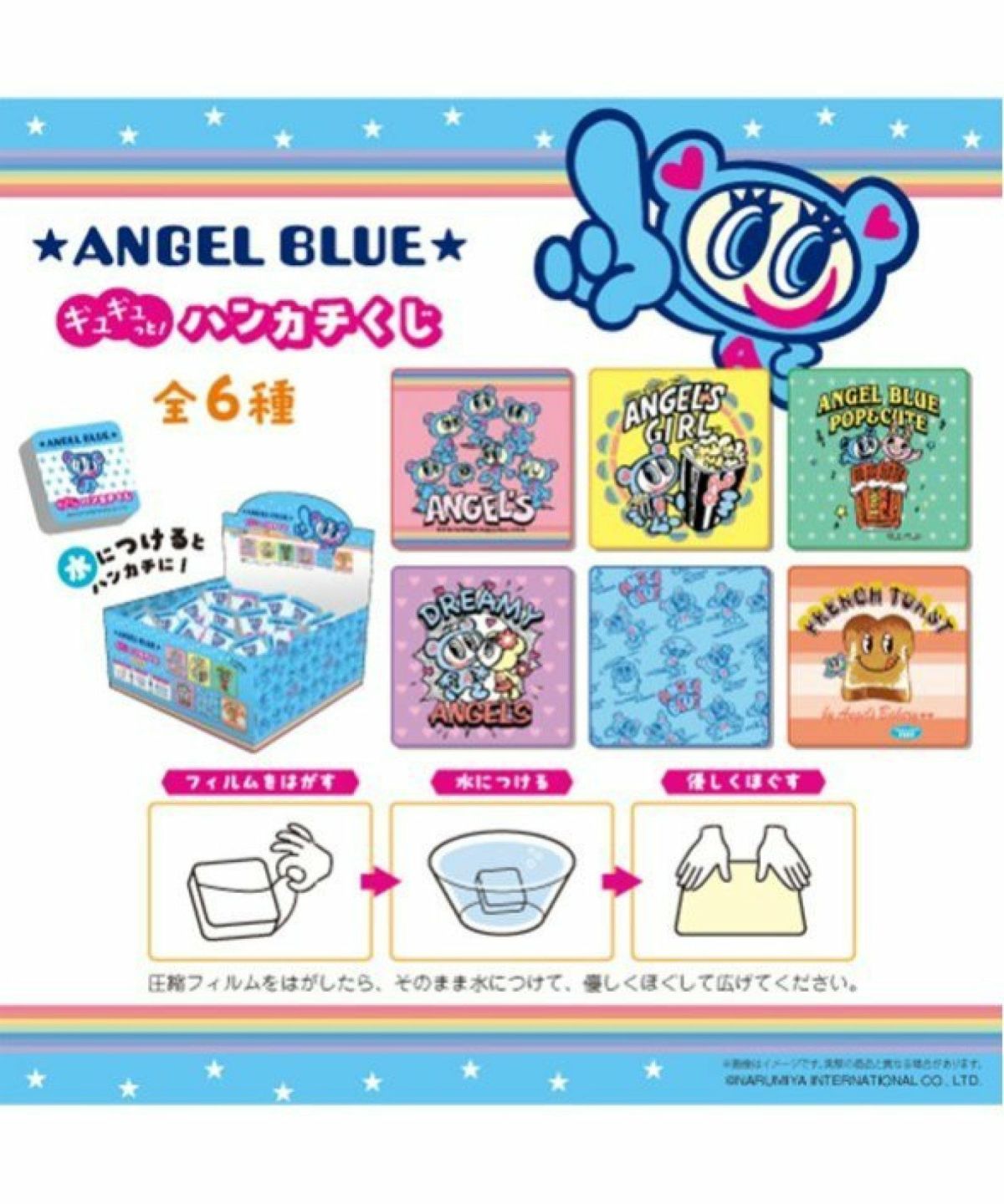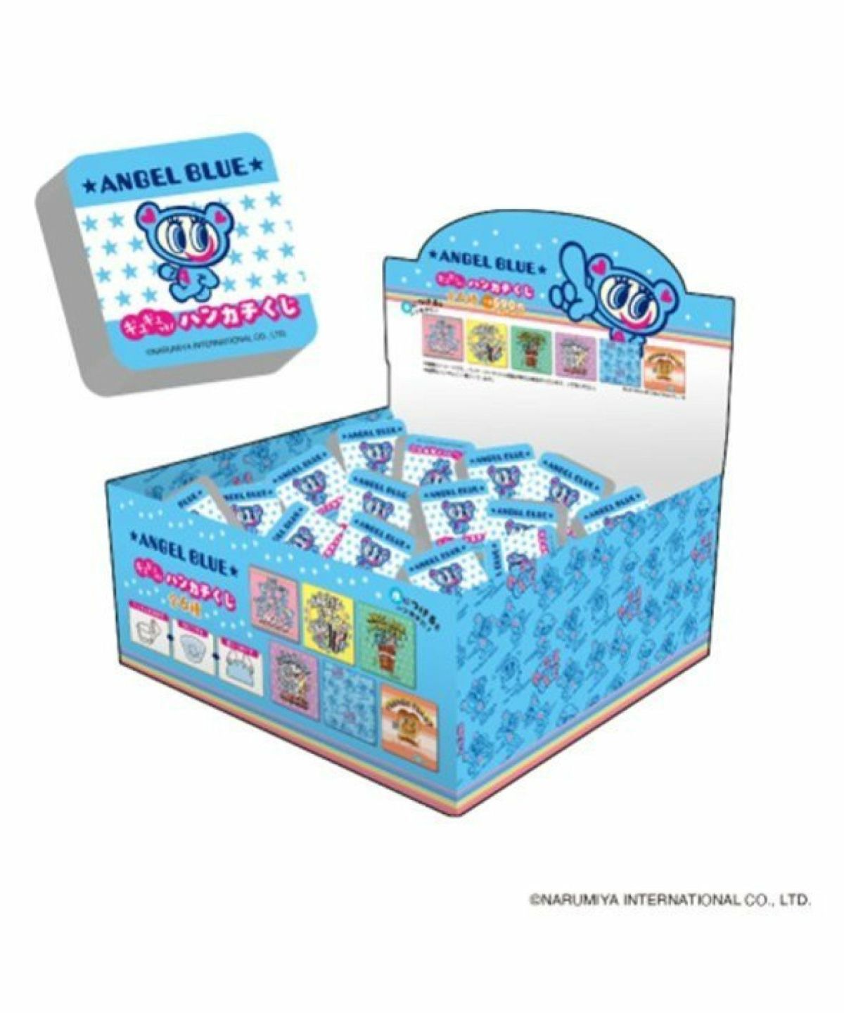 何がでるかはお楽しみ♪ギュギュっと圧縮されたハンカチくじ。柄は全部で6種類。 ANGEL BLUE ギュギュっと ! ハンカチくじ BOXセット