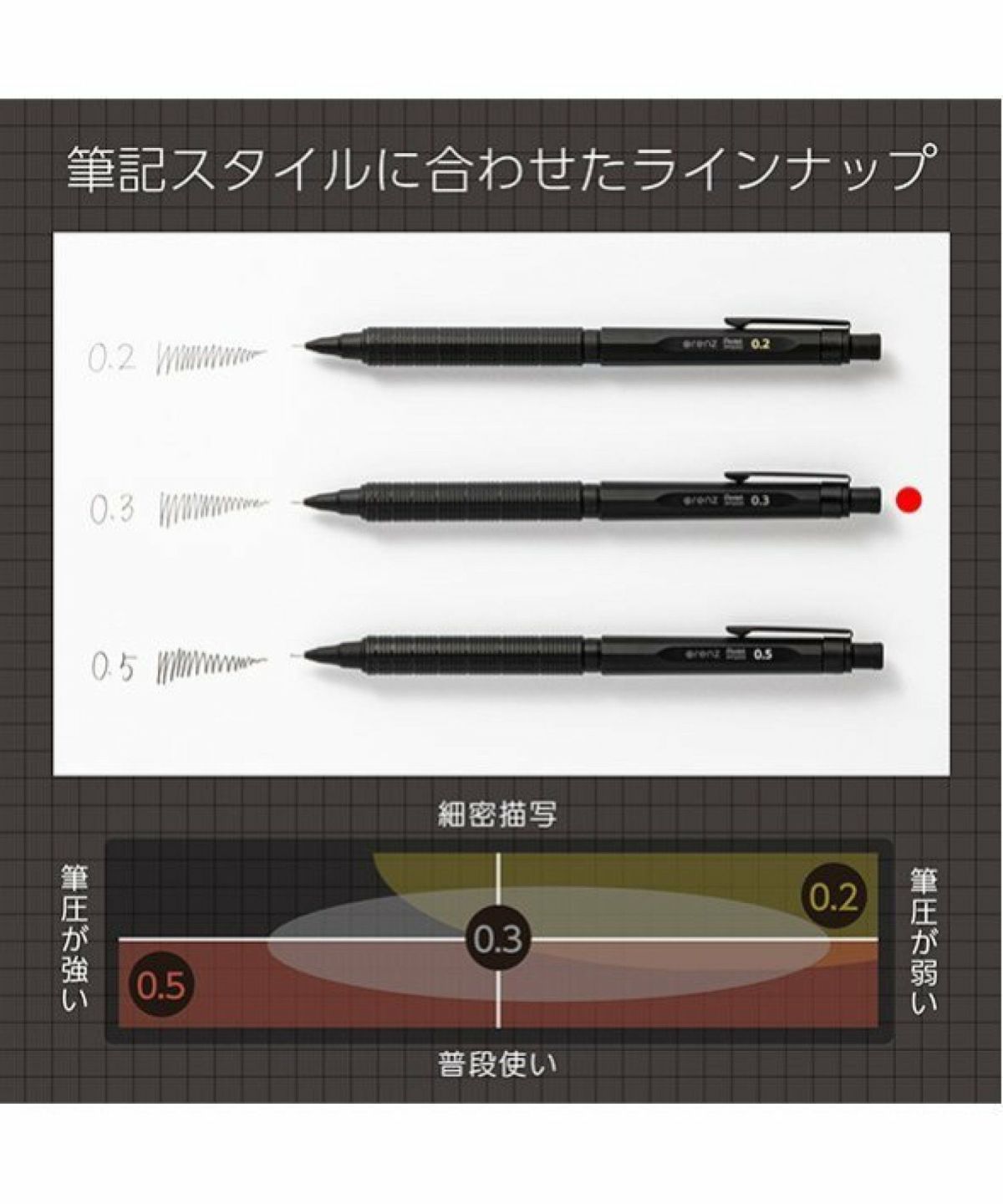 芯が減るのに合わせて先端パイプがスライドするオレンズシステムに加え、ペン先を紙面から離すたびに芯が出てくる自動芯出し機構を搭載。ぺんてるのシャープペンシル