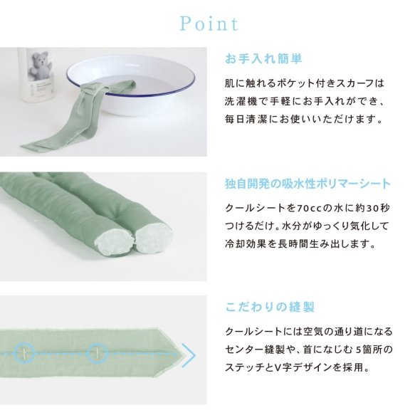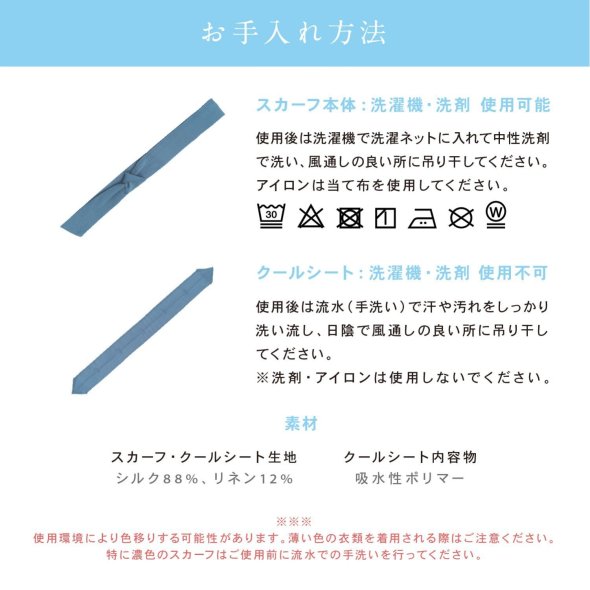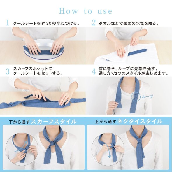 首元をひんやり冷やしてくれるスカーフ。暑さの厳しい夏のお助けアイテムです。使い方は簡単!クールシートを約30秒水につけ、スカーフのポケットにセットするだけ。もちろんスカーフは洗濯機で洗えるため、お手入れも簡単です。※クールシートは洗濯機・洗剤の使用不可機能的!◎30秒でひんやり◎抗菌・防臭◎接触冷感◎スカーフ・ネクタイスタイルを楽しめる2WAY仕様