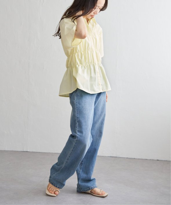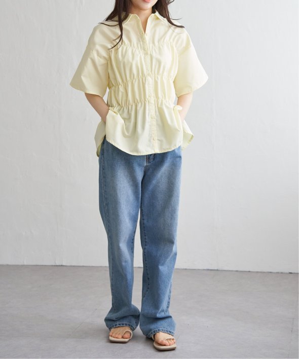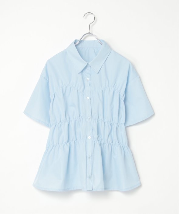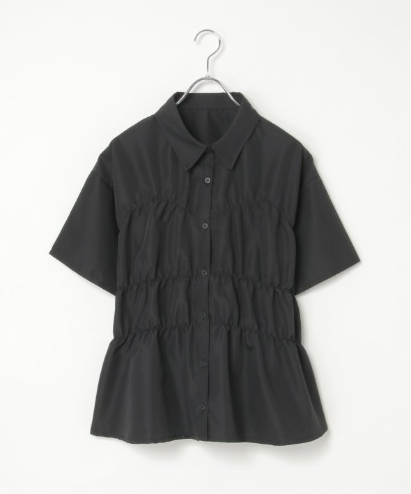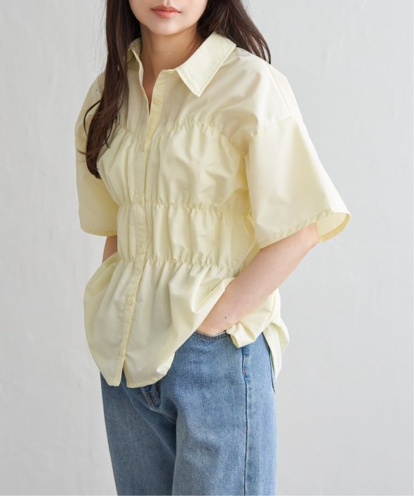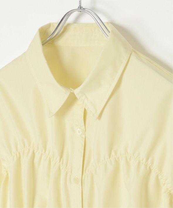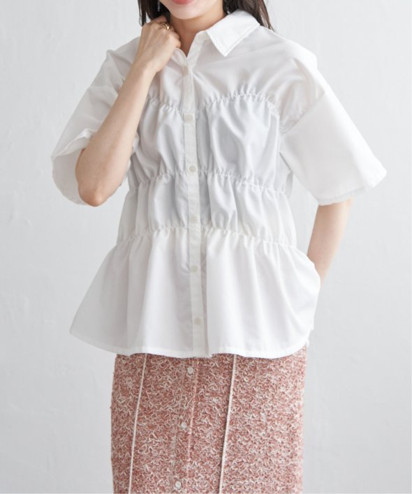 たっぷりとギャザーを寄せたシャーリングデザインが映えるシャツ。