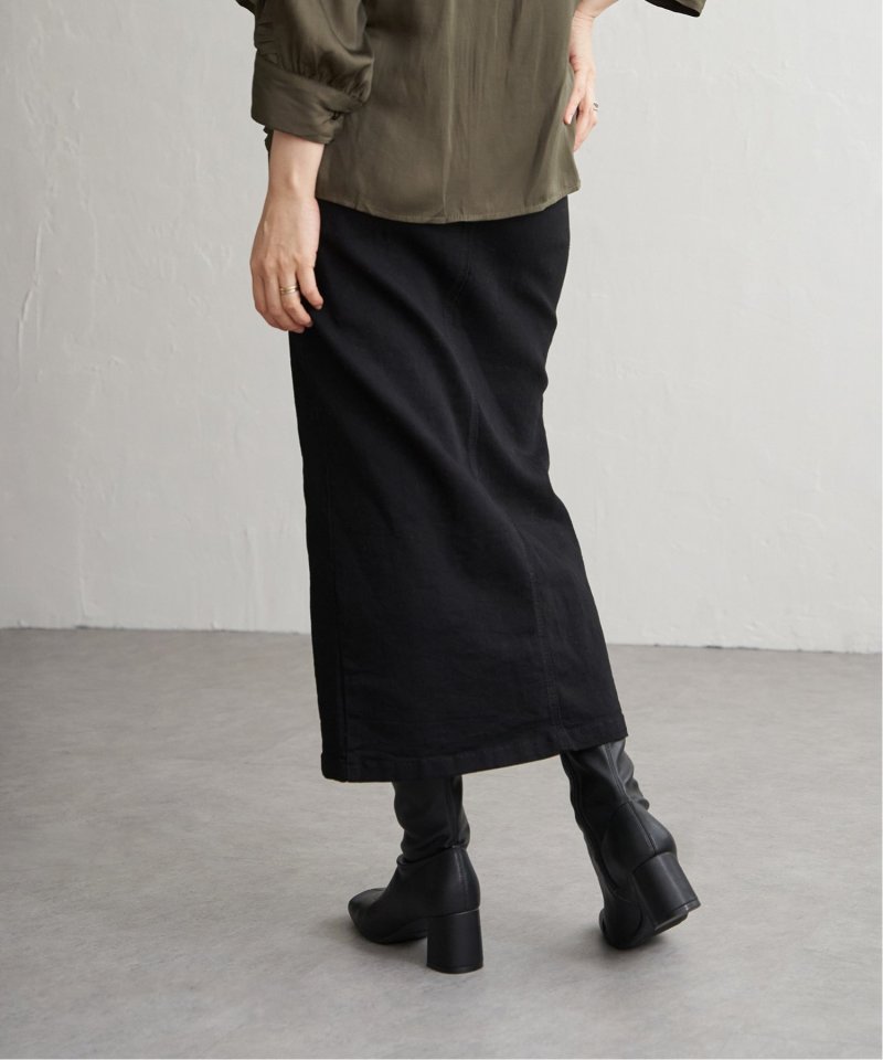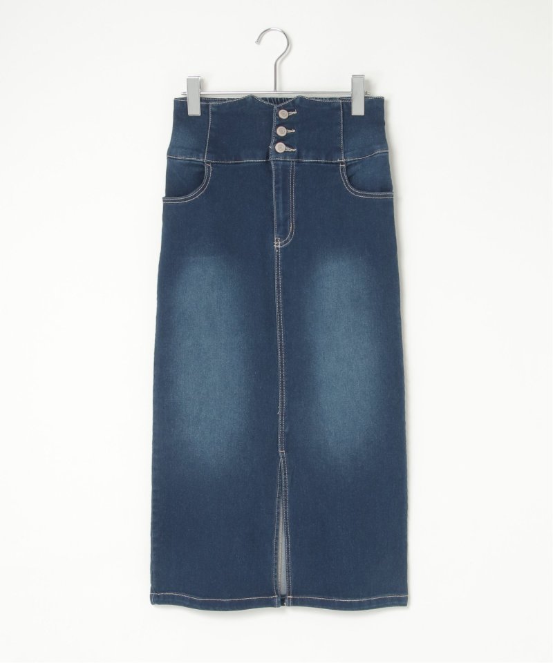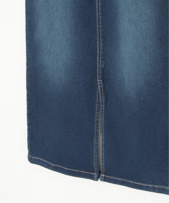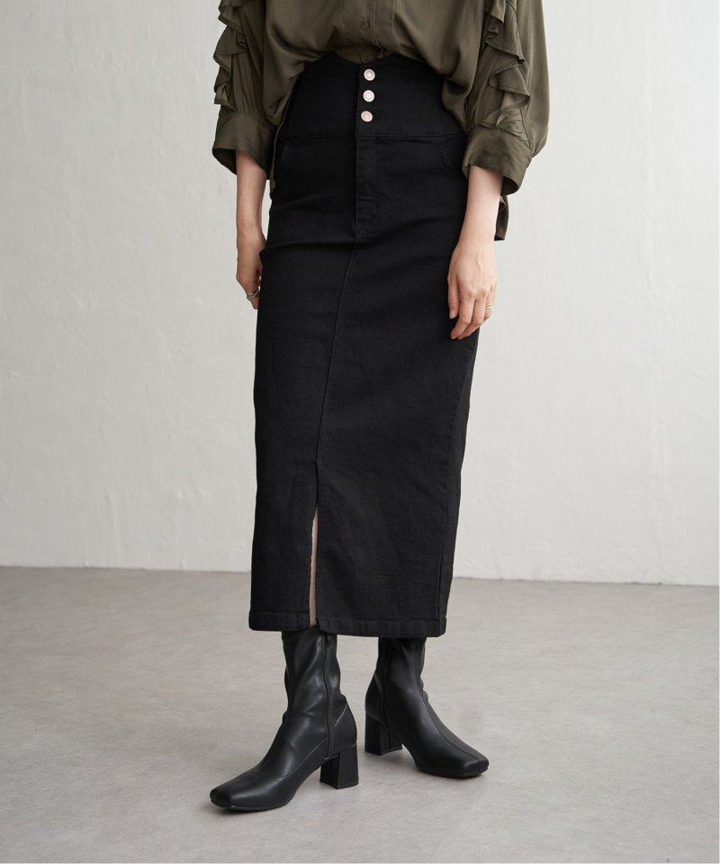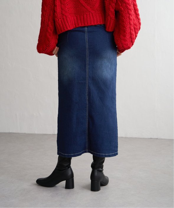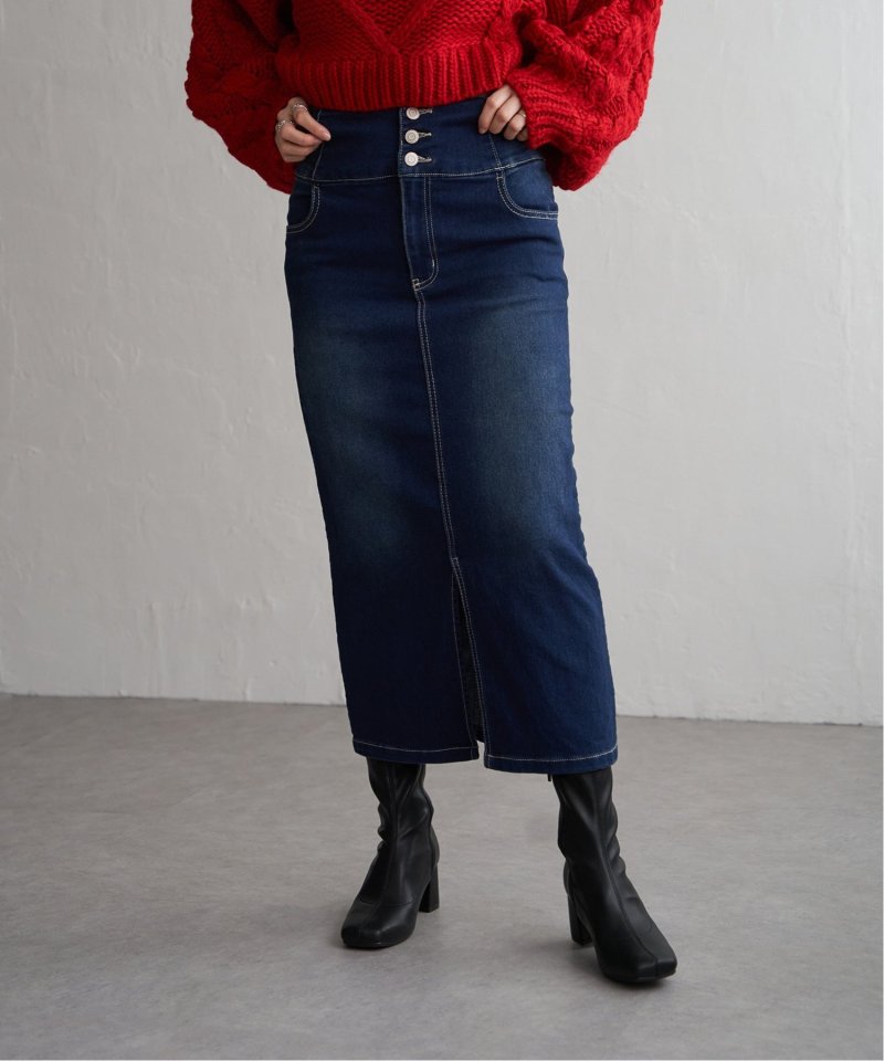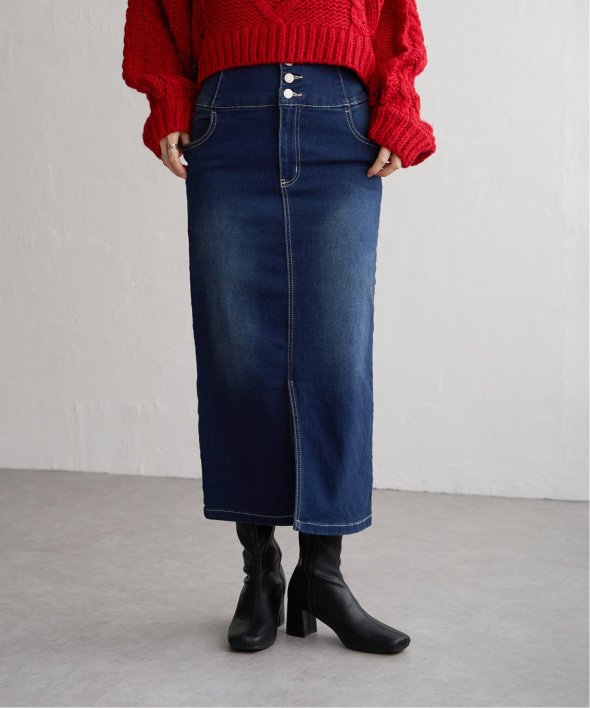 ハイウエストデザインで脚長効果抜群のナローデニムタイトスカート。
