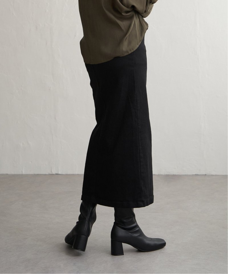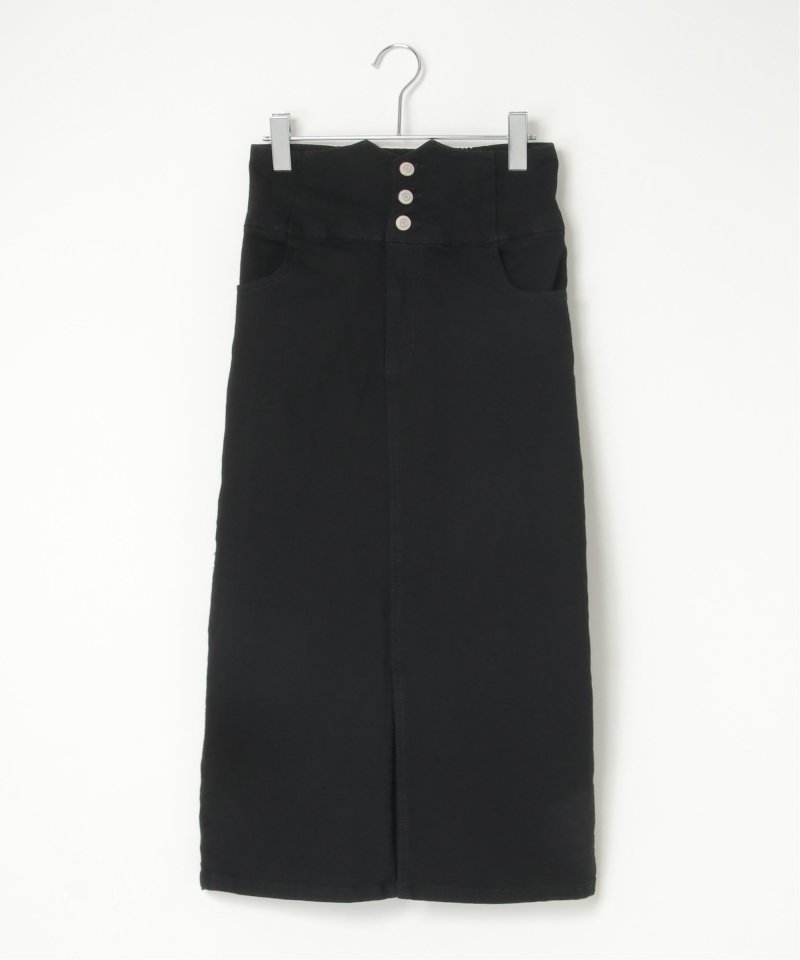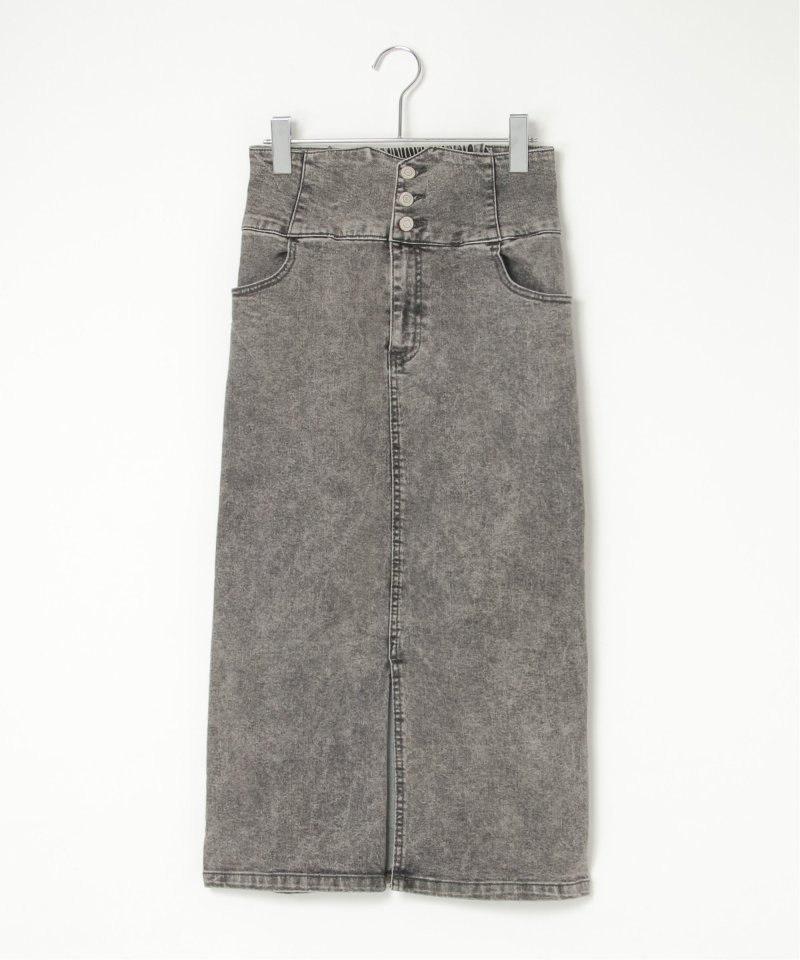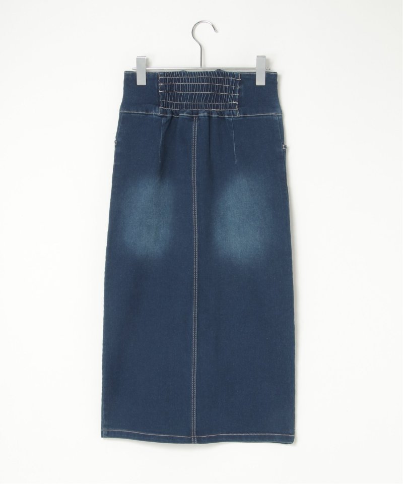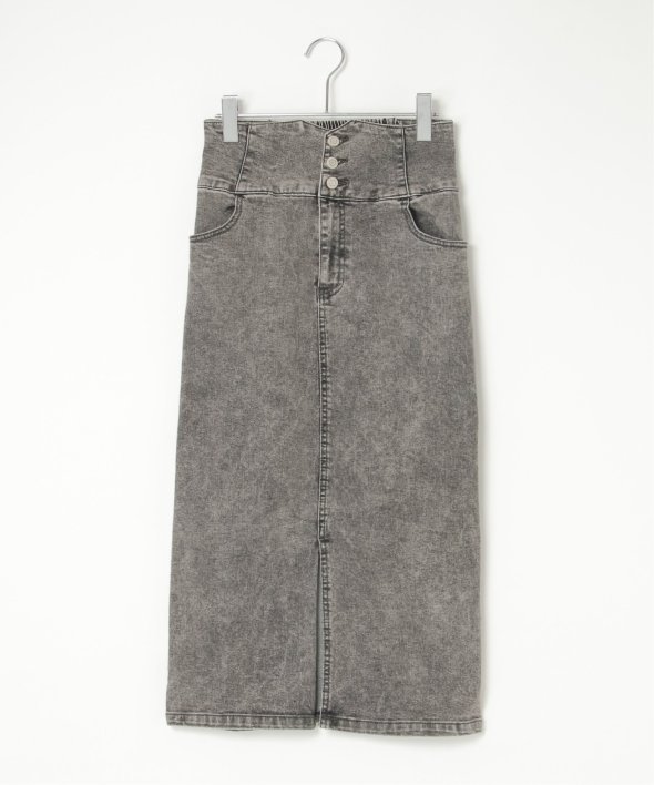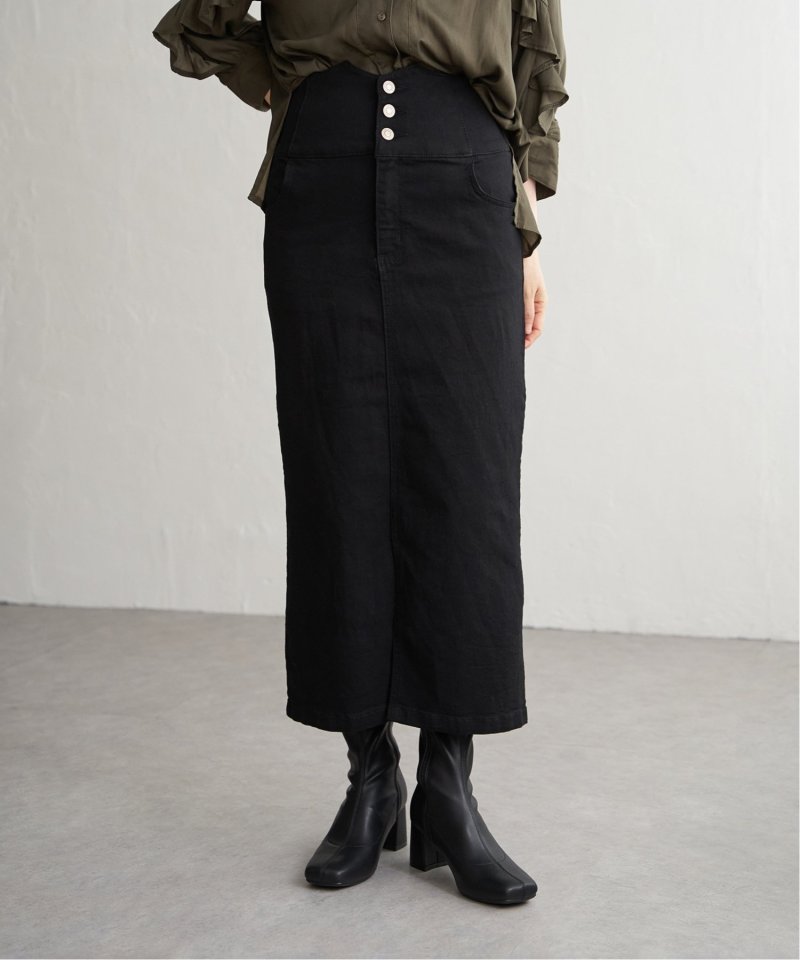 ハイウエストデザインで脚長効果抜群のナローデニムタイトスカート。