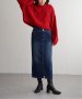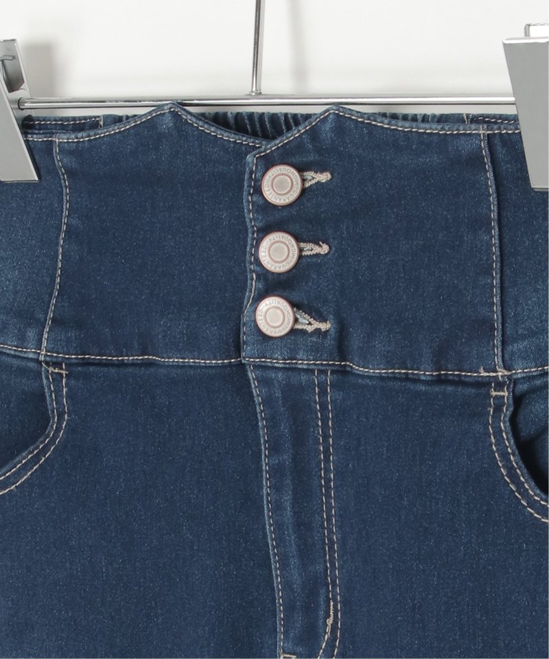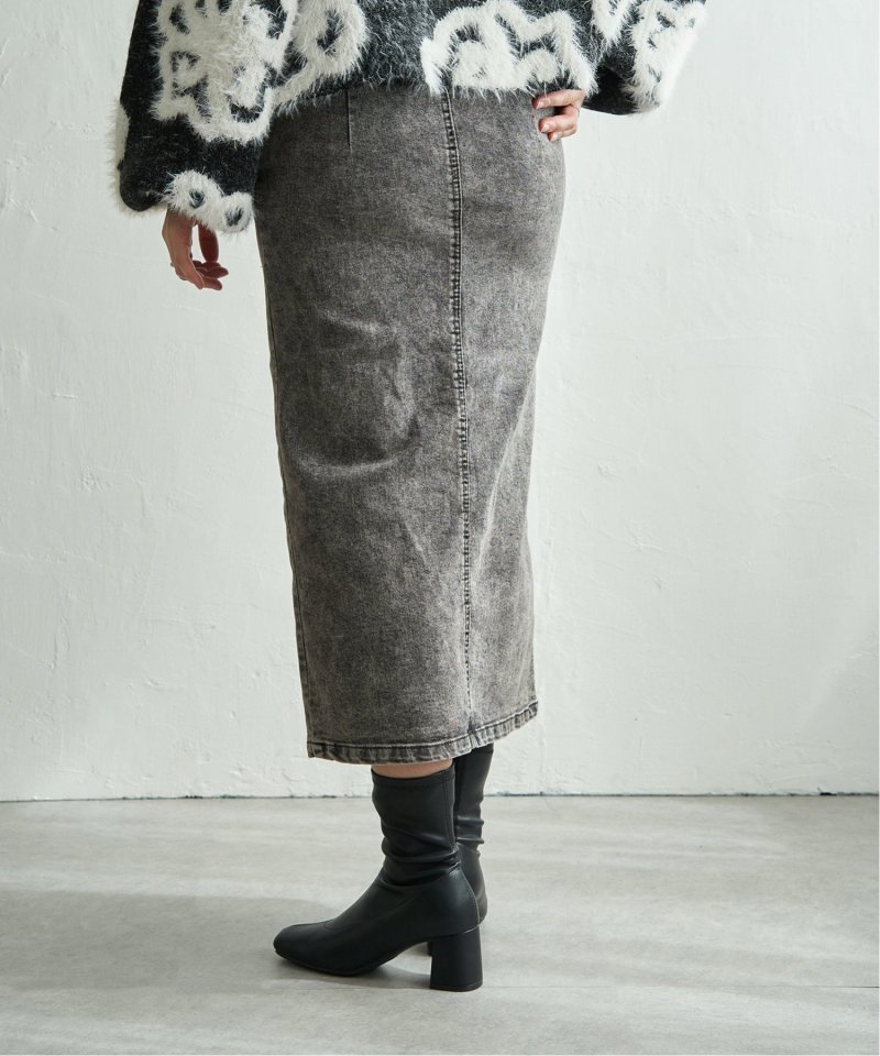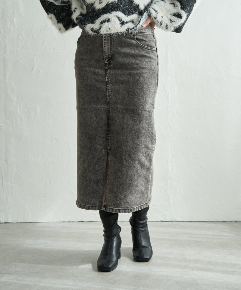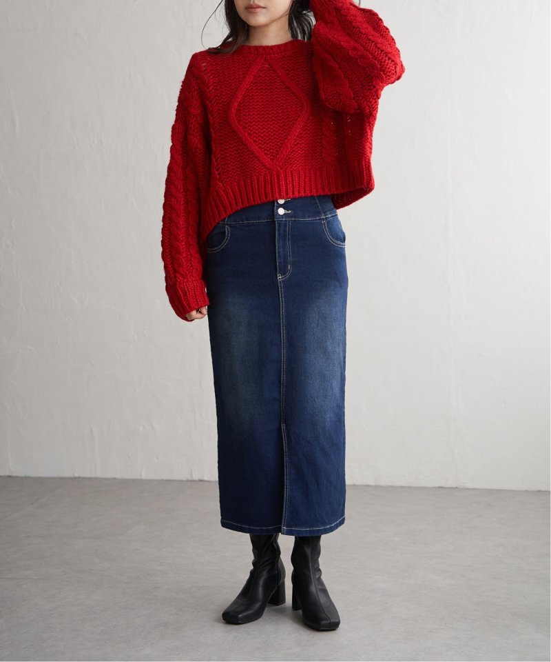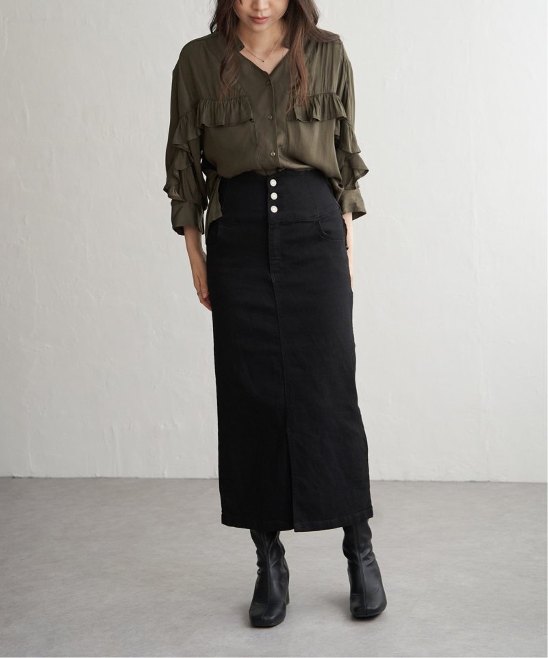 ハイウエストデザインで脚長効果抜群のナローデニムタイトスカート。