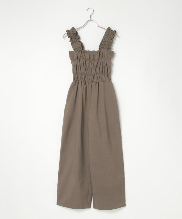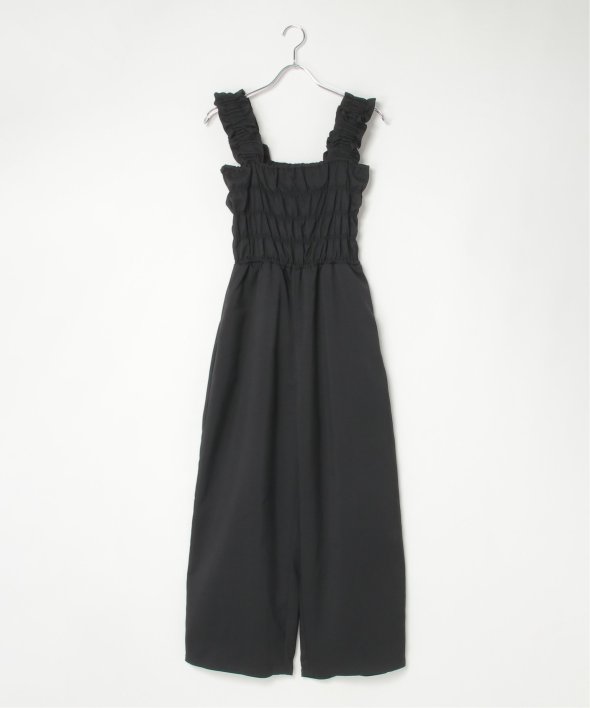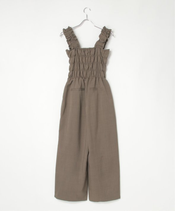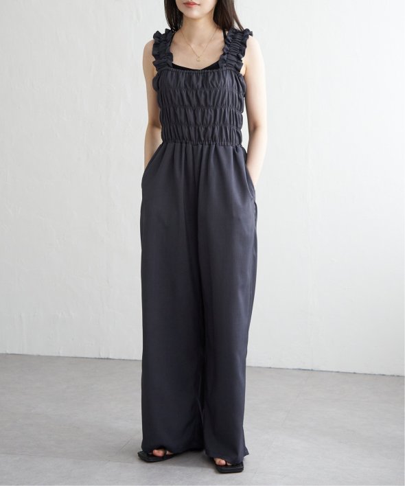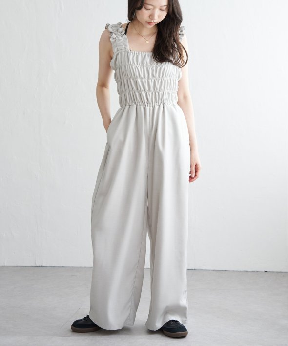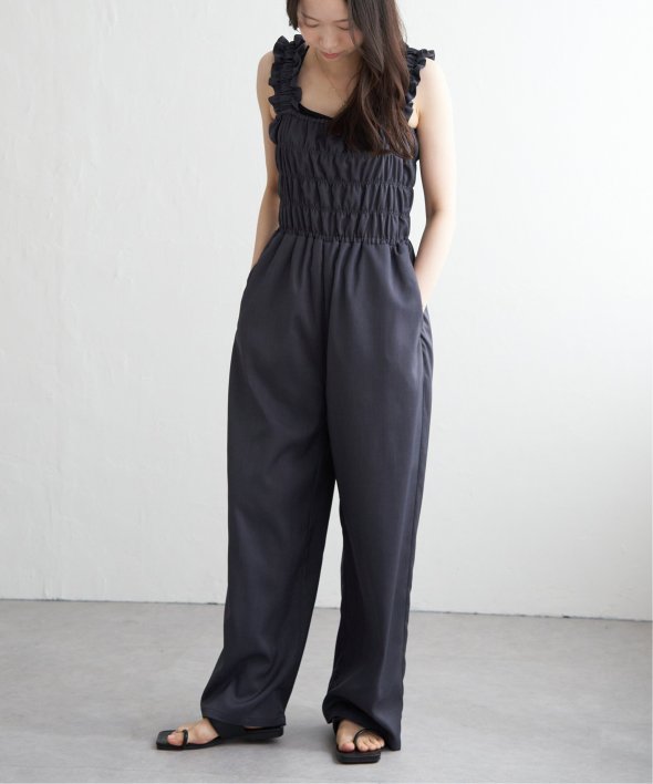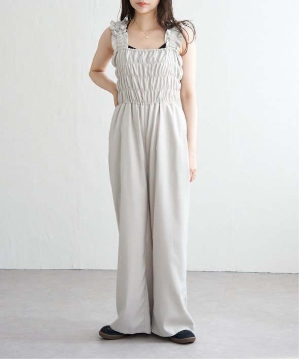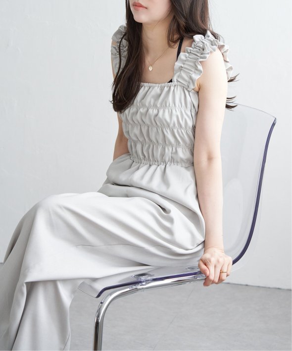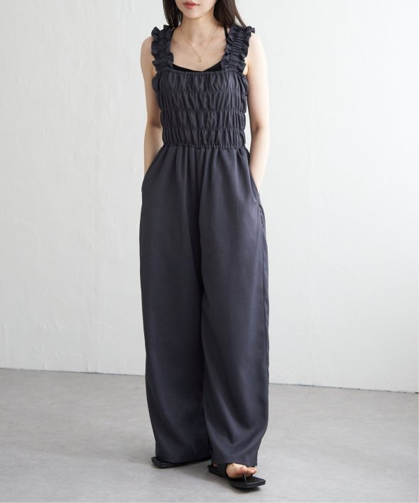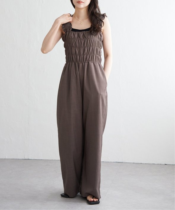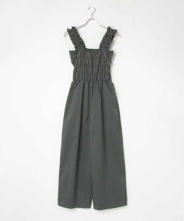胸元にシャーリングを寄せた、メリハリのあるサロペット。