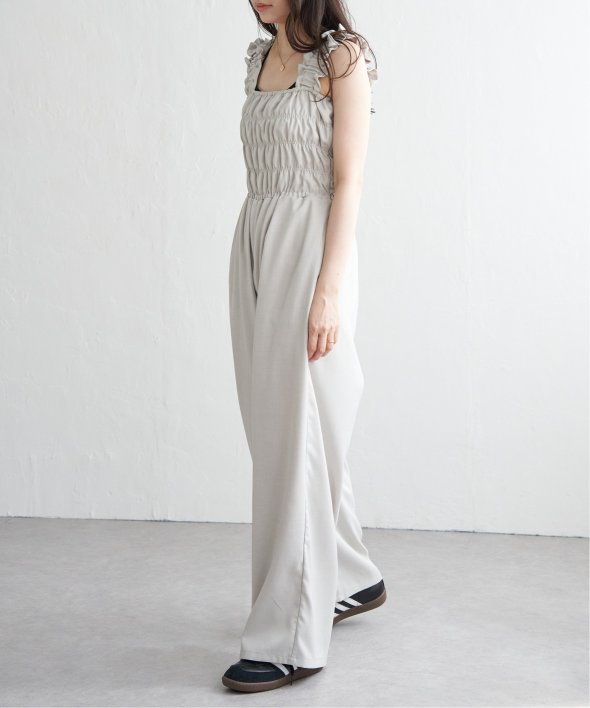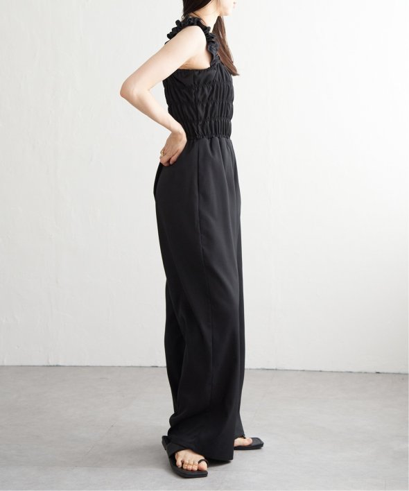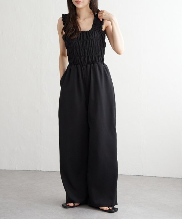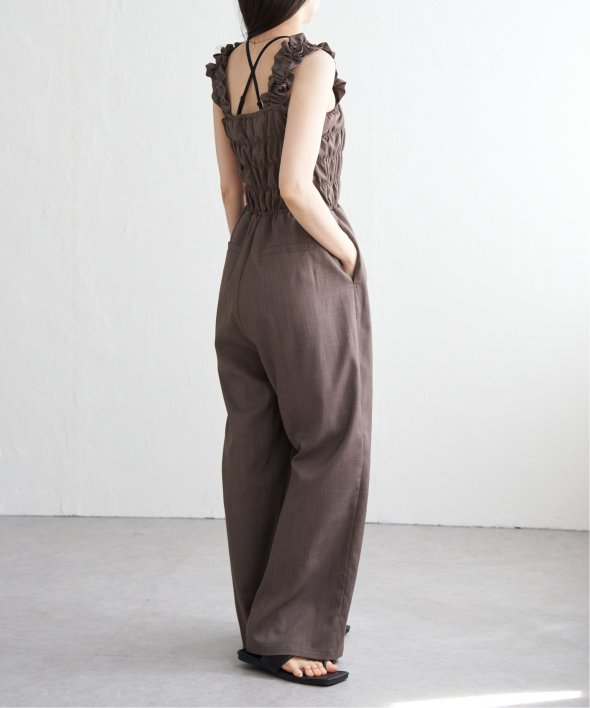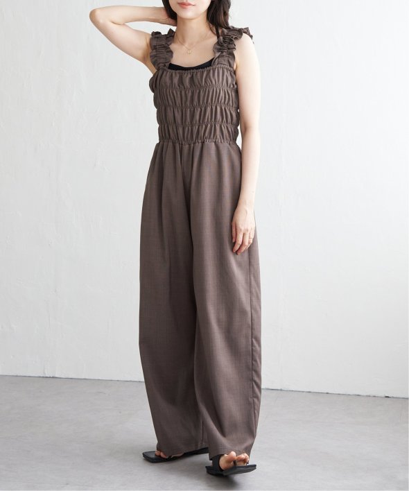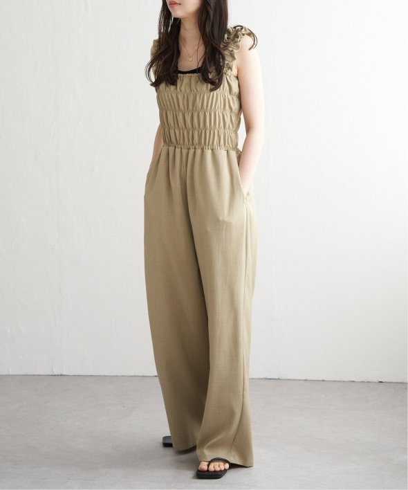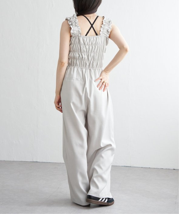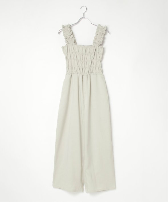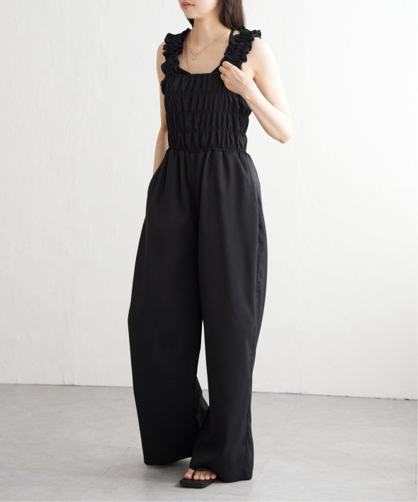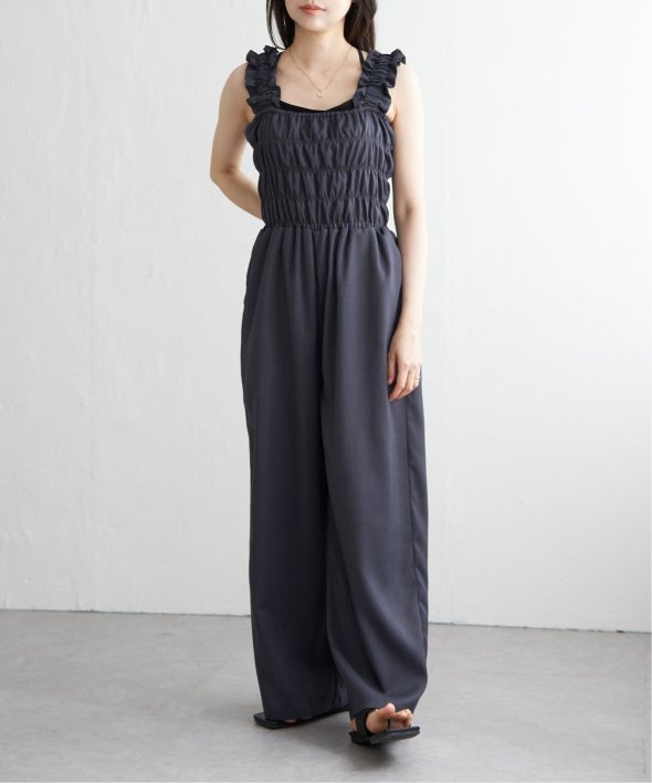 胸元にシャーリングを寄せた、メリハリのあるサロペット。