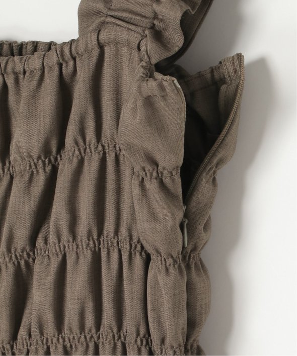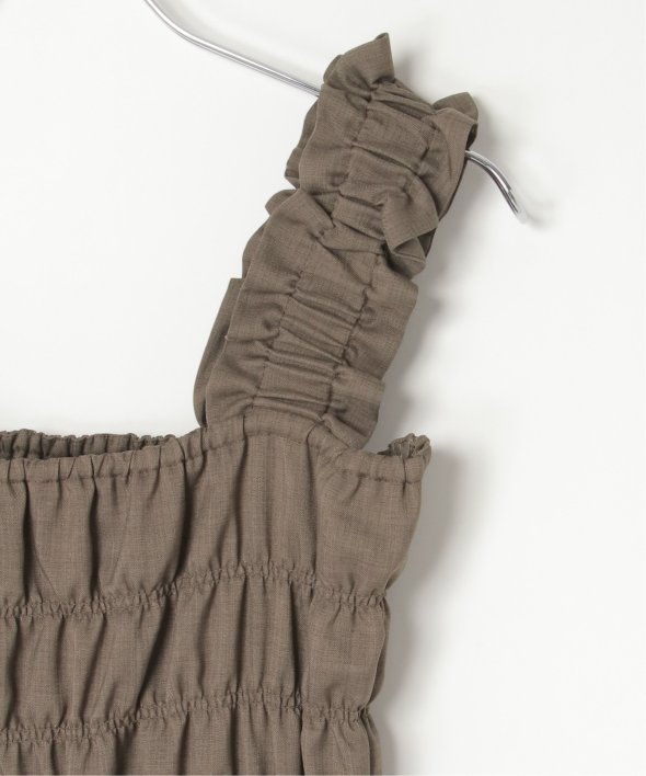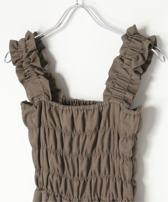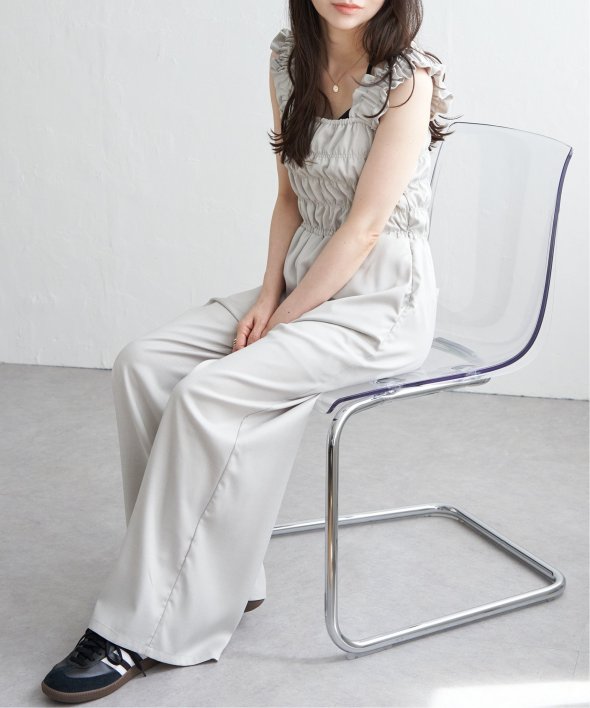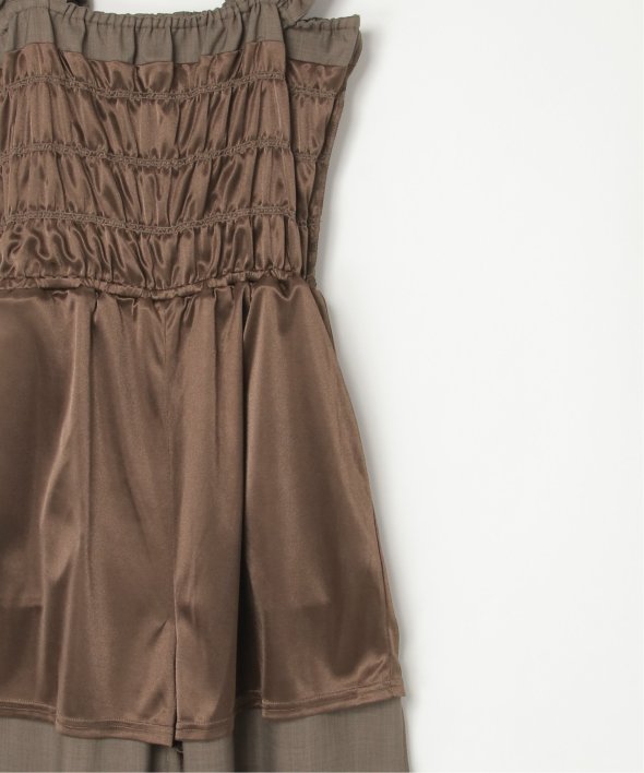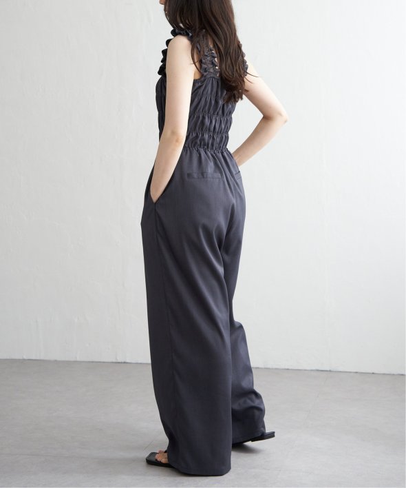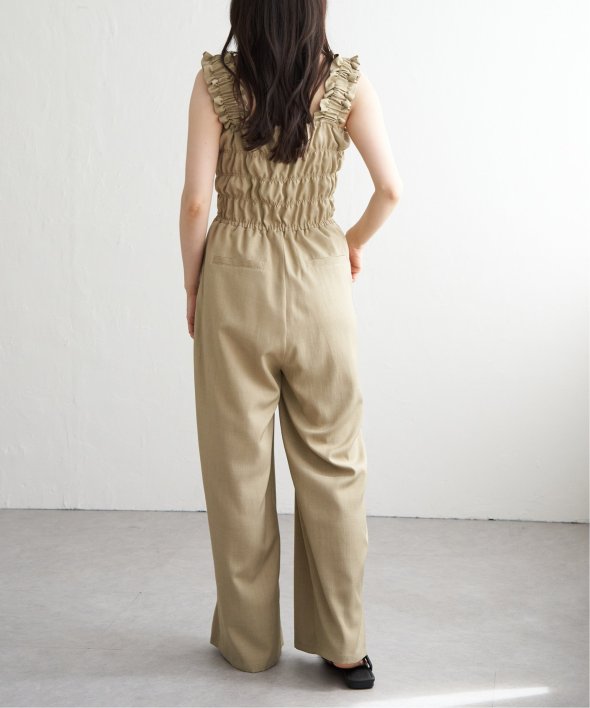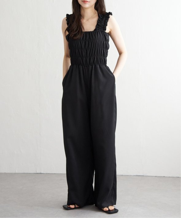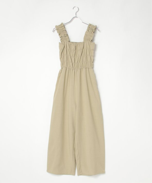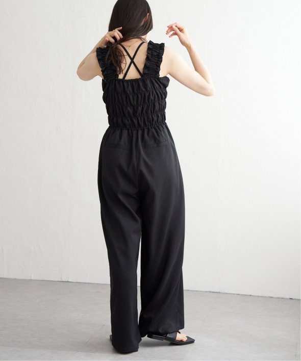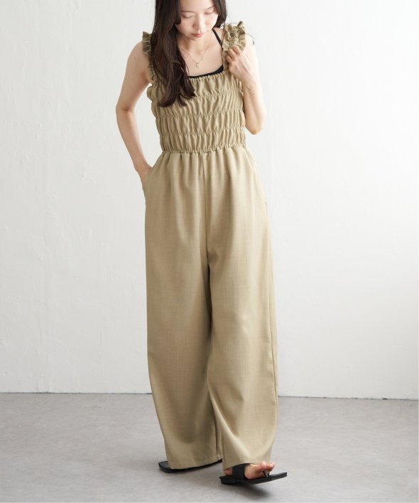 胸元にシャーリングを寄せた、メリハリのあるサロペット。
