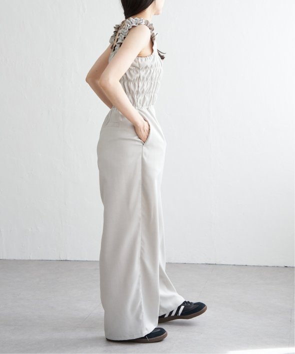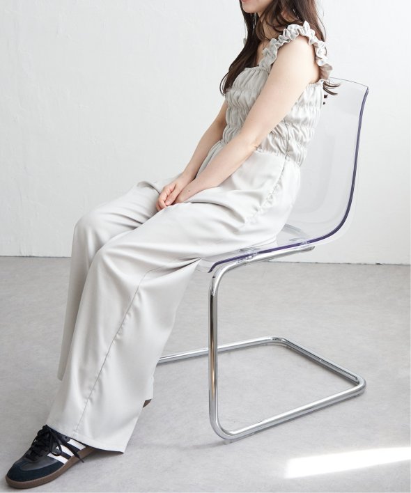 高めのウエスト位置でスタイルアップ効果もありつつ、ボトムはワイドシルエットでリラクシーな印象に。