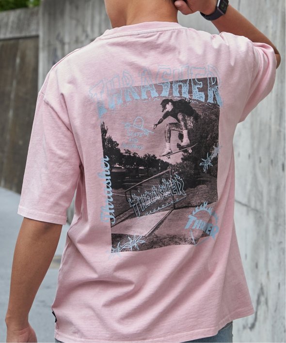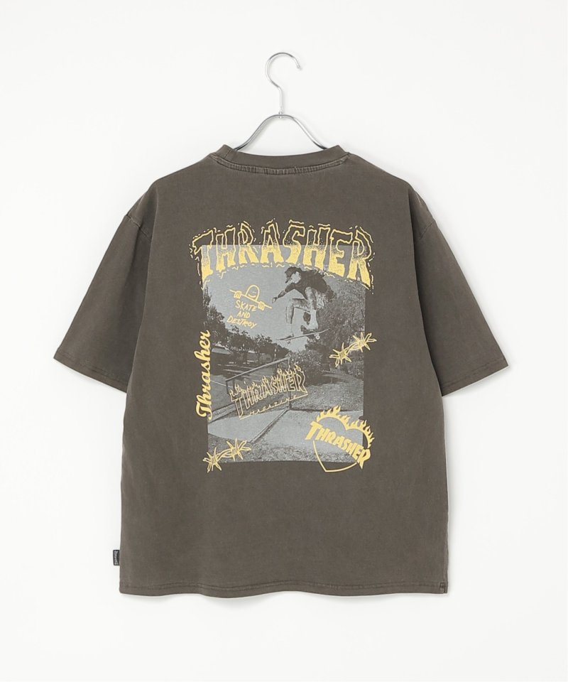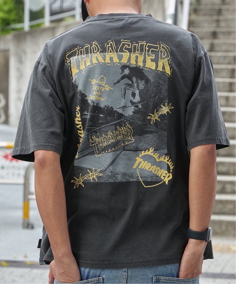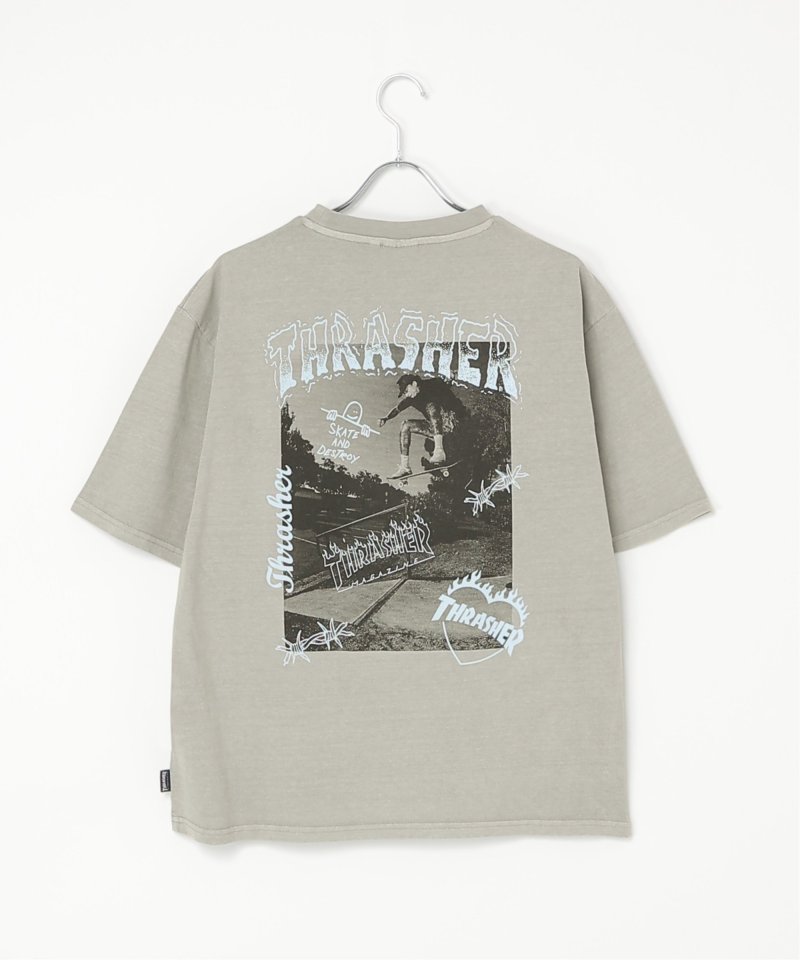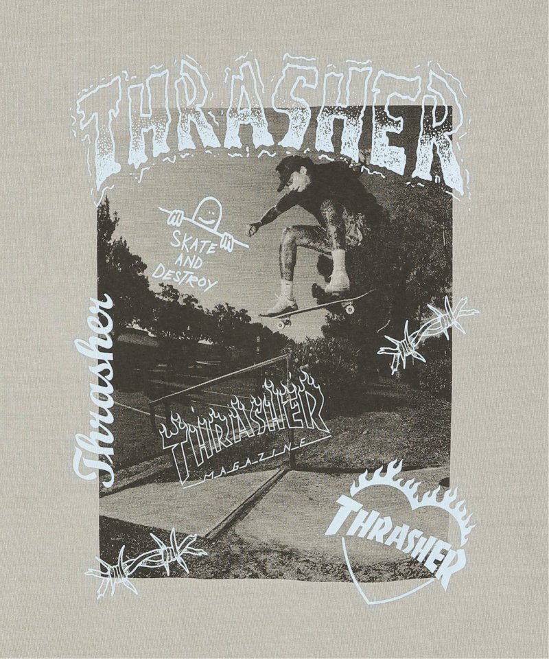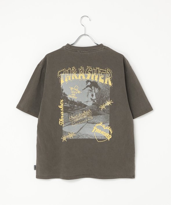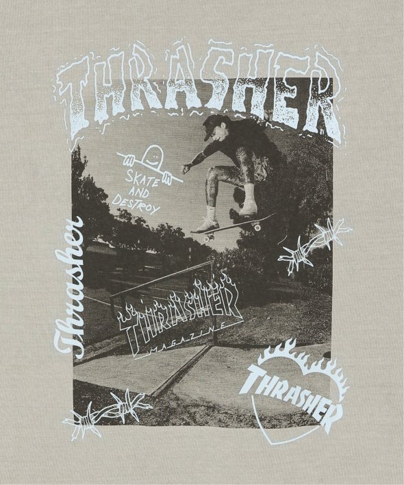 スケートボードのワンシーンを切り取ったフォトプリントに、「THRASHER/スラッシャー」らしい、遊び心のあるロゴモチーフを重ねたバックプリントが目を引くデザイン。