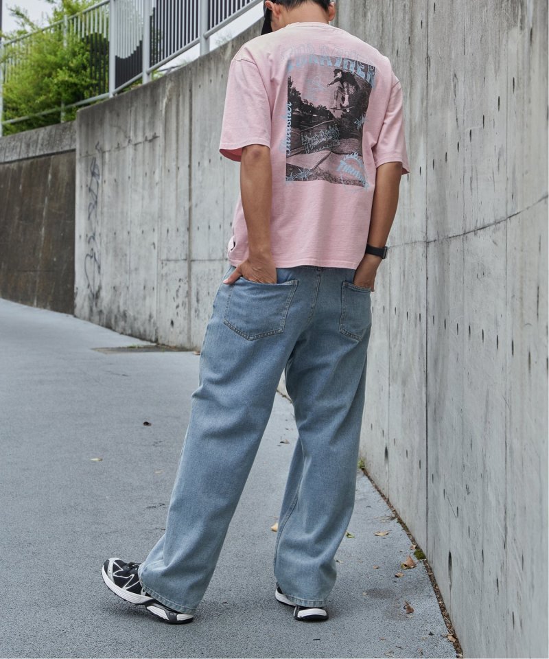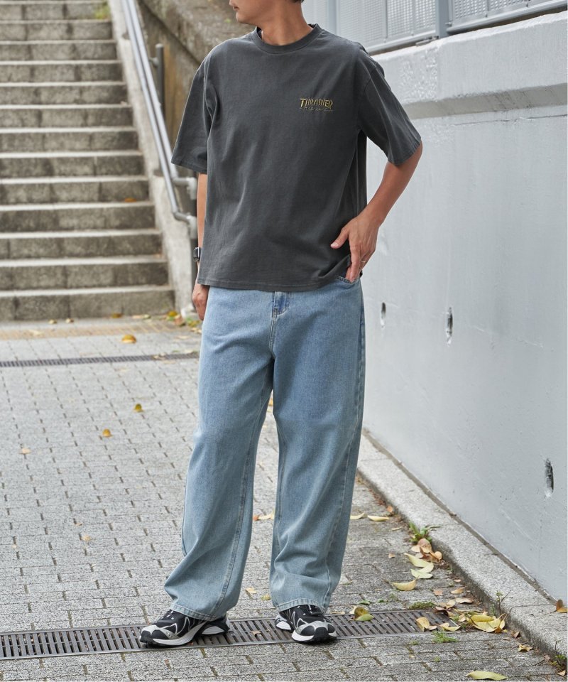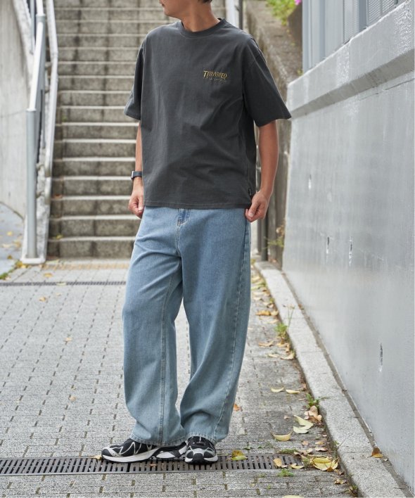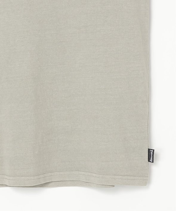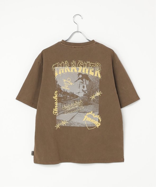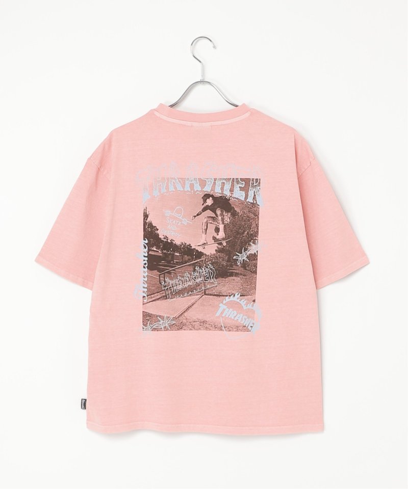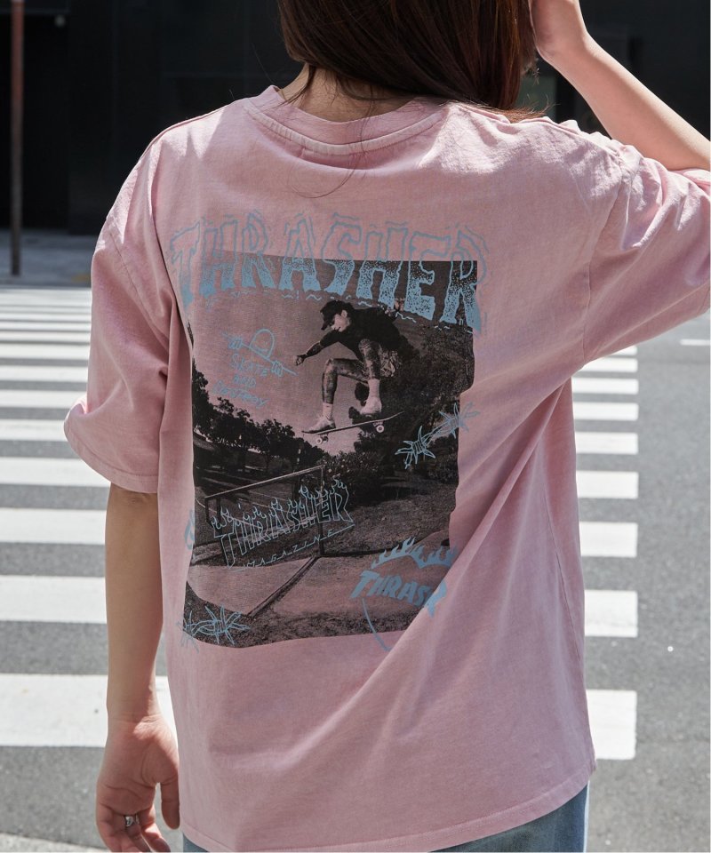 スケートボードのワンシーンを切り取ったフォトプリントに、「THRASHER/スラッシャー」らしい、遊び心のあるロゴモチーフを重ねたバックプリントが目を引くデザイン。