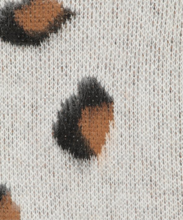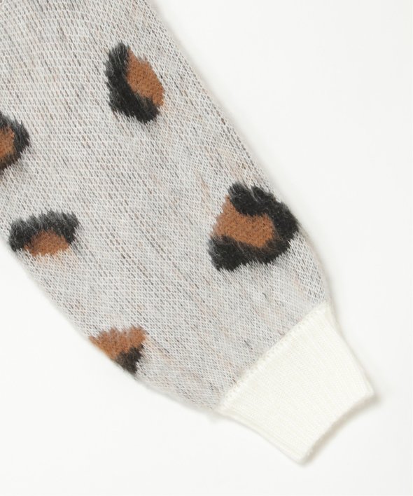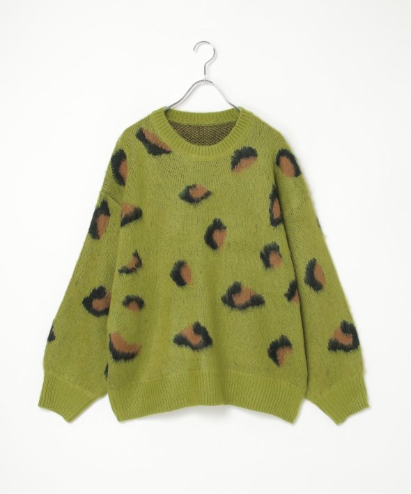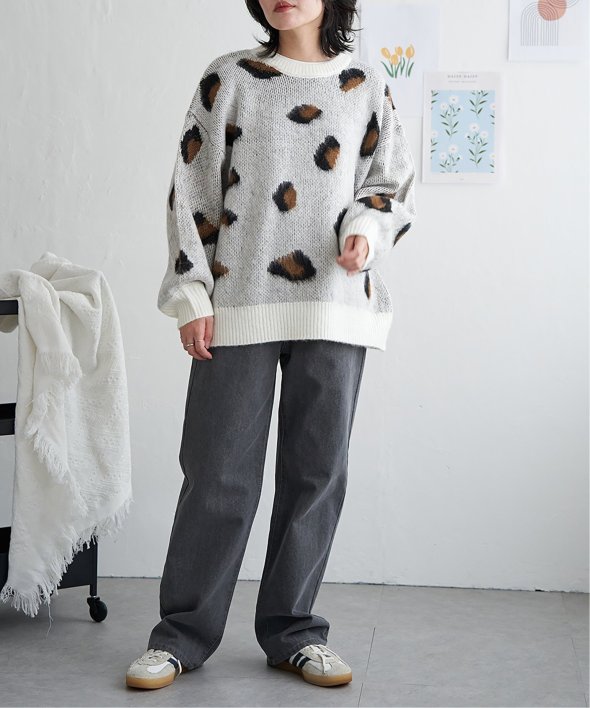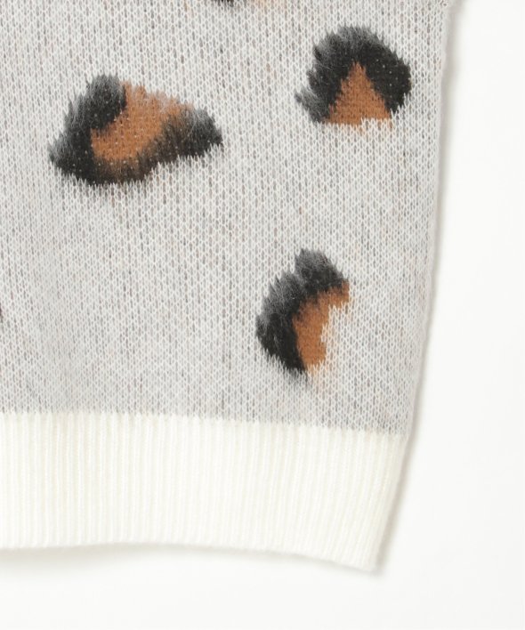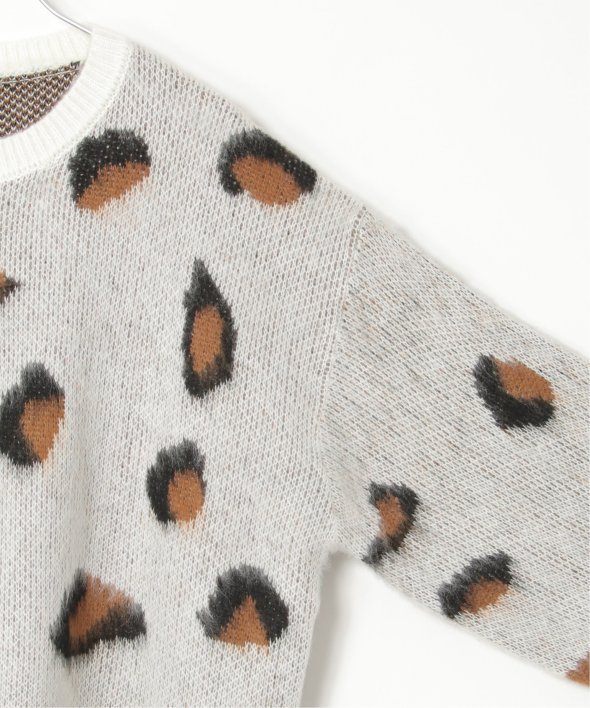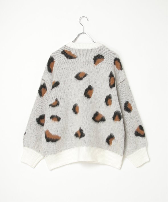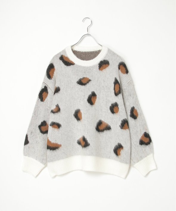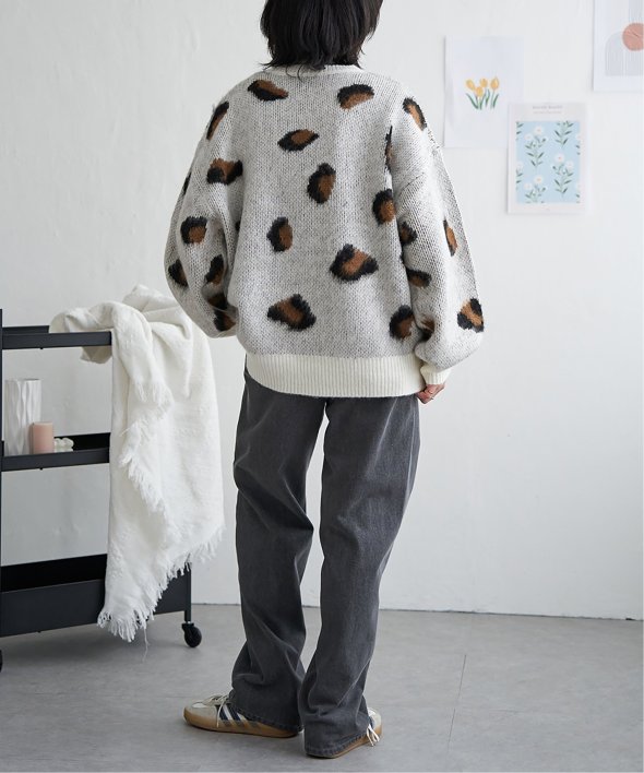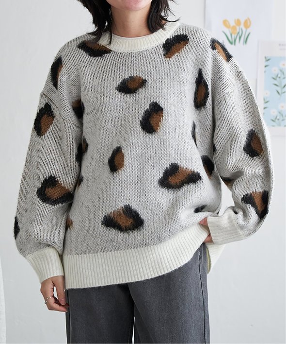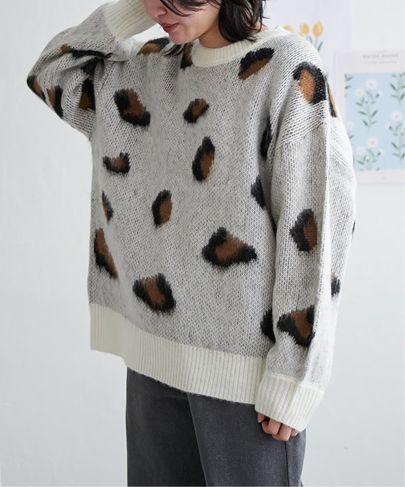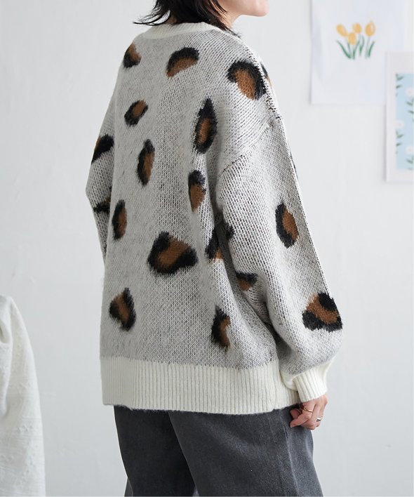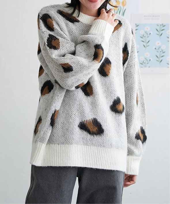 目を引くヒョウ柄のニットプルオーバー。