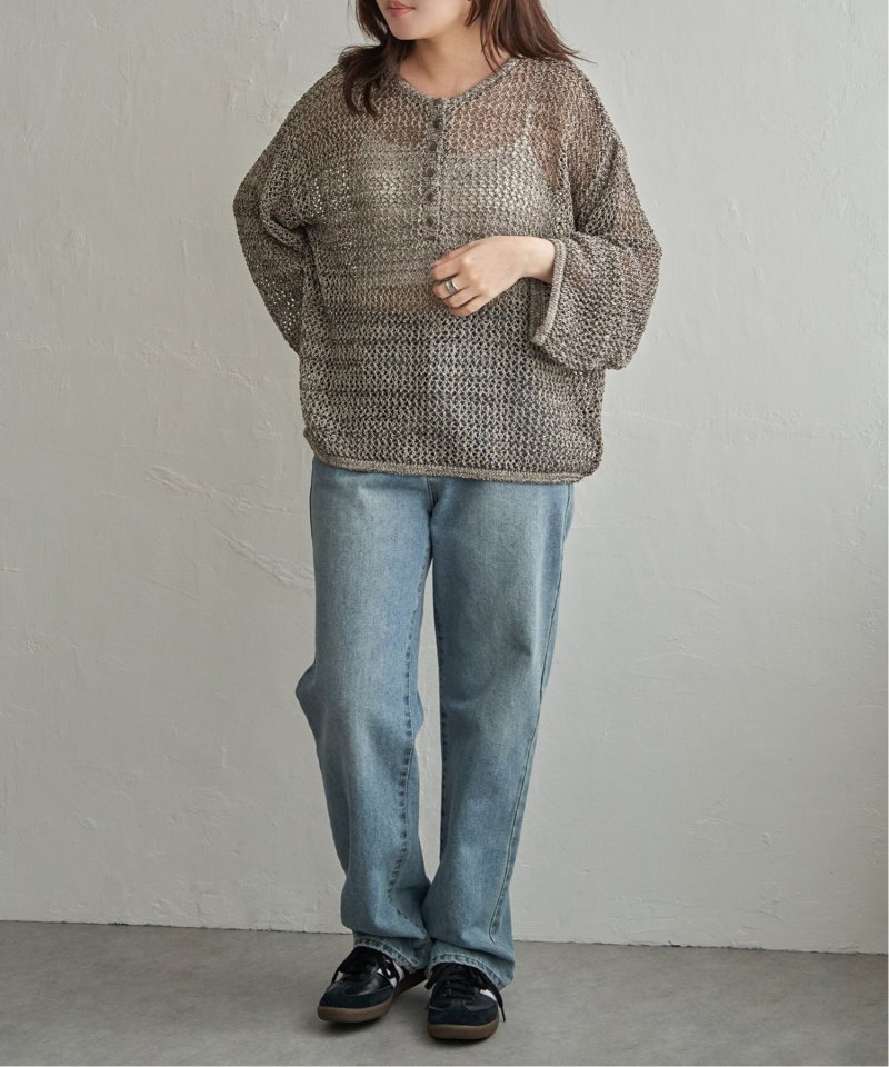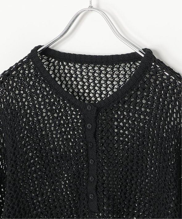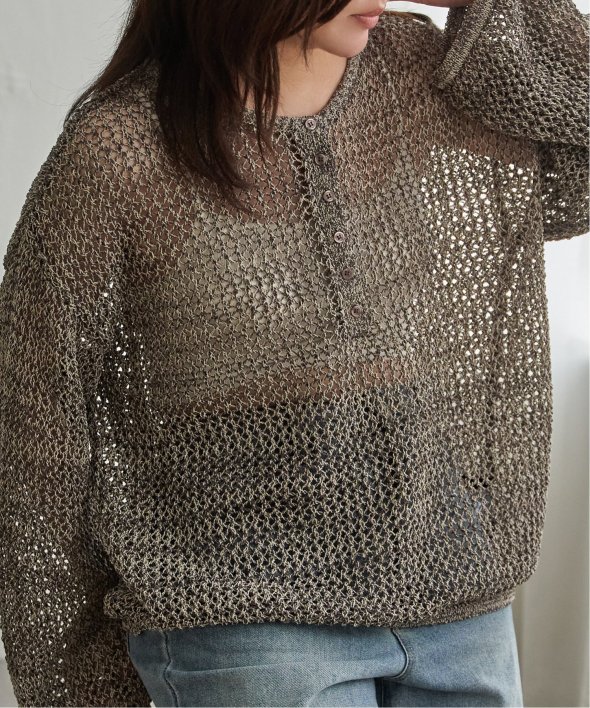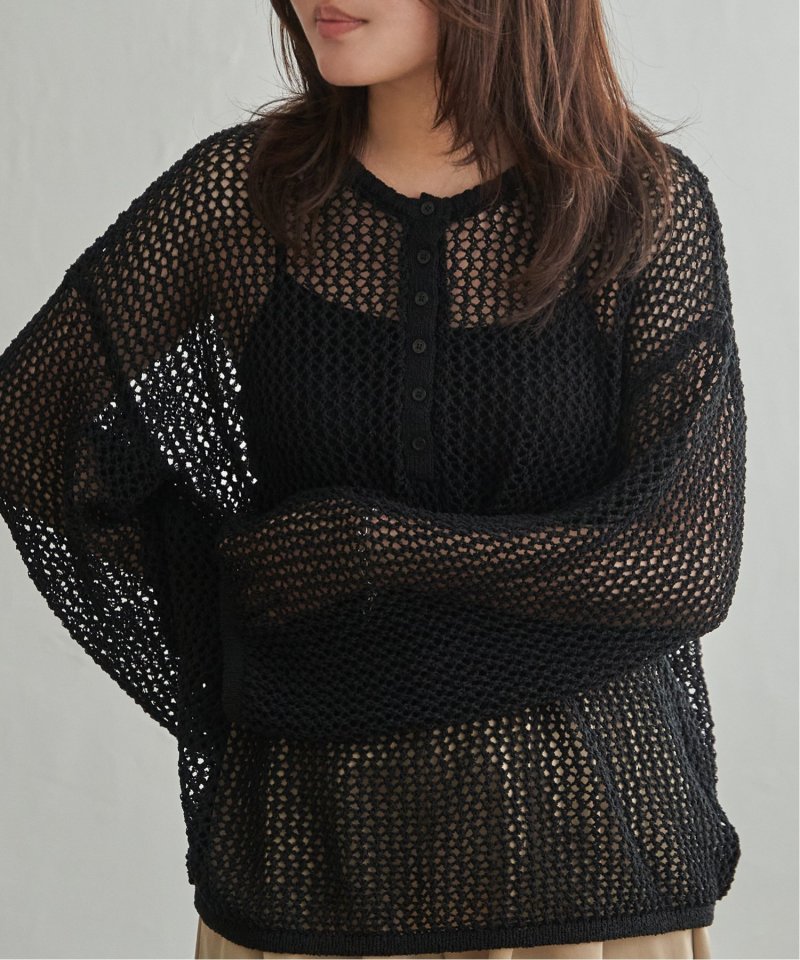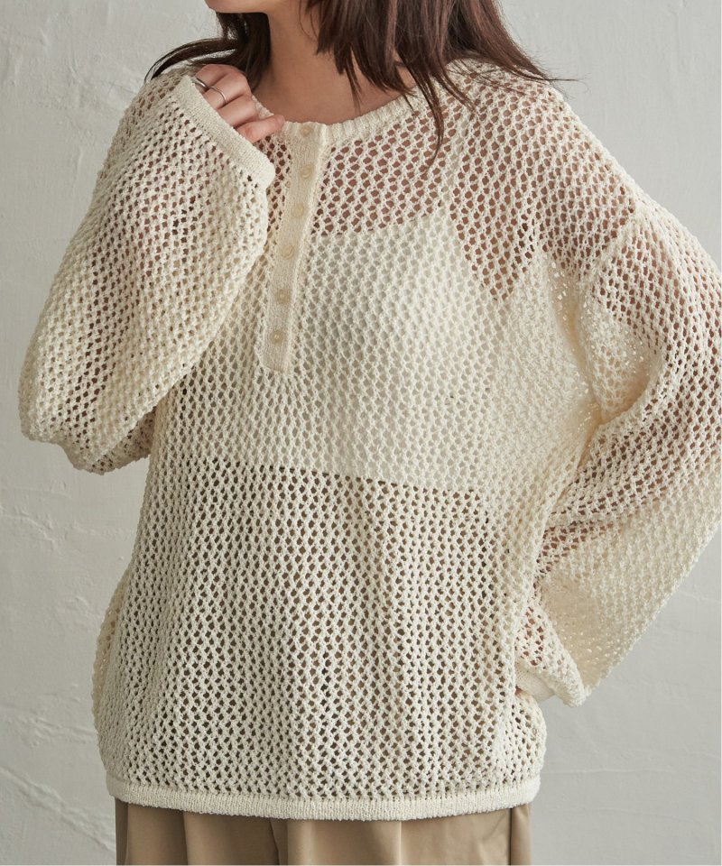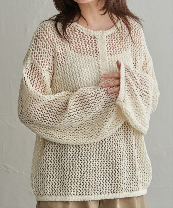 メッシュ編みの表情とヘンリーネックのデザインが重なり、シンプルながら雰囲気のあるプルオーバーです。
