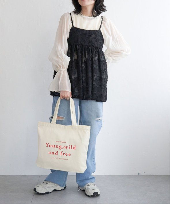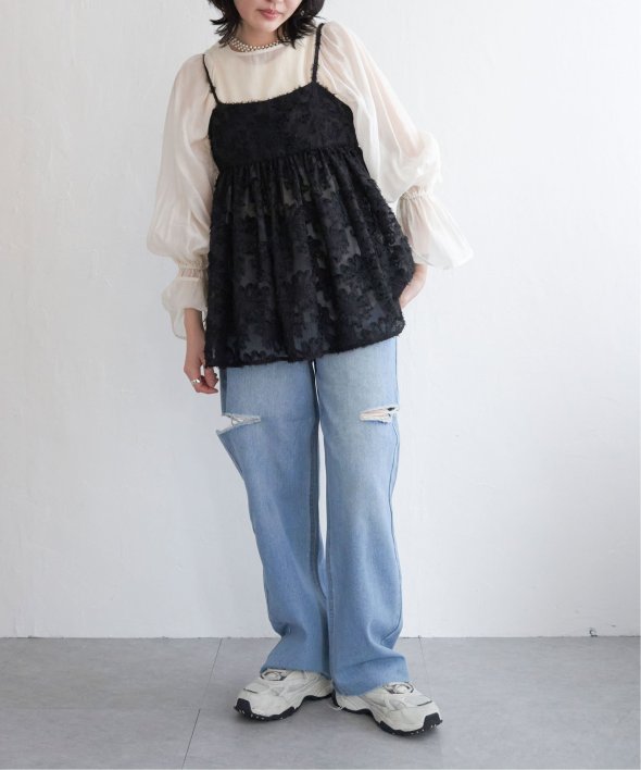 甘めのアイテムは、あえてデニムやカーゴパンツなどのカジュアルなボトムとレイヤードするのが合わせがおすすめです。